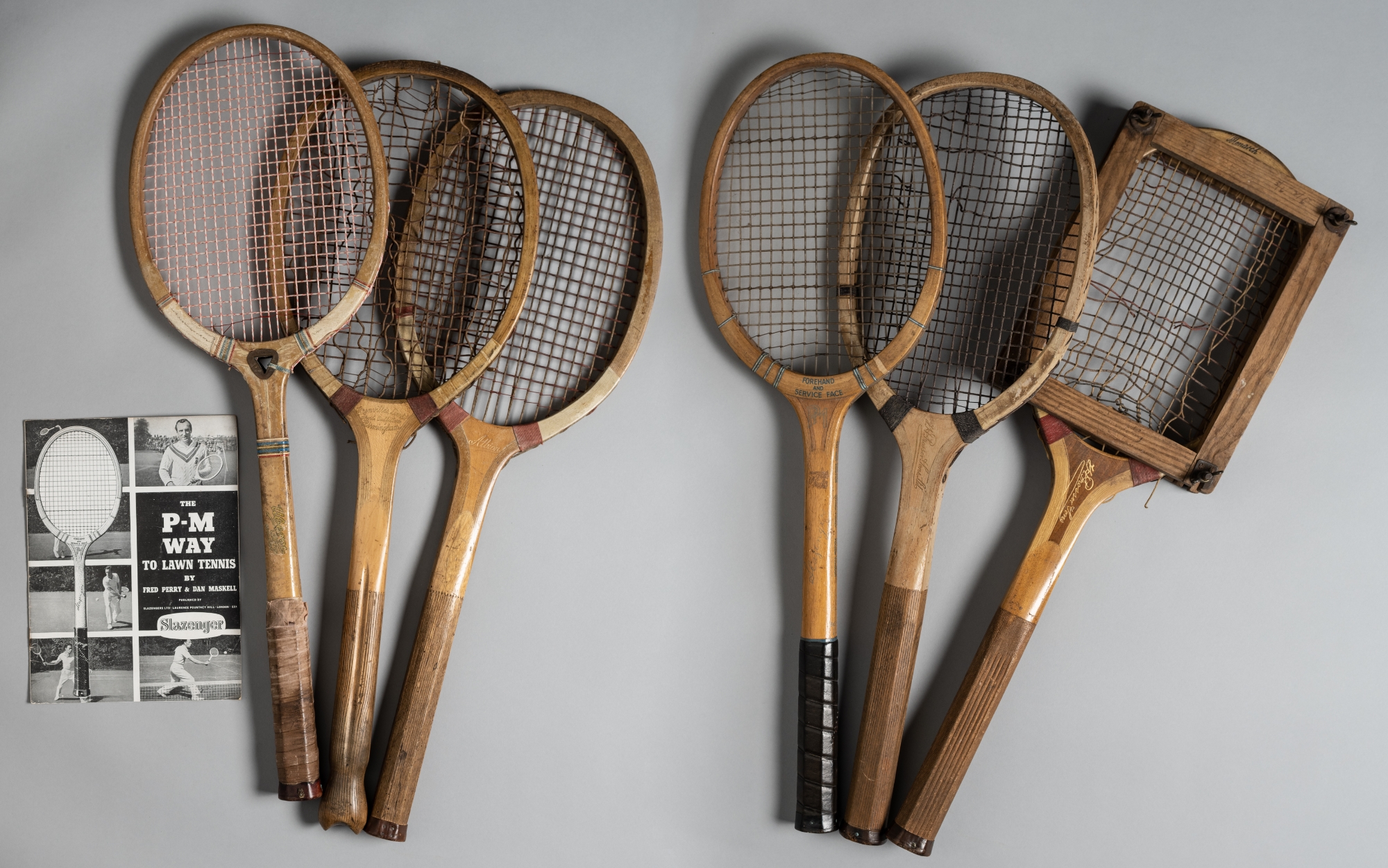 Six lawn tennis racquets, comprising TH Prosser & Sons fishtail concave wedge racquet, circa 1910, red shoulder wrapping, ridged handle, retailed by Granvilles Limited Sports Outfitters Birmingham, damage to stringing, length 68.5cm.; "Albion" wooden frame ridged handle racquet, circa 1900, red shoulder wrapping and leather butt, double mains stringing, length 68.5cm.; Uberois Ltd Sialkot, Pakistan wedgeless racquet, circa 1925-30s, distinctive hollow open triangle in throat, stamped U on butt, length 68.5cm.; TH Prosser & Sons Ltd wooden frame racquet, circa 1906, double main stringing, some broken, combed handle and leather butt, length 68cm.; TH Prosser & Sons "The Monarch" wooden double mains strung racquet, early 20th century, ridged handle, leather butt with TH Prosser & Sons "The Perfect" press, damage to strings, length 69.5cm.; Slazenger P-M wooden racquet, circa 1937, leather covered handle and leather butt with Slazenger logo, length 68.5cm. with "The P-M Way to lawn tennis by Fred Perry & Dan Maskell 16-page booklet, bearing some wear and pencil annotations, rusty staples, (7)