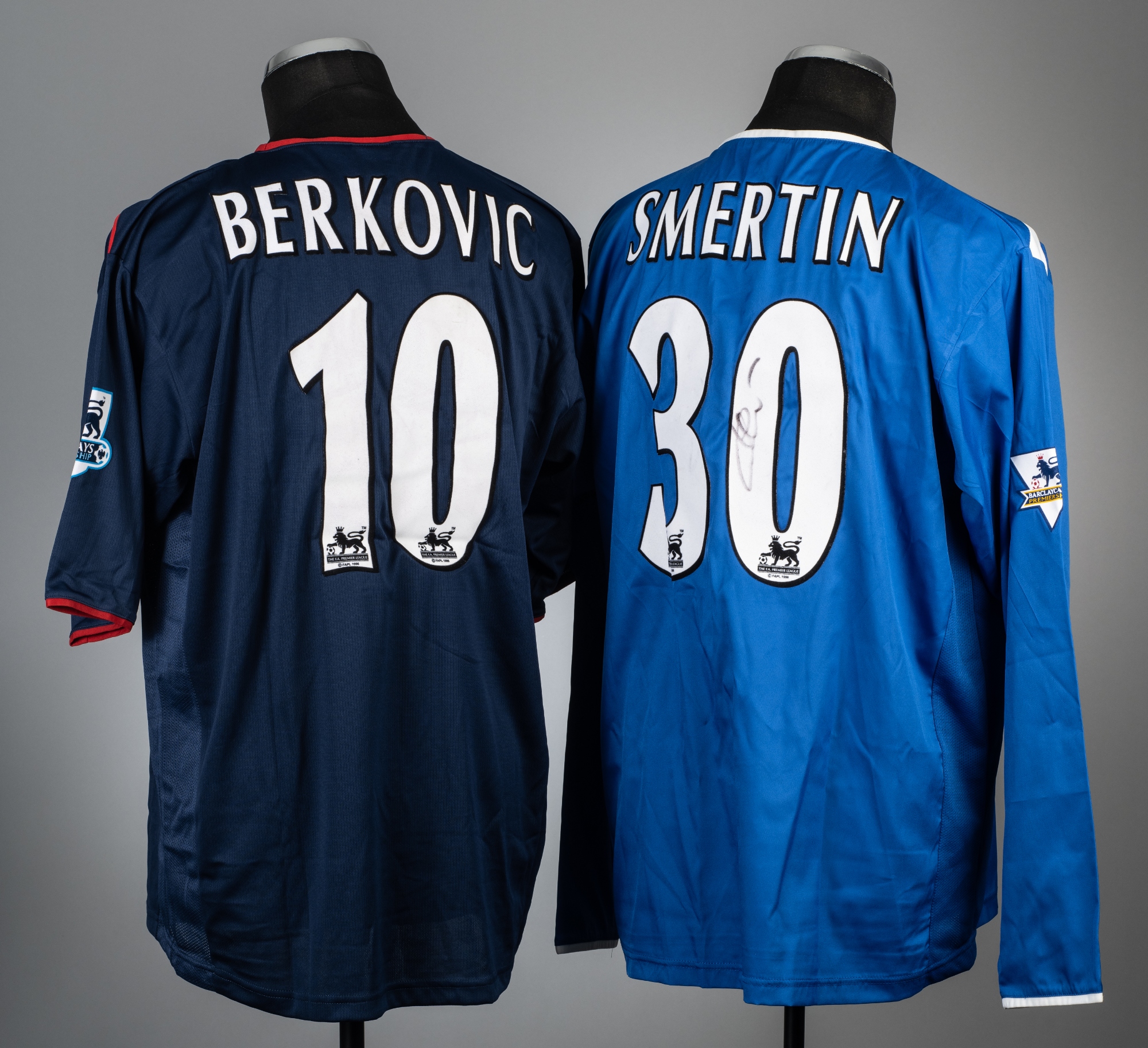 Two Portsmouth football jerseys, comprising Alexey Smertin signed blue no.30 jersey, season 2003-04, Pompey Sport, long-sleeved with BARCLAYCARD PREMIERSHIP sleeve badges, club crest and sponsor logo, reverse lettered SMERTIN, signed to number zero in black marker pen, size L and Eyal Berkovic navy no.10 jersey, season 2004-05, Pompey Sport, short-sleeved with BARCLAYS PREMIERSHIP sleeve badges, club crest and sponsor logo, reverse lettered BERKOVIC, size L, (2)