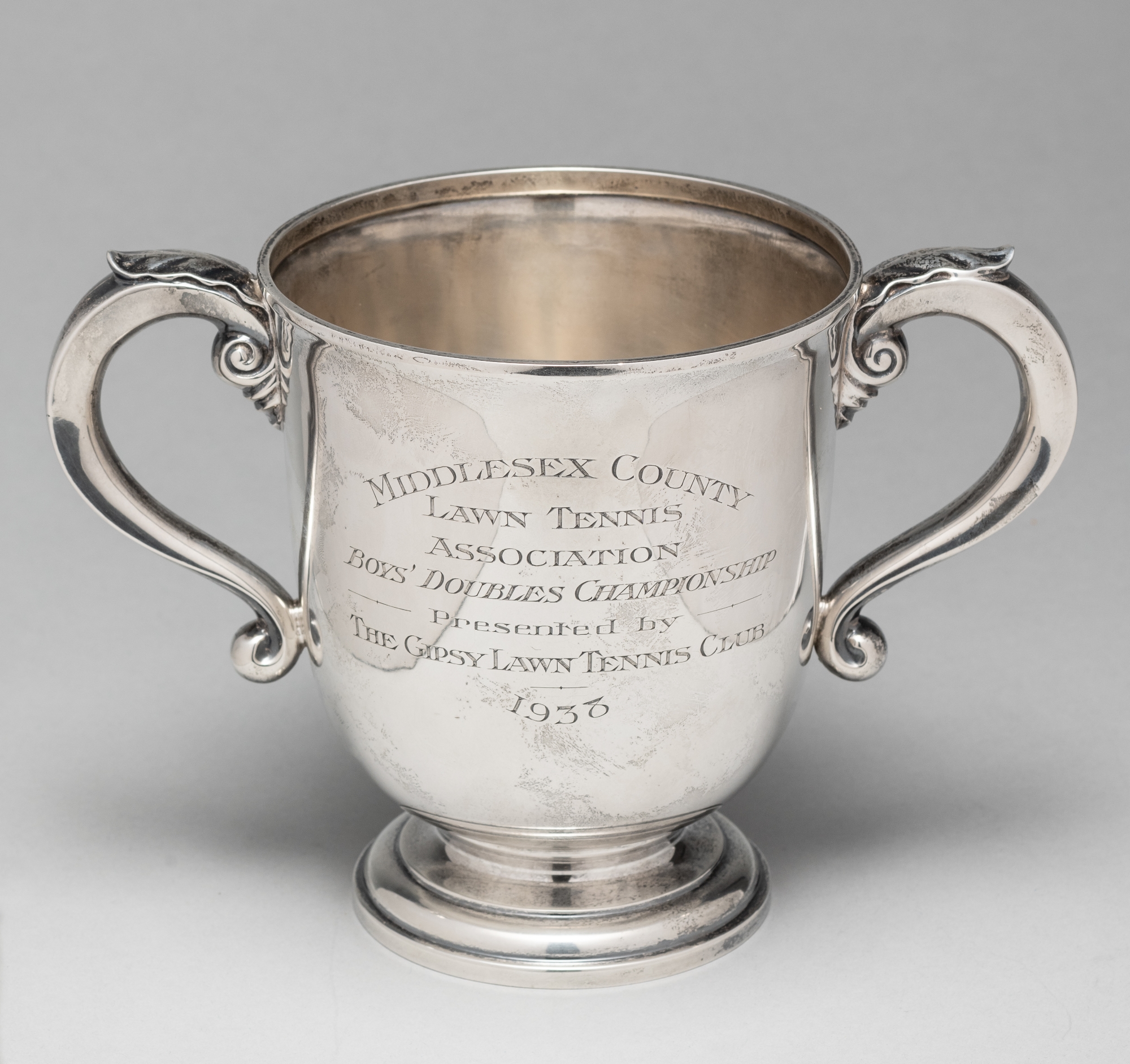 Large silver trophy cup Middlesex Boys’ Doubles trophy cup with Fred Perry listed as a winner, presented by The Gypsy Lawn Tennis Club, a large and much respected Tennis Club in South London, in 1938. It lists all the previous winners from 1924 to 1938. F.J. Perry was not always a world beater but in 1926 along with H. Melhuish he was victorious and just a few years later would become Wimbledon Champion, fully hallmarked for London 1937 15 by 22cm., 560gms.