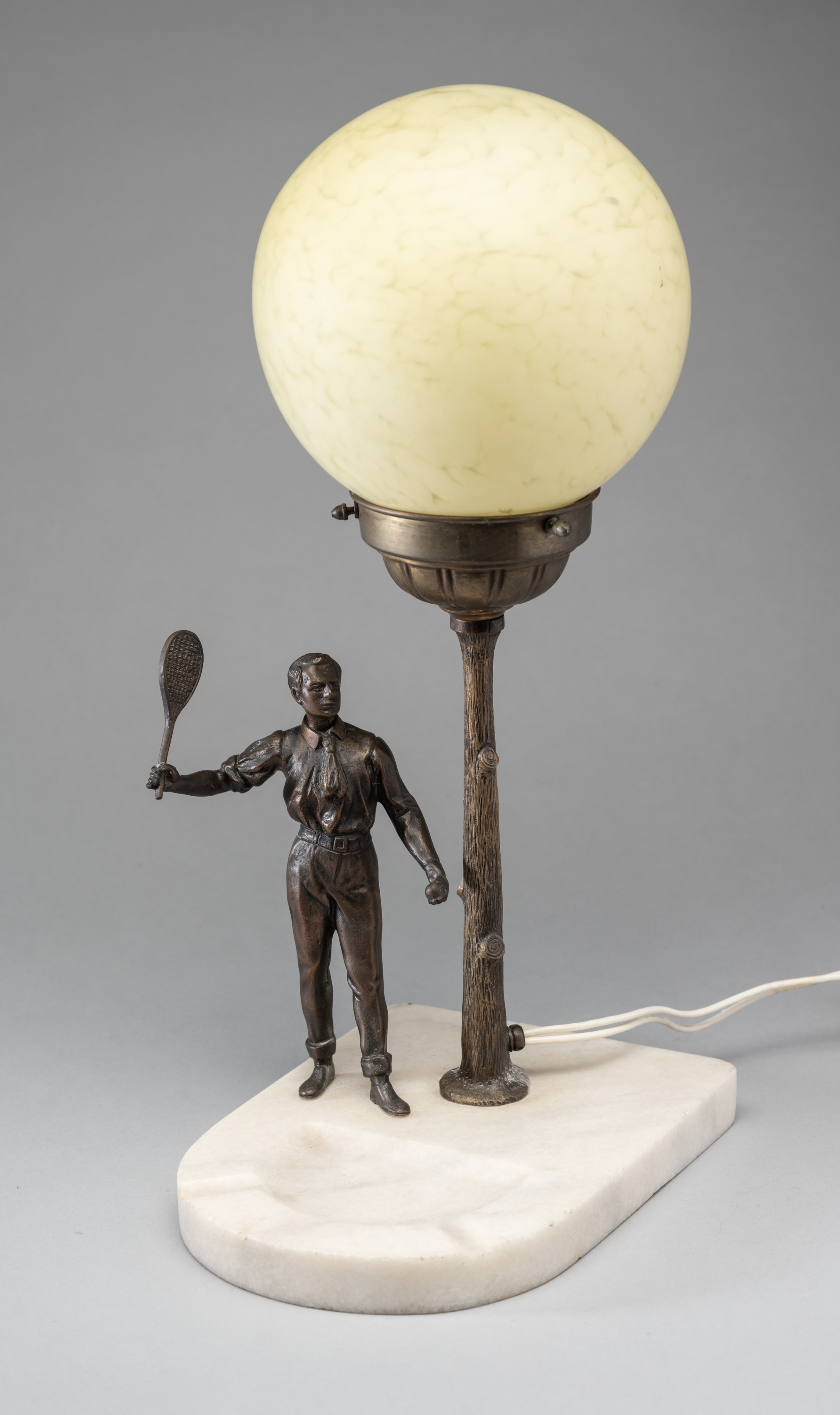 An early tennis lamp, circa 1920, with spelter tennis figure, stand and marble base, 40 by 22 by 14cm., the glass sphere has a diameter of 15cm.