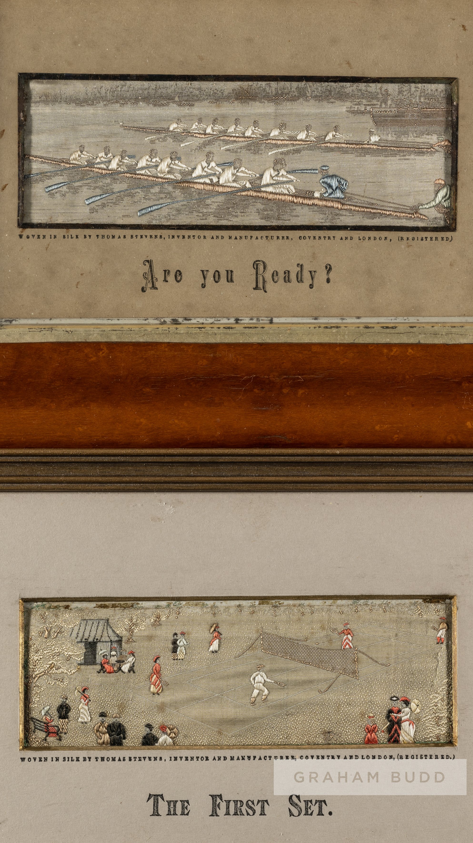 Two sporting stevengraphs, for tennis and Oxford v Cambridge rowing, circa late 19th century, comprising "The First Set" featuring a tennis match, wo