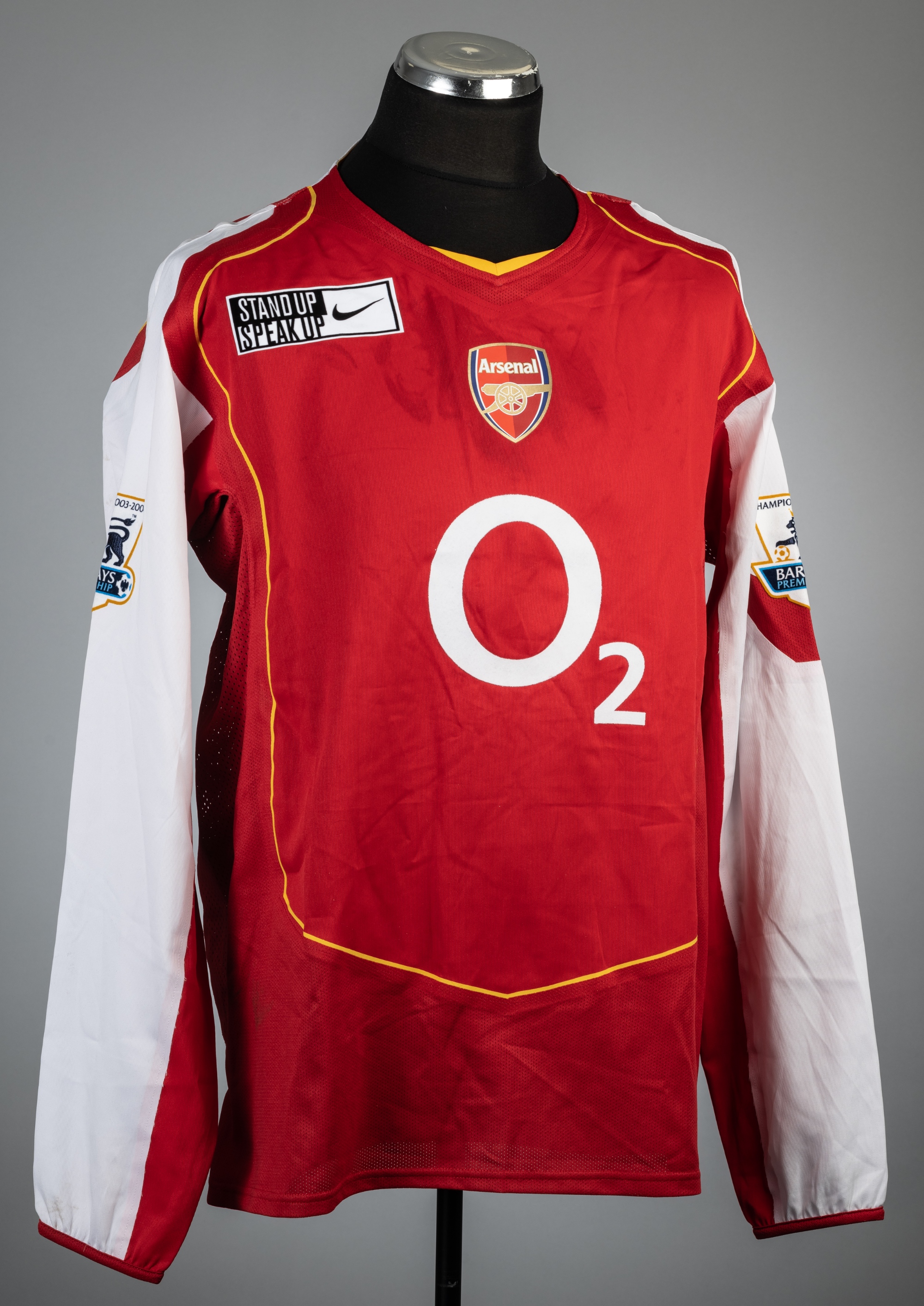 Patrick Vieira red Arsenal no.4 home jersey worn v Manchester United at Highbury, 1st February 2005, the match remembered for the famous tunnel incident with Roy Keane before kick-off, Nike, long-sleeved with BARCLAYS PREMIER LEAGUE CHAMPIONS 2003-2004 sleeve badges, club crest, STAND UP SPEAK UP badge, sponsor logo, reverse lettered VIEIRA, size XL, bearing pitch stains/marks on sleeves Manchester United defeated Arsenal 4-2, with Patrick Vieira scoring the first goal of the fixture in the 8th minute, this fixture was famous due to the tunnel bust up between Patrick Vieira and Roy Keane.