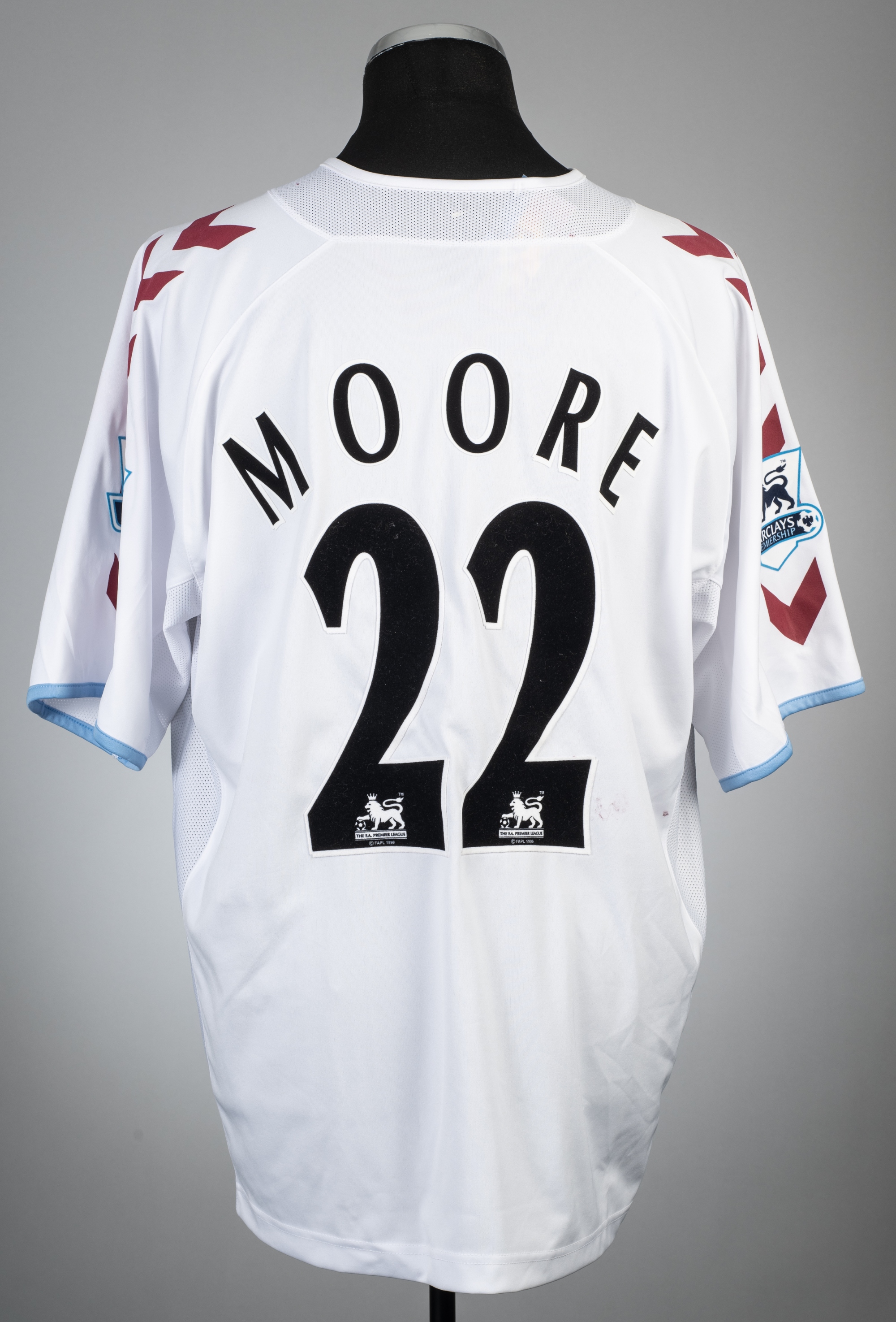 Luke Moore white Aston Villa no.22 away jersey, season 2004-05, Hummel, short-sleeved with BARCLAYS PREMIER LEAGUE sleeve badges, club crest and sponsor logo, reverse lettered MOORE, one size, bears retail tag