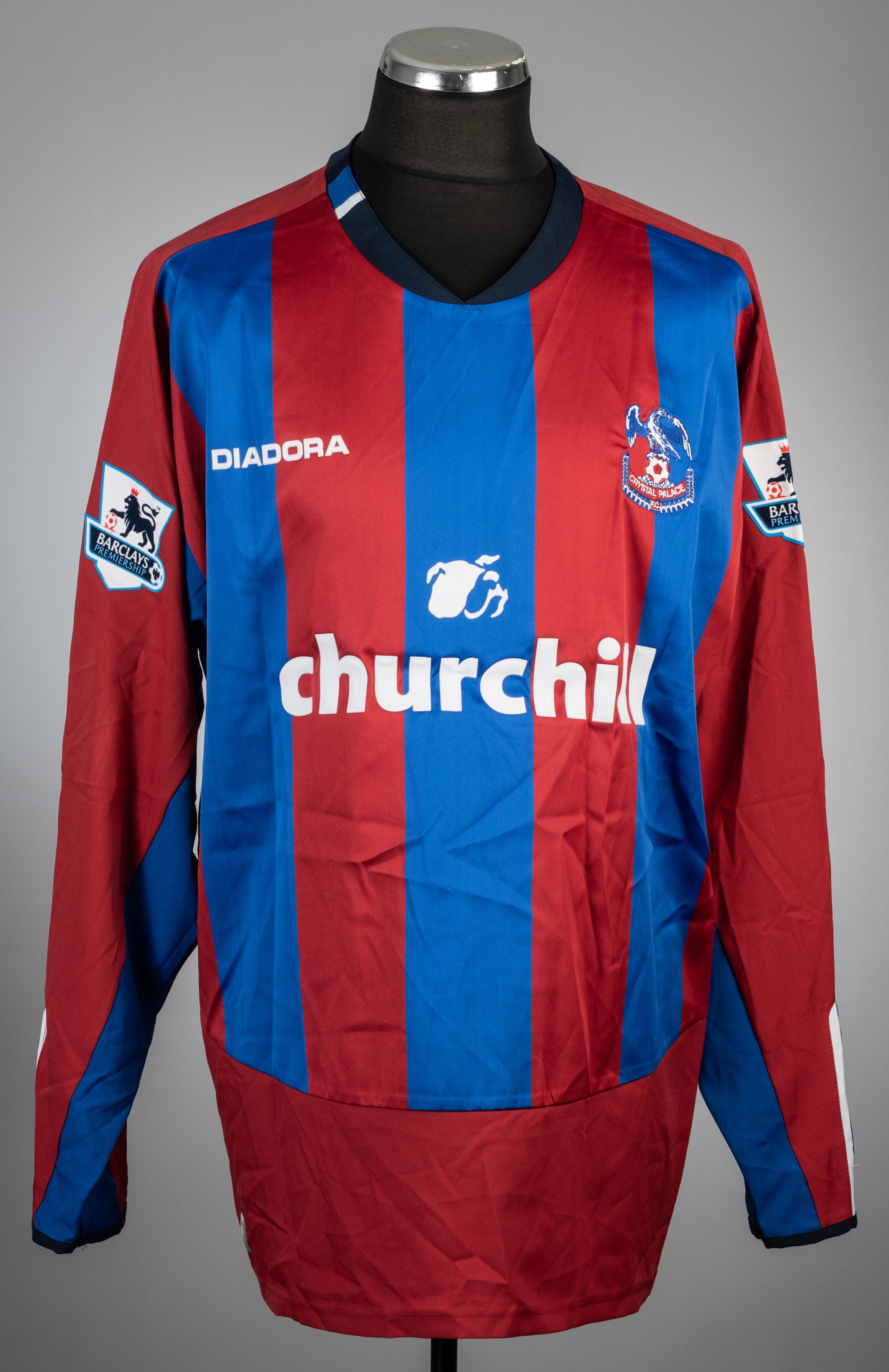 Danny Granville red and blue Crystal Palace no.3 home jersey, season 2004-05, Diadora, long-sleeved with BARCLAYS PREMIERSHIP sleeve badges, club crest and sponsor logo, reverse lettered GRANVILLE, size XL
