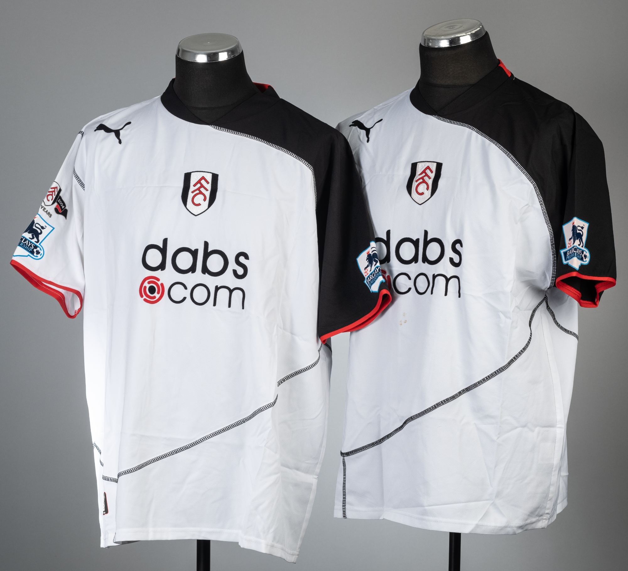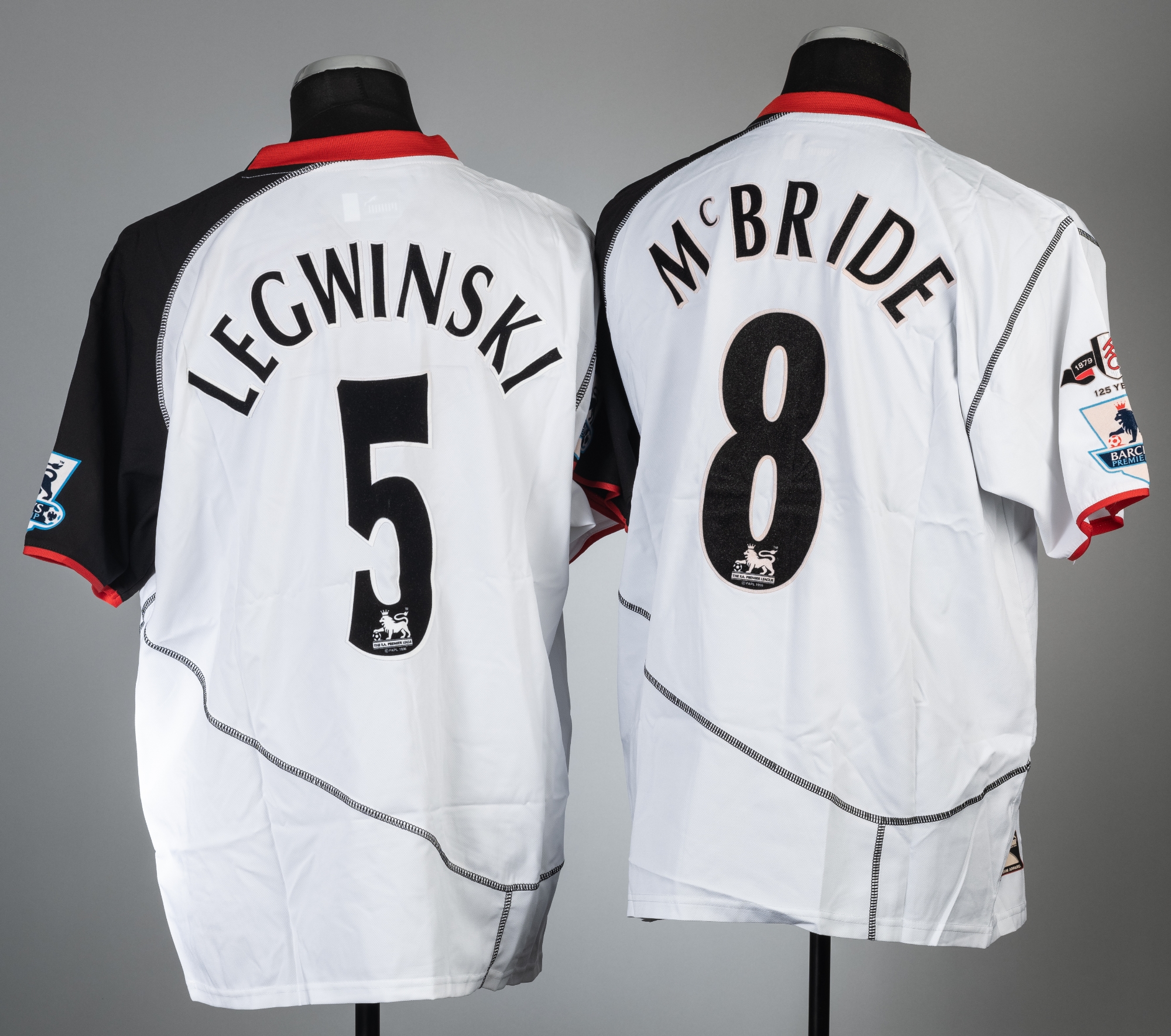 Two Fulham football jerseys, season 2004-05, comprising Sylvain Legwinski white Fulham no.5 home jersey, season 2004-05 Puma, short-sleeved with BARCLAYS PREMIERSHIP sleeve badges, club crest and sponsor logo, reverse lettered LEGWINSKI, size XL and Brian McBride white Fulham home jersey, season 2004-05, Puma, short-sleeved with BARCLAYS PREMIER LEAGUE sleeve badges, club crest and sponsor logo, reverse lettered McBRIDE, size L, bears some stains to front, white is discoloured, (2)