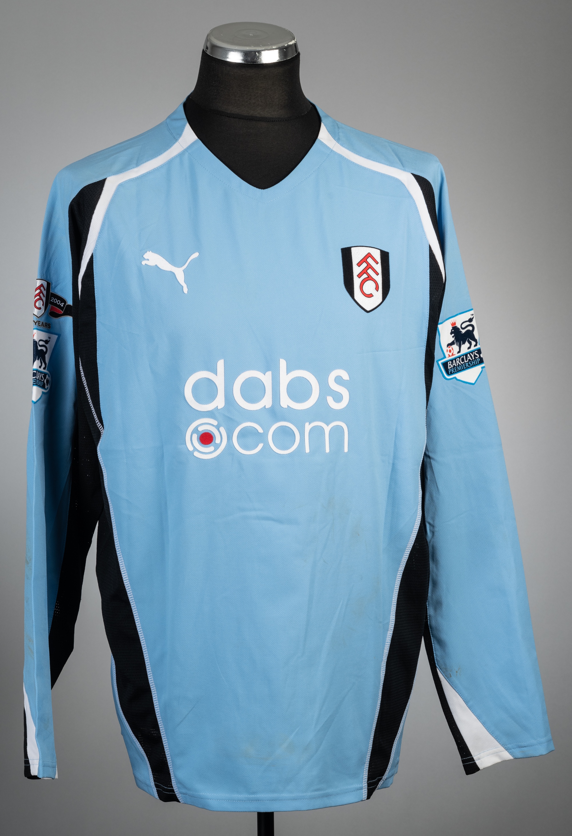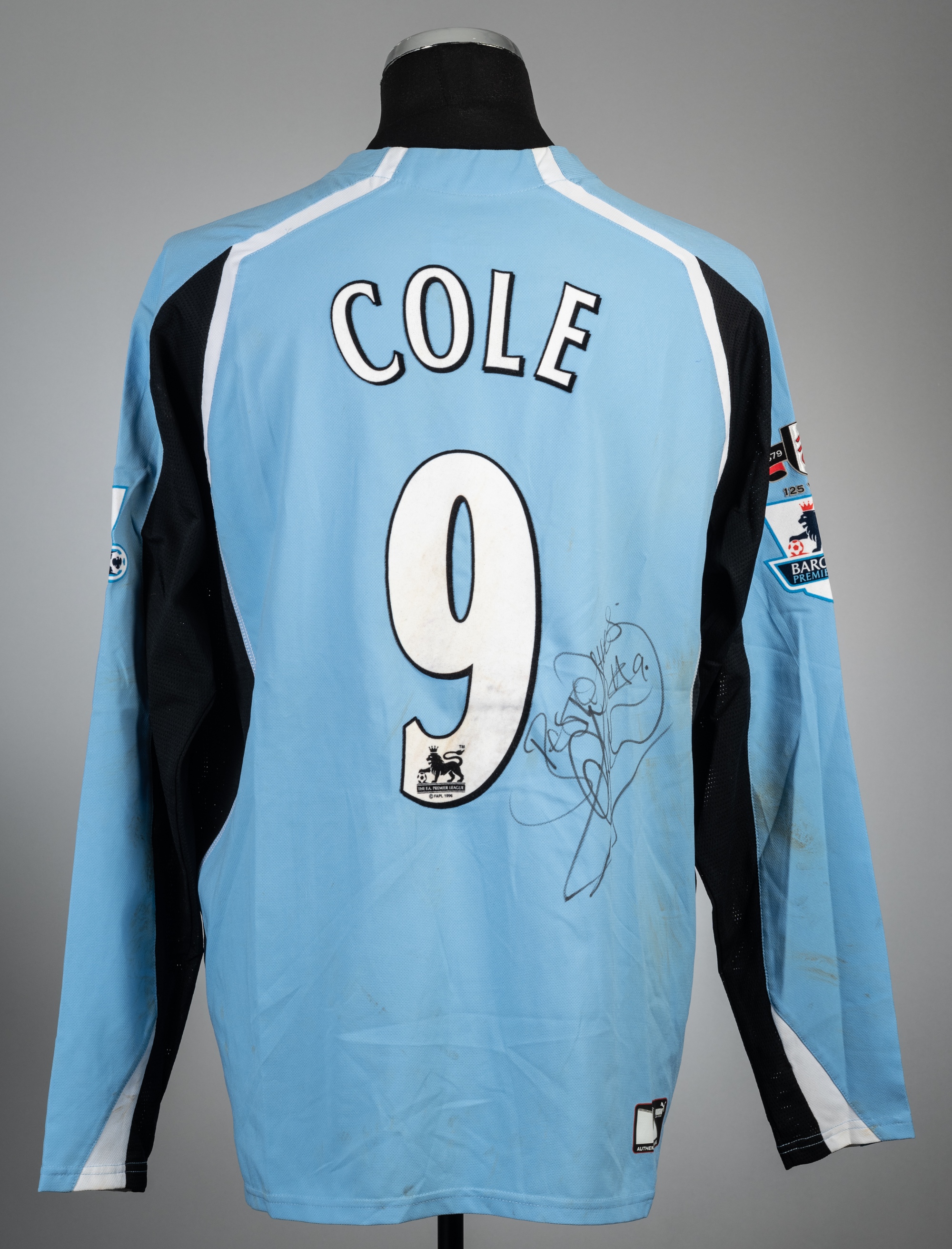Andy Cole signed blue and black Fulham 125 Years no.9 away jersey, season 2004-05, Puma, long-sleeved with BARCLAYS PREMIERSHIP sleeve badges, club crest and sponsor logo, reverse lettered COLE, signed in black marker pen on reverse, size XL, bear pitch marks on reverse and sleeves