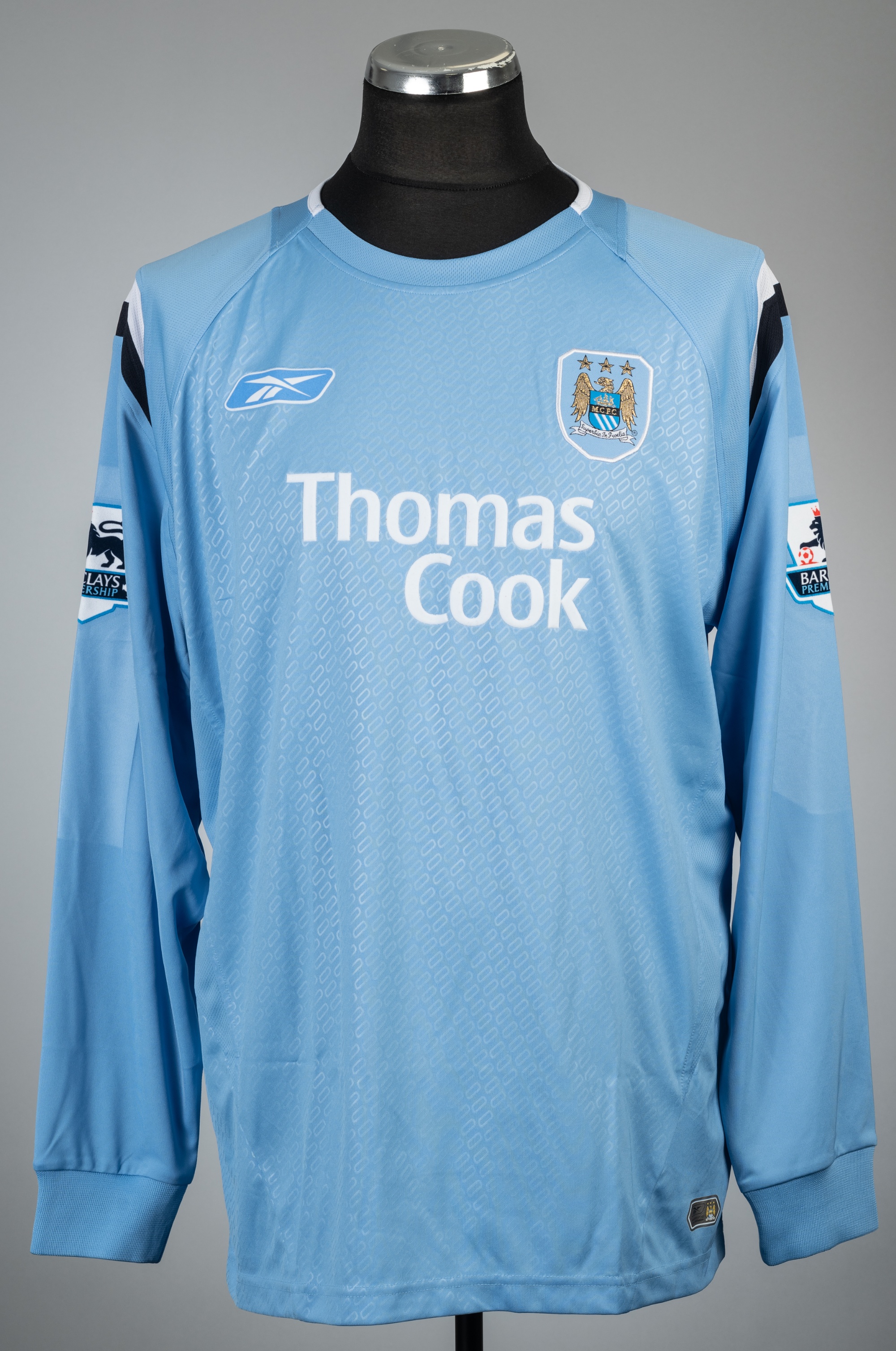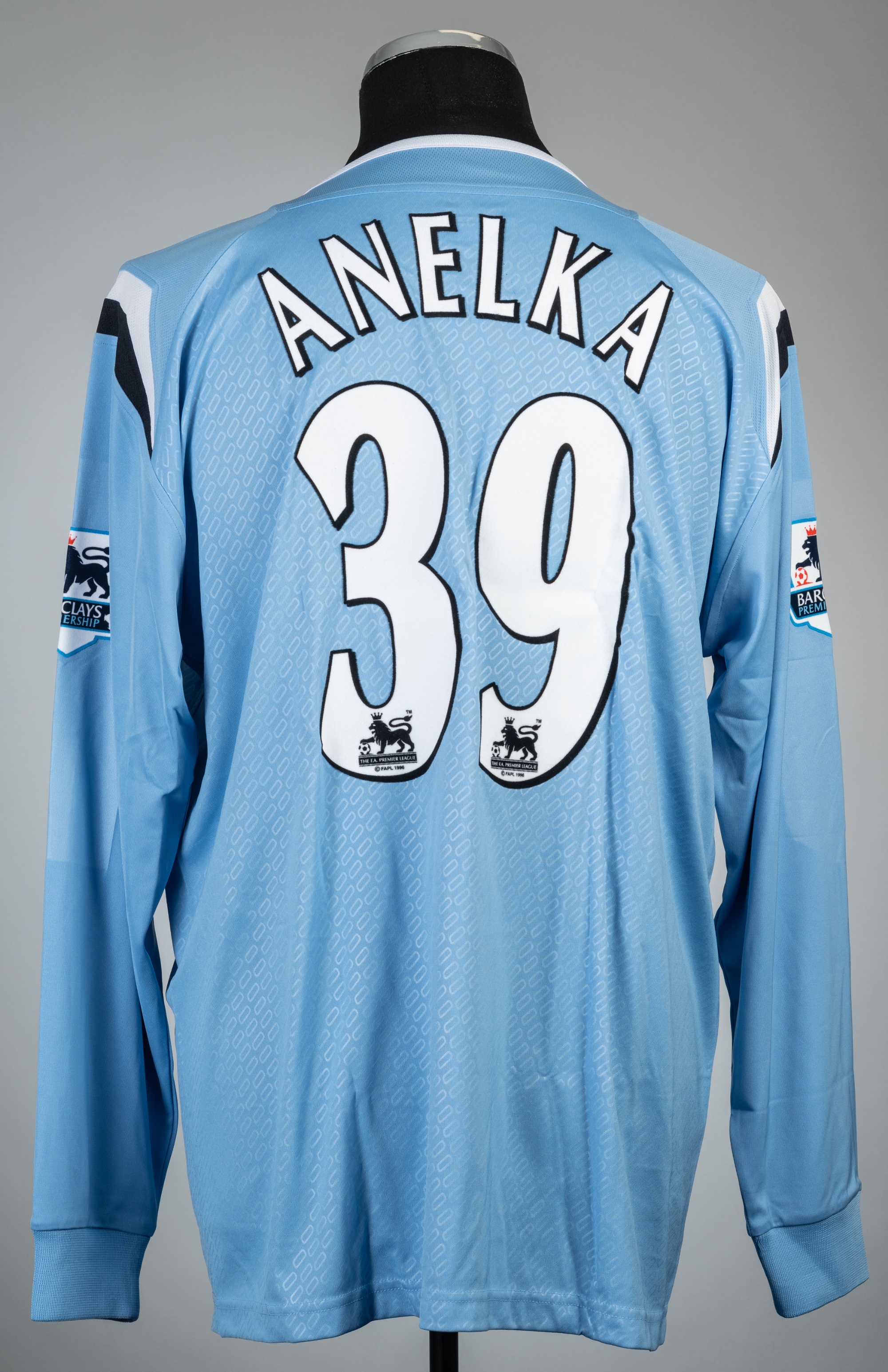 Nicolas Anelka blue Manchester City no.39 home jersey, season 2004-05, Reebok, long-sleeved with BARCLAYS PREMIER LEAGUE sleeve badges, club crest and sponsor logo, reverse lettered ANELKA, bearing K in black marker pen on neck label, size L