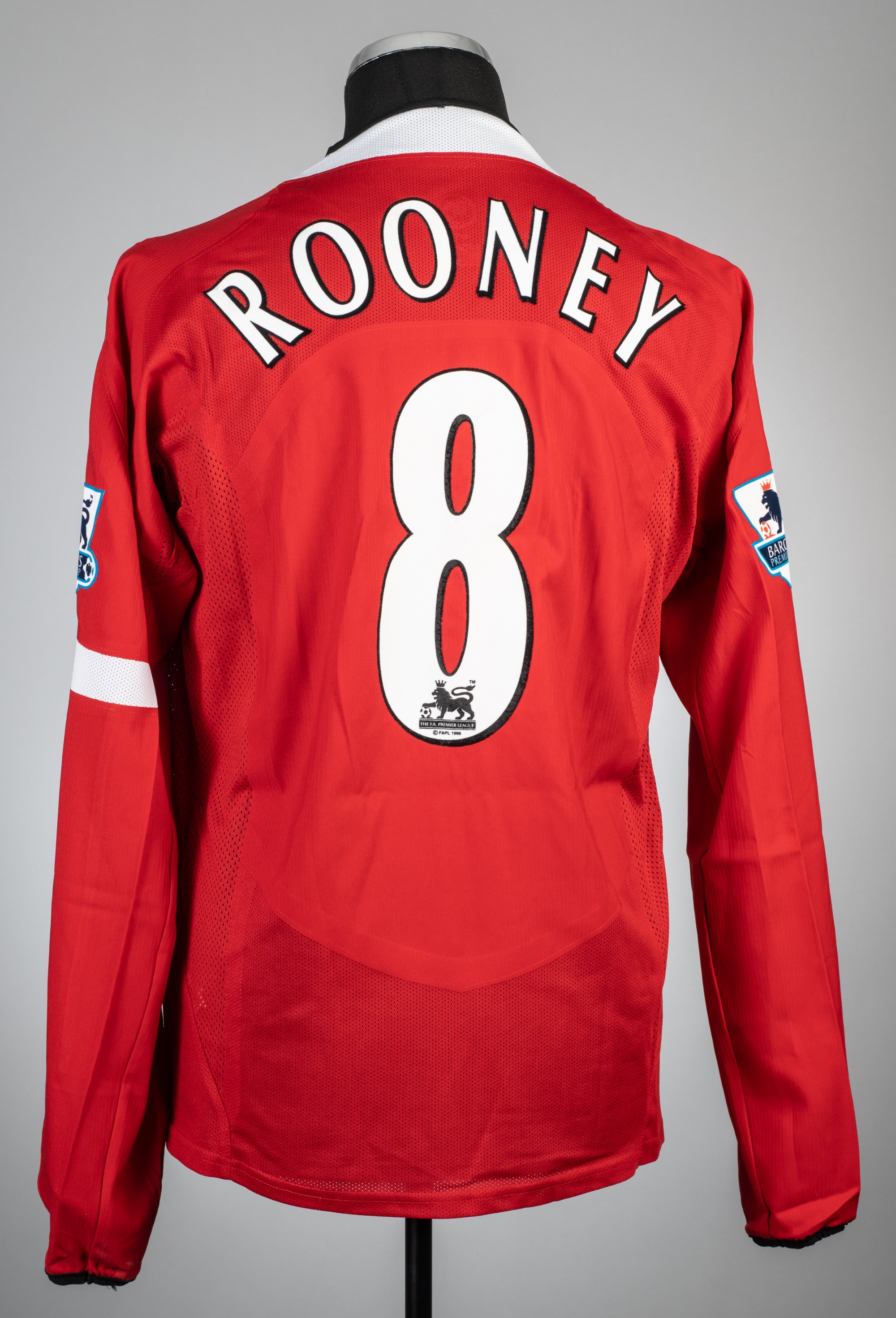 Wayne Rooney red Manchester United no.8 home jersey, season 2004-05, Nike, long-sleeved with BARCLAYS PREMIER LEAGUE sleeve badges, club crest and sponsor logo, reverse lettered ROONEY, size L