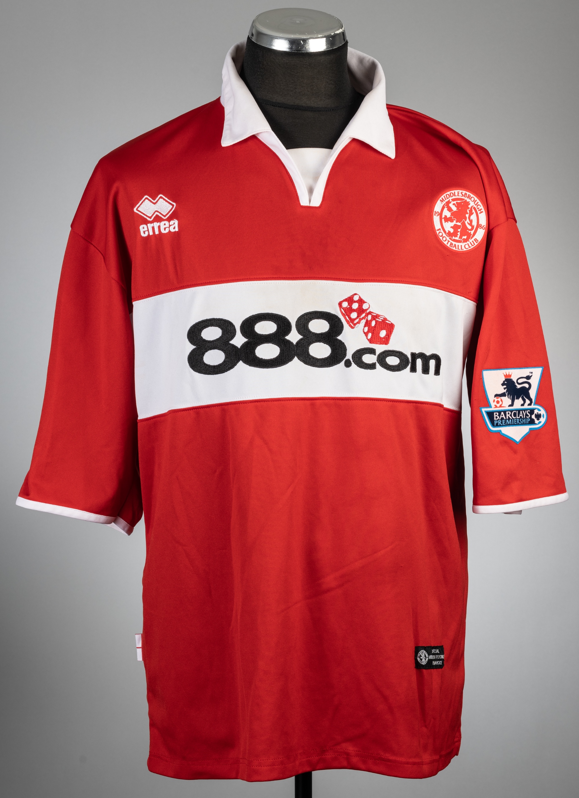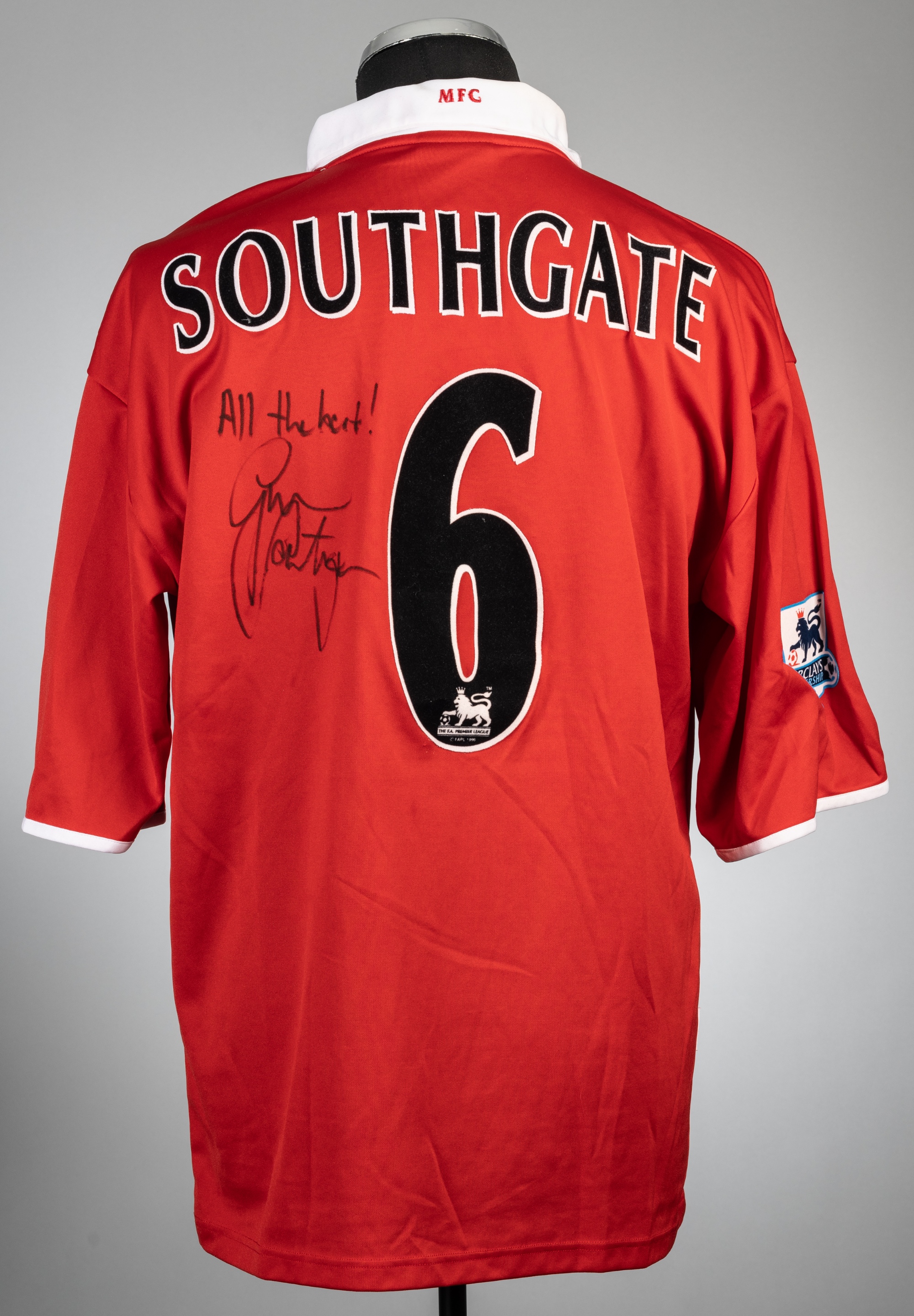 Gareth Southgate signed red Middlesbrough no.6 home jersey, season 2004-05, Errea, short-sleeved with BARCLAYS PREMIERSHIP sleeve badges, club crest and sponsor logo, reverse lettered SOUTHGATE, signed in black marker pen on reverse, size XXL