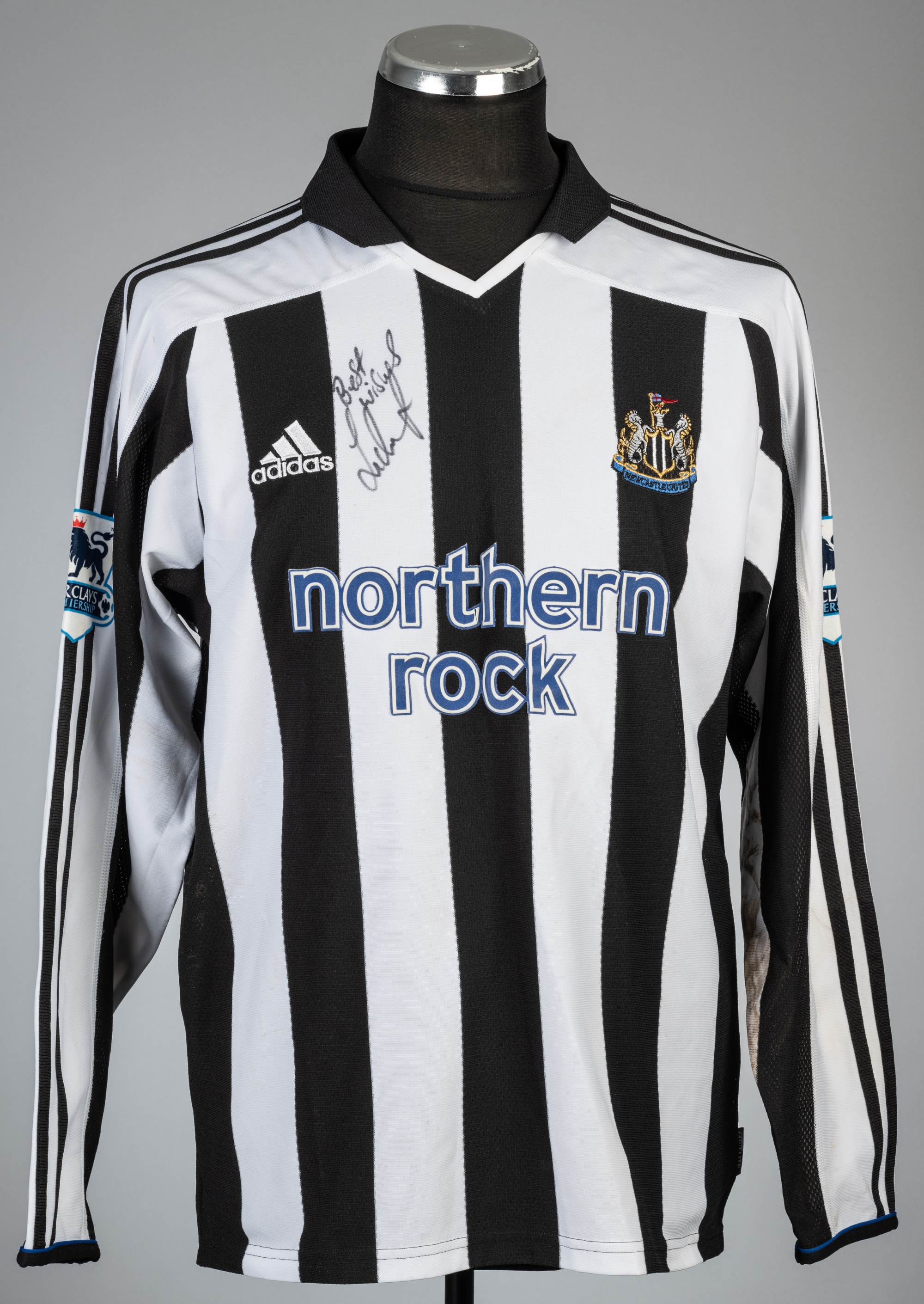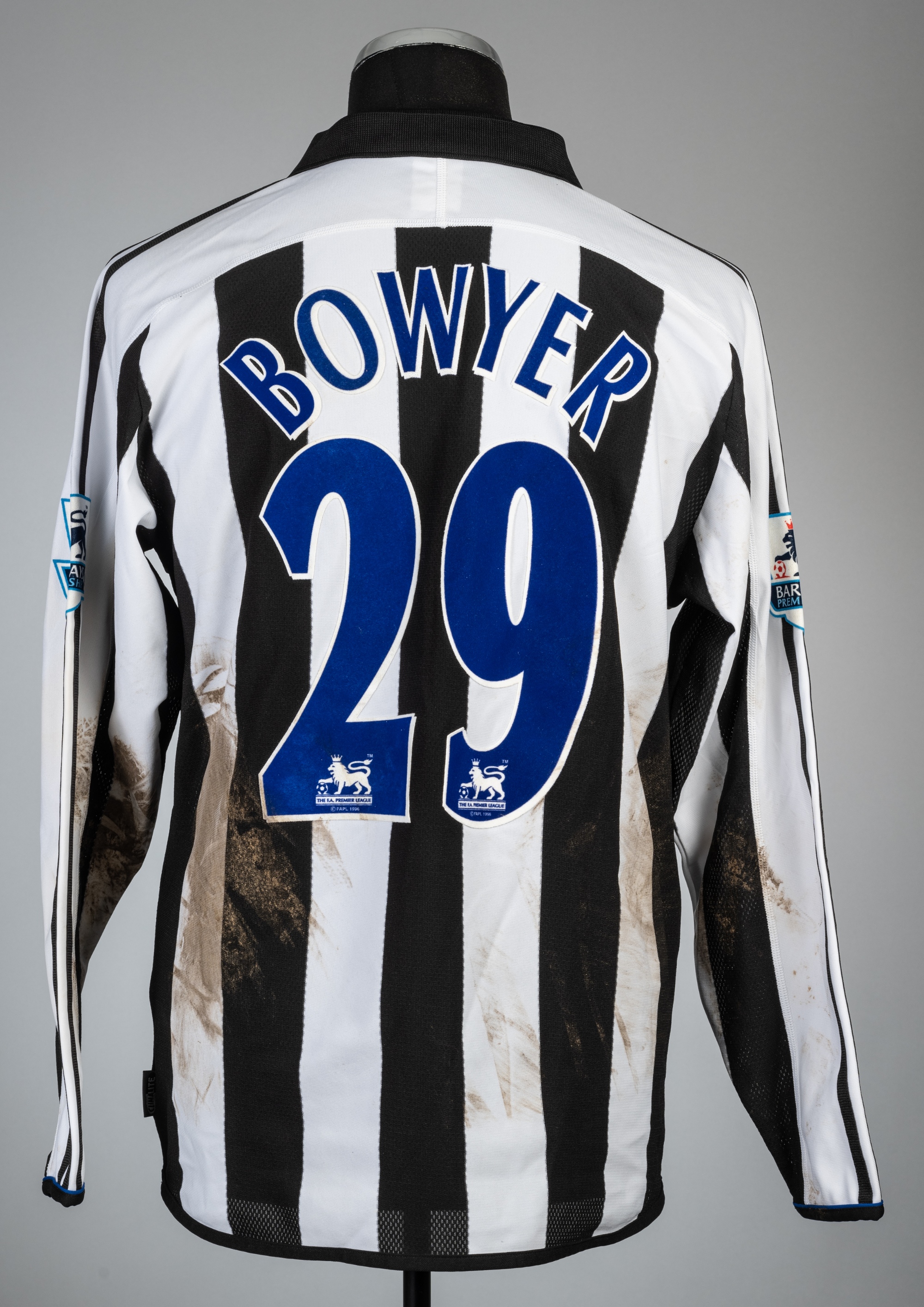 Lee Bowyer signed match-worn black & white striped Newcastle United no.29 home jersey, season 2004-05, Adidas, long-sleeved with BARCLAYS PREMIERSHIP sleeve badges, embroidered club crest and sponsor logo, reverse lettered BOWYER, signed in black marker pen to front, size M, bears signs of pitch marks on revere and sleeves