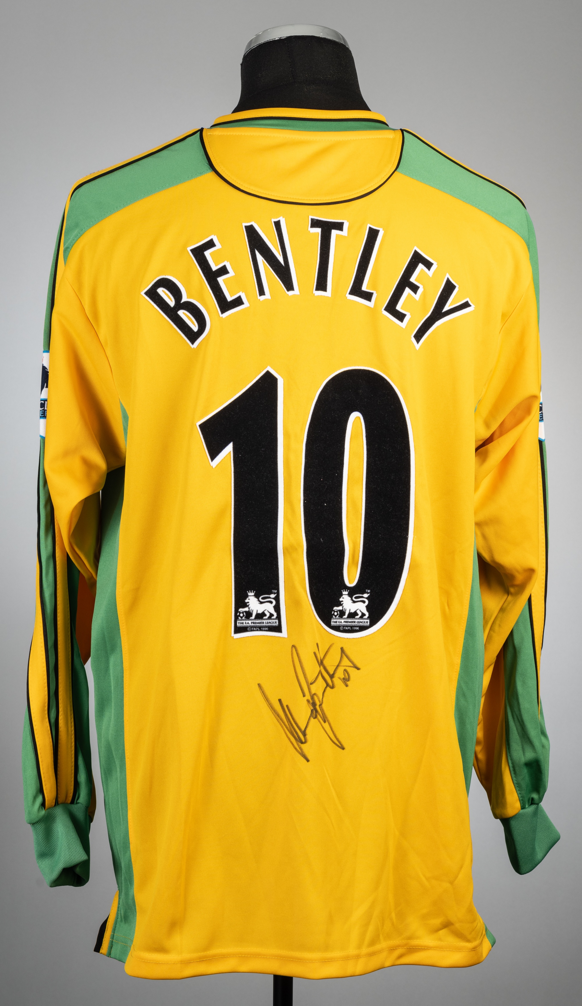 David Bentley signed yellow and green Norwich City no.10 home jersey, season 2004-05, Xara, long-sleeved with BARCLAYS PREMIERSHIP sleeve badges, club crest and sponsor logo, reverse lettered BENTLEY, signed in black marker pen to reverse size L