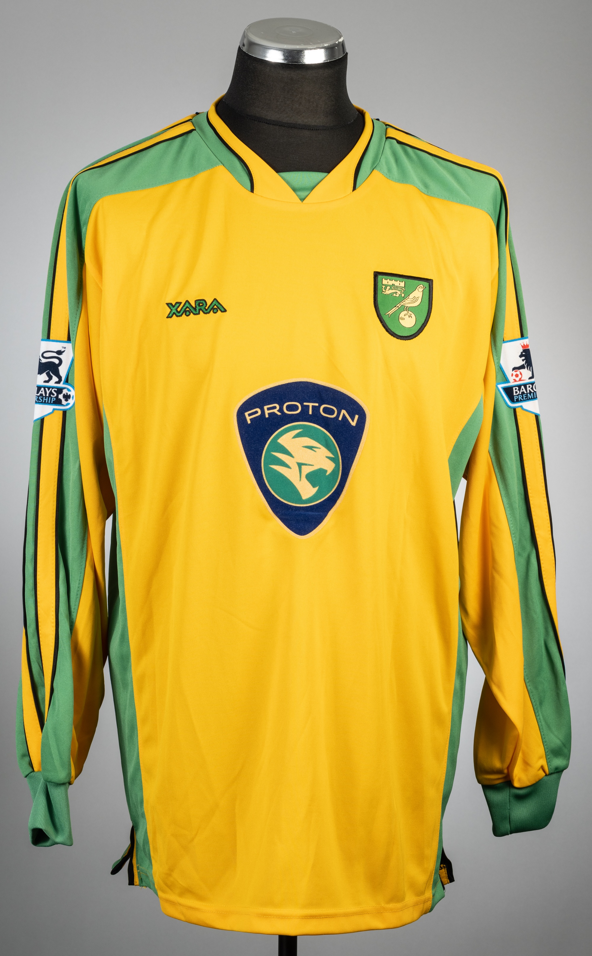 David Bentley signed yellow and green Norwich City no.10 home jersey, season 2004-05, Xara, long-sleeved with BARCLAYS PREMIERSHIP sleeve badges, clu