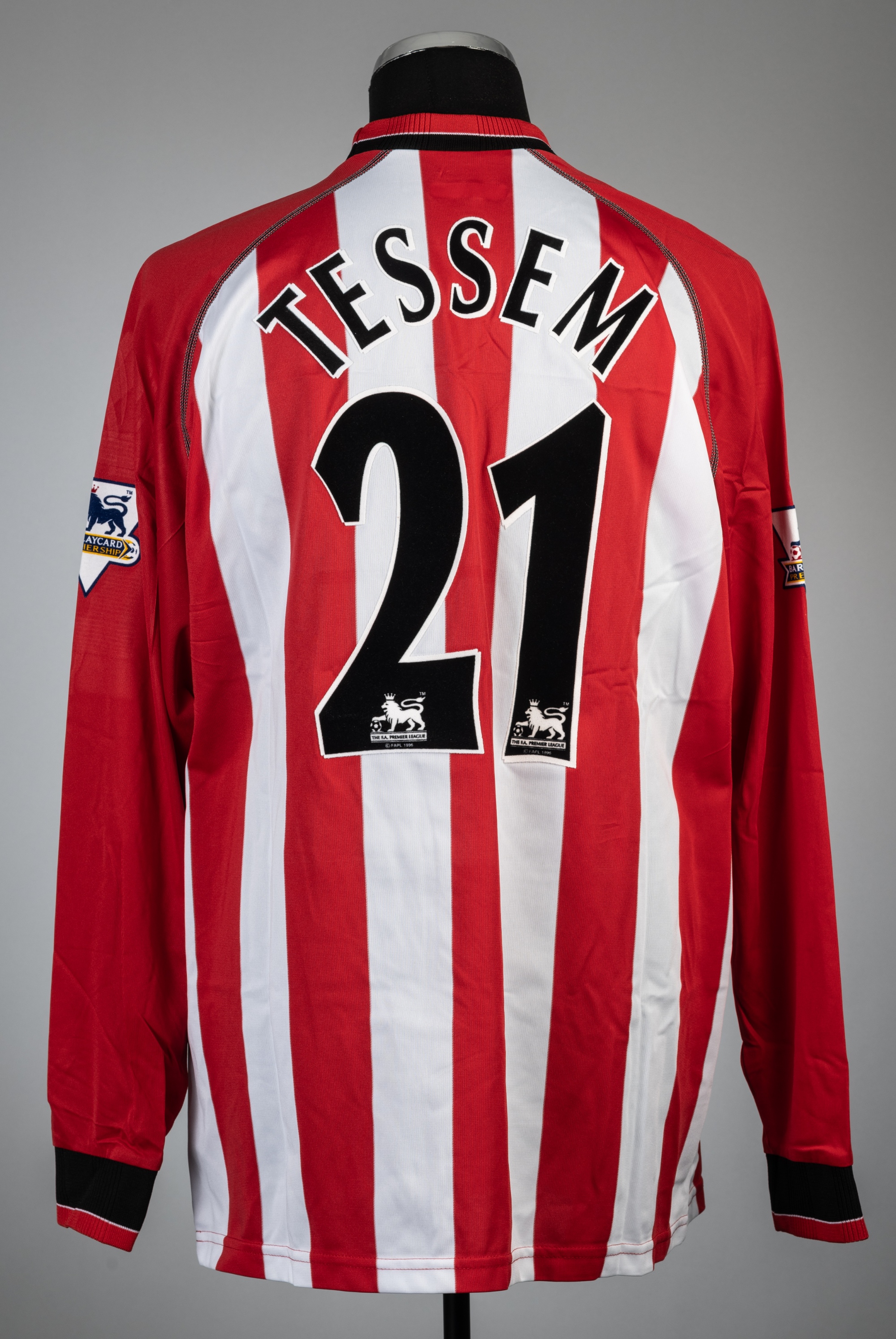 Jo Tessem red and white striped Southampton no.21 home jersey, season 2004-05, Saints, long-sleeved with BARCLAYCARD PREMIERSHIP sleeve badges, club crest and sponsor logo, reverse lettered TESSEM, size XL