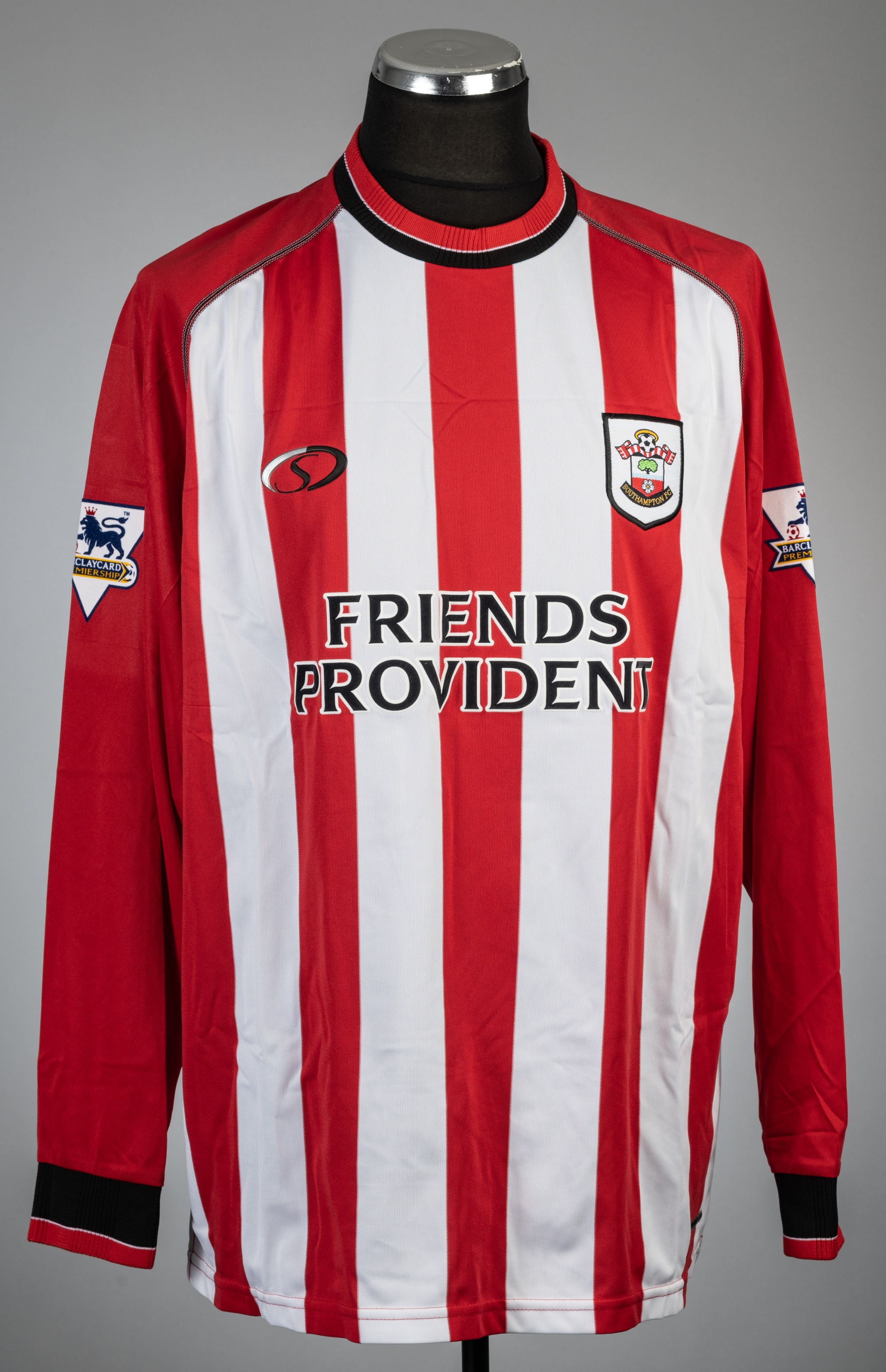 Jo Tessem red and white striped Southampton no.21 home jersey, season 2004-05, Saints, long-sleeved with BARCLAYCARD PREMIERSHIP sleeve badges, club