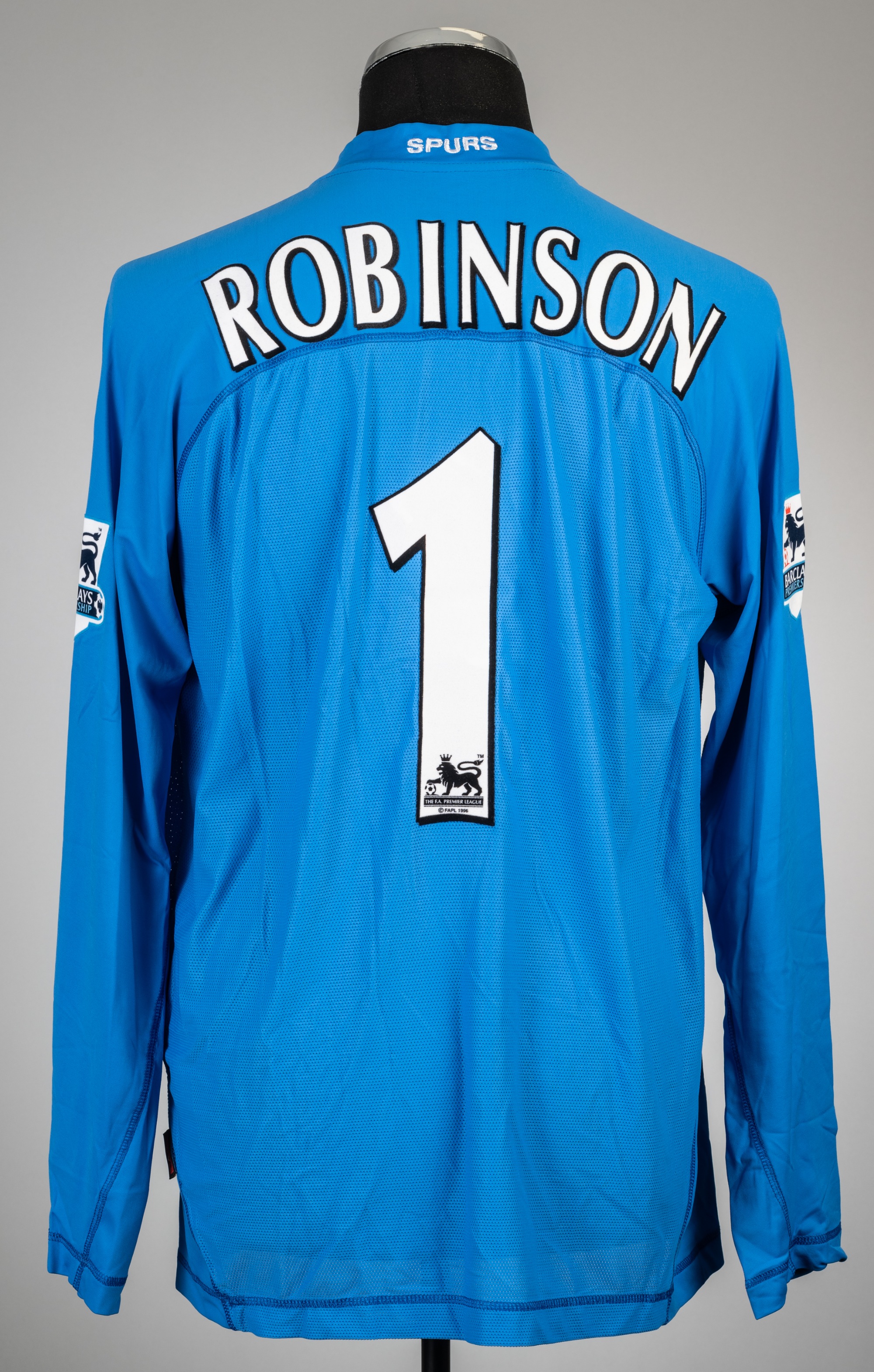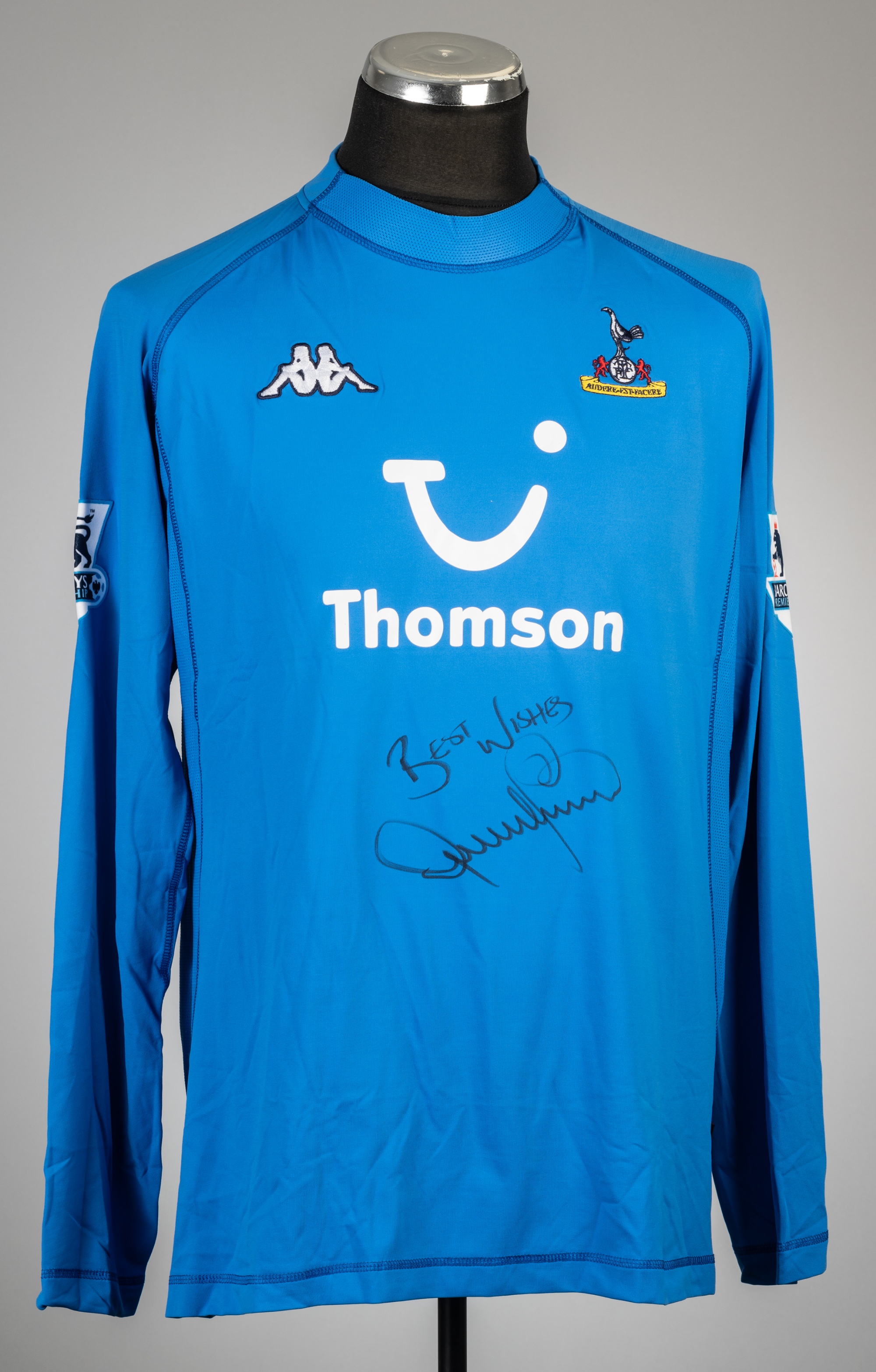 Paul Robinson signed blue Tottenham Hotspur no.1 goalkeeper's jersey, season 2004-05, Kappa, long-sleeved with BARCLAYS PREMIERSHIP sleeve badges, cl