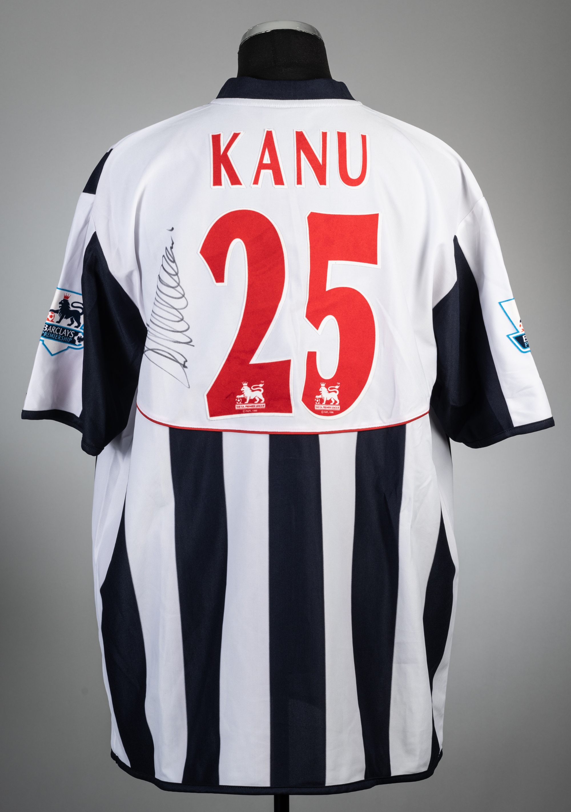 Kanu signed navy and white West Bromwich Albion no.25 home jersey, season 2004-05, Diadora, short-sleeved with BARCLAYS PREMIERSHIP sleeve badges, club rest and sponsor logo, reverse lettered KANU, signed in black marker pen on reverse, size XXL