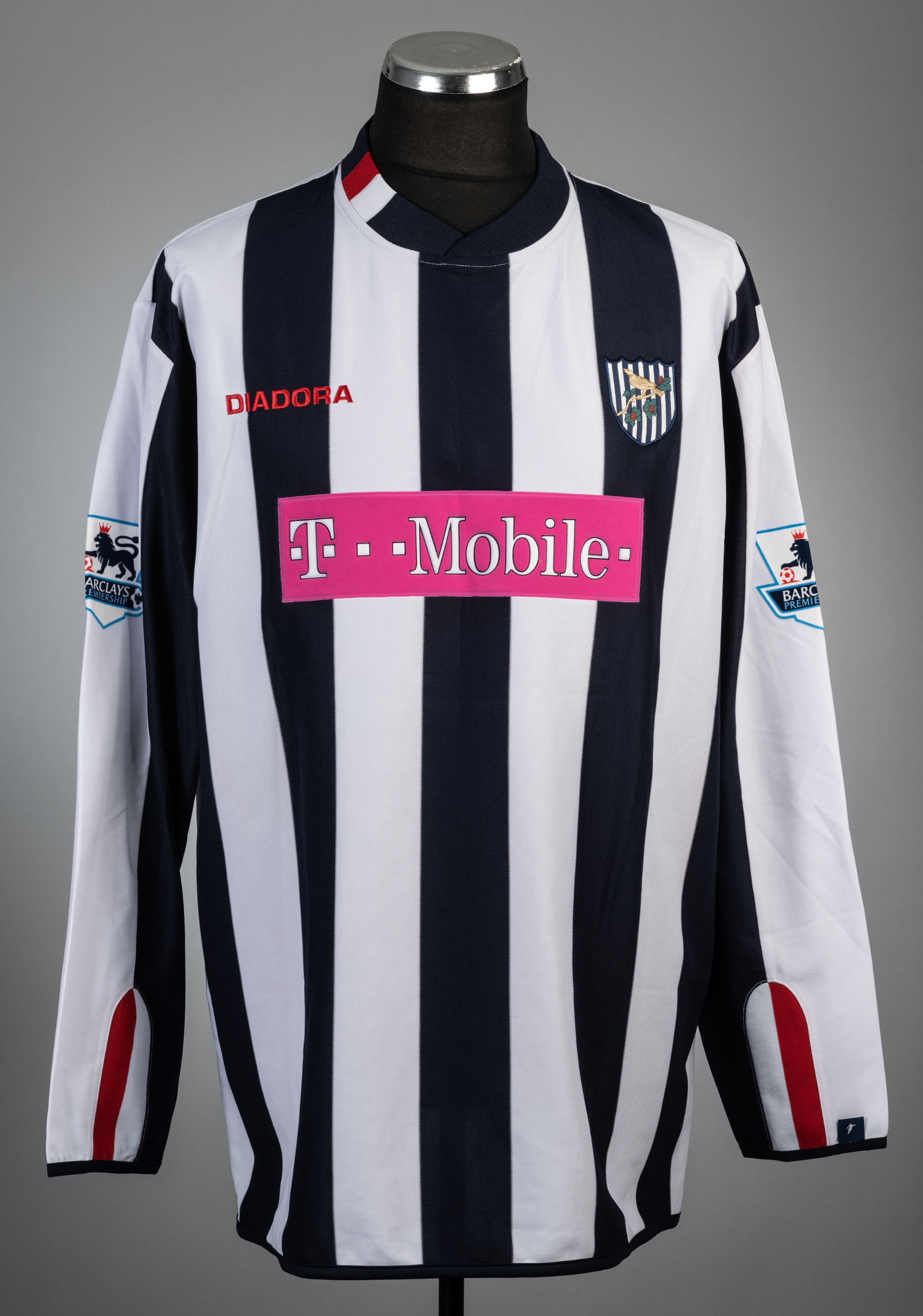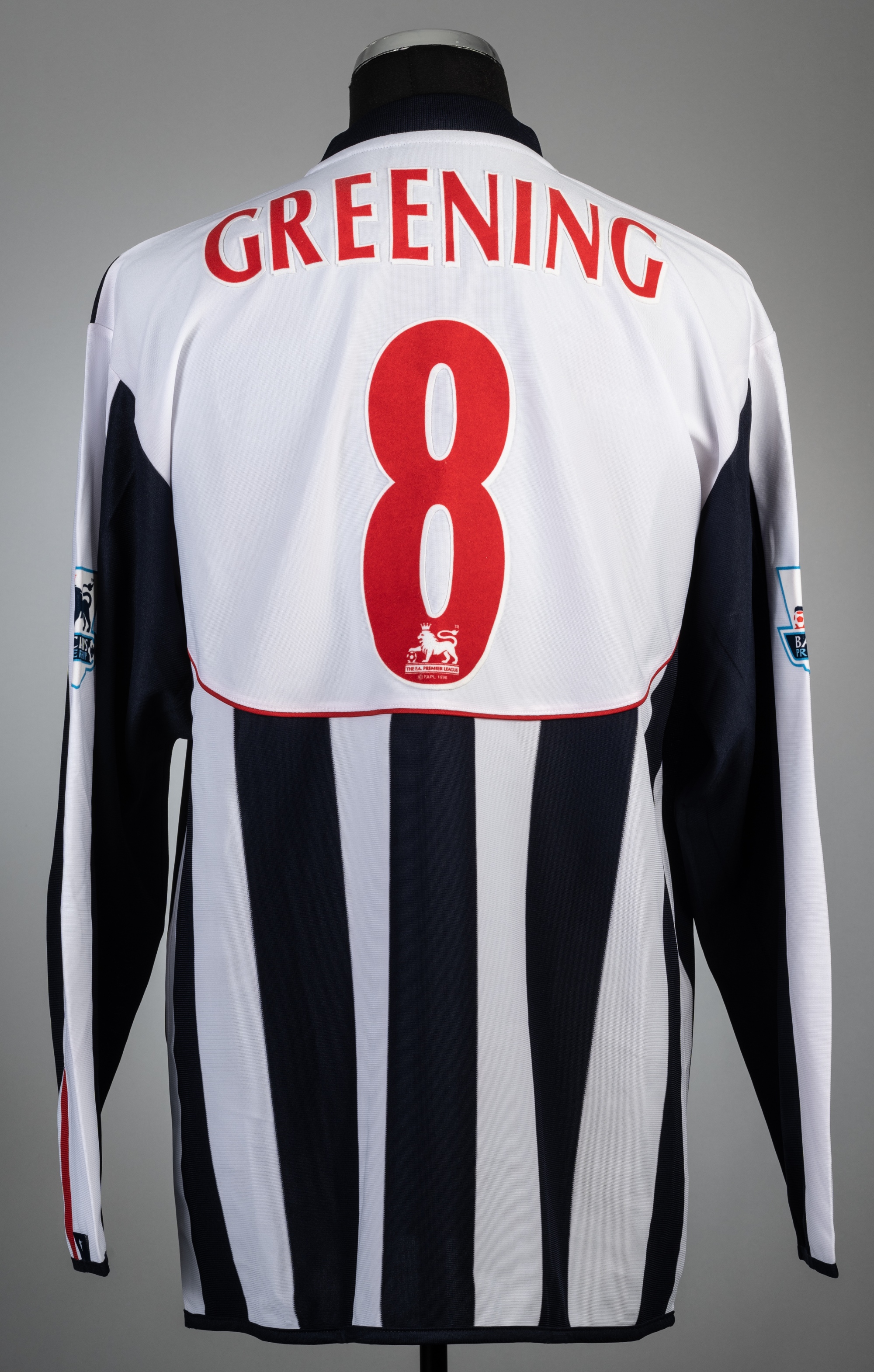 Jonathan Greening navy and white West Bromwich Albion no.8 home jersey, season 2004-05, Diadora, long-sleeved with BARCLAYS PREMIERSHIP sleeve badges, club crest and sponsor logo, reverse lettered GREENING, size XL