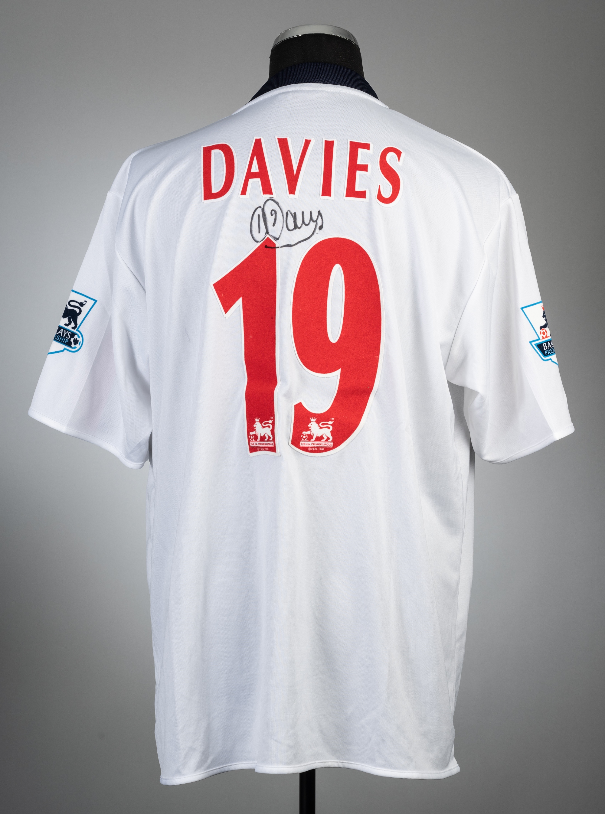 Curtis Davies signed white and navy West Bromwich Albion no.19 third choice jersey, season 2004-05, Diadora, short-sleeved with BARCLAYS PREMIERSHIP sleeve badges, club crest and sponsor logo, reverse lettered DAVIES, signed in black marker pen on reverse, size XL