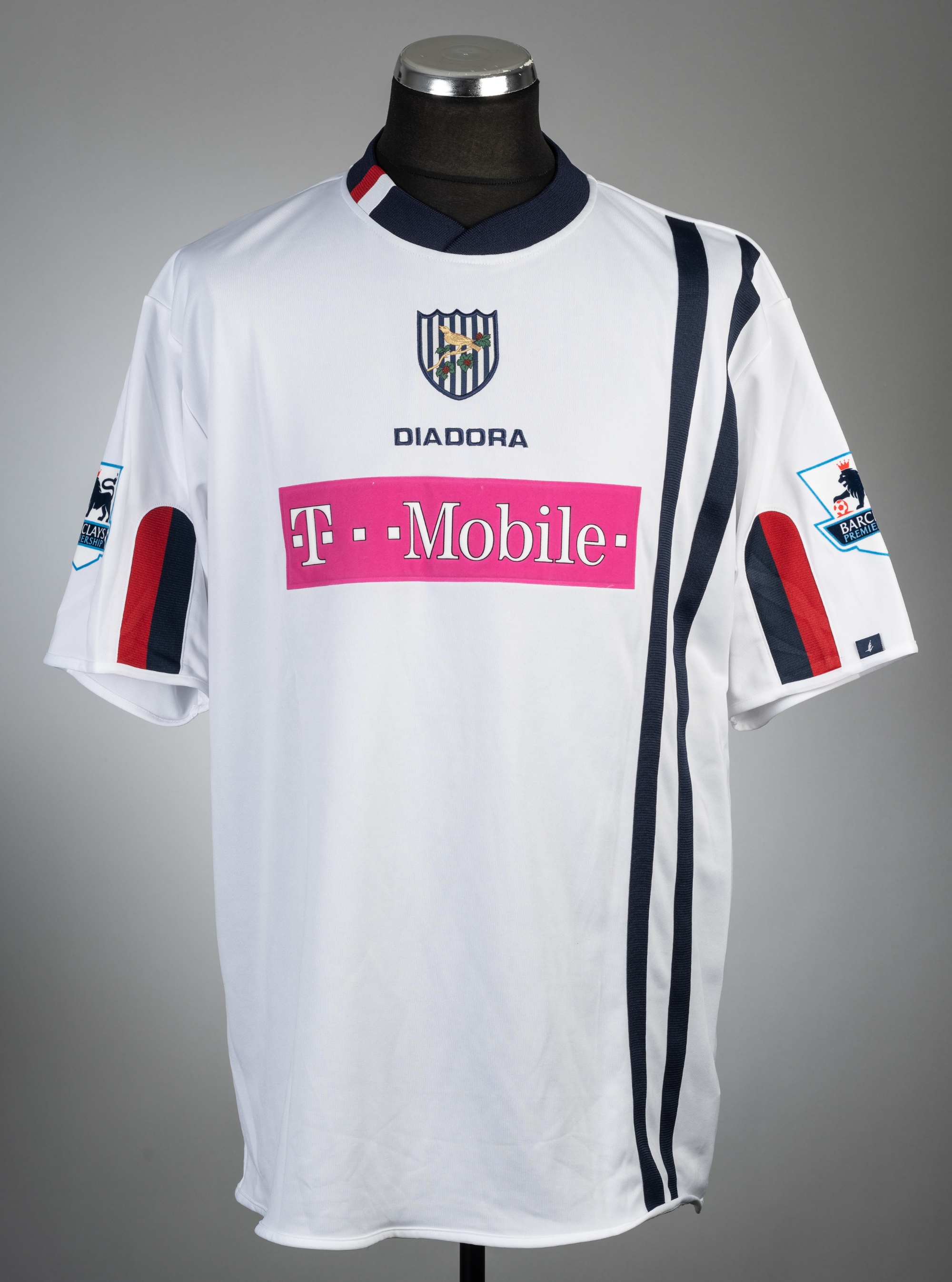 Curtis Davies signed white and navy West Bromwich Albion no.19 third choice jersey, season 2004-05, Diadora, short-sleeved with BARCLAYS PREMIERSHIP