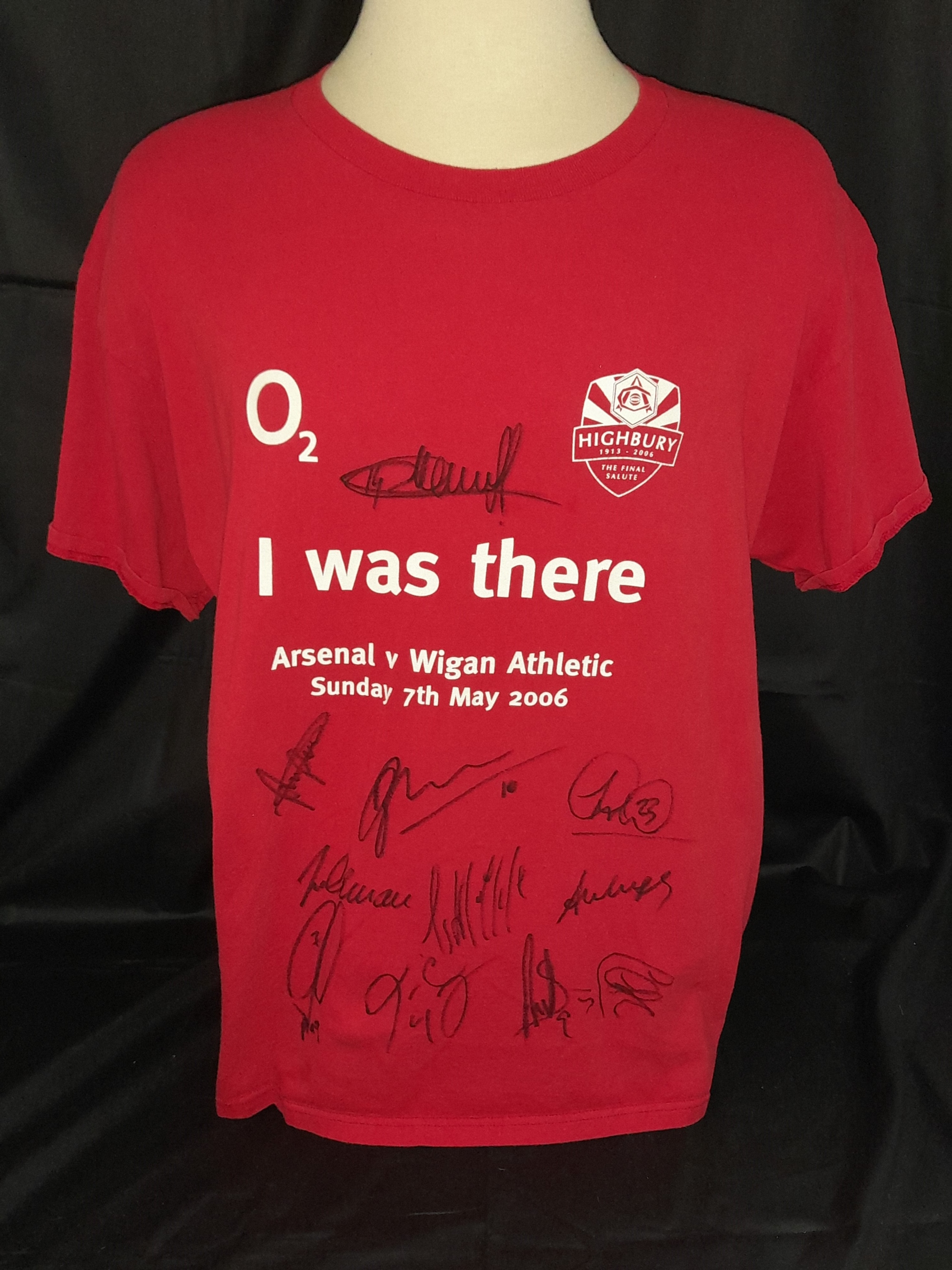 Arsenal signed “I Was There shirt” jersey to commemorate Arsenal's last ever game at Highbury on Sunday 7th May 2006 against Wigan, it has been autographed by 11 Highbury Legends, Thierry Henry, Robin Van Persie, Dennis Bergkamp, Sol Campbell, Jens Lehmann, Ashley Cole, Arsene Wenger (manager), Robert Pires, Freddie Ljungberg, Jose Antonio Reyes and Cesc Fabregas
