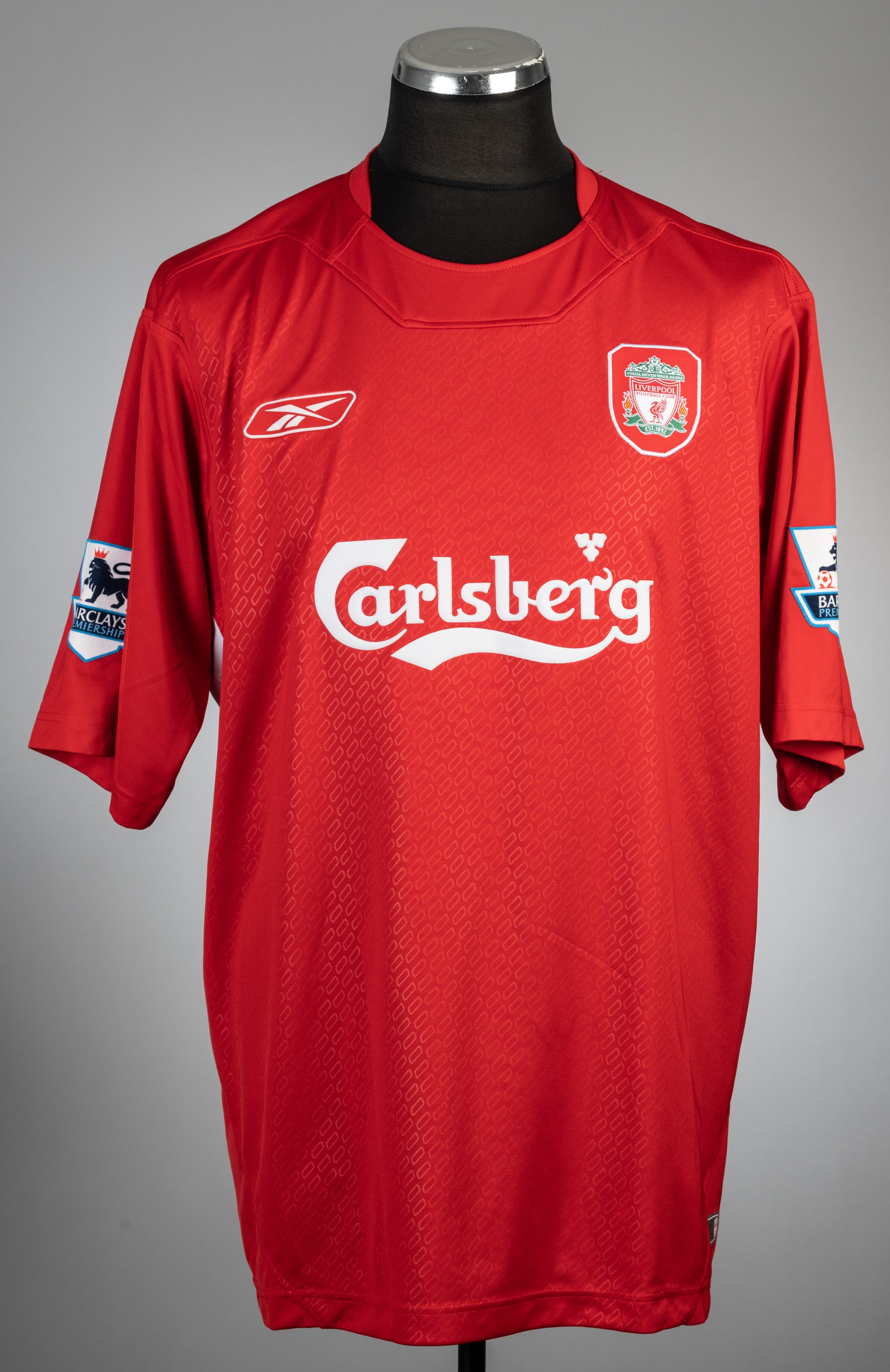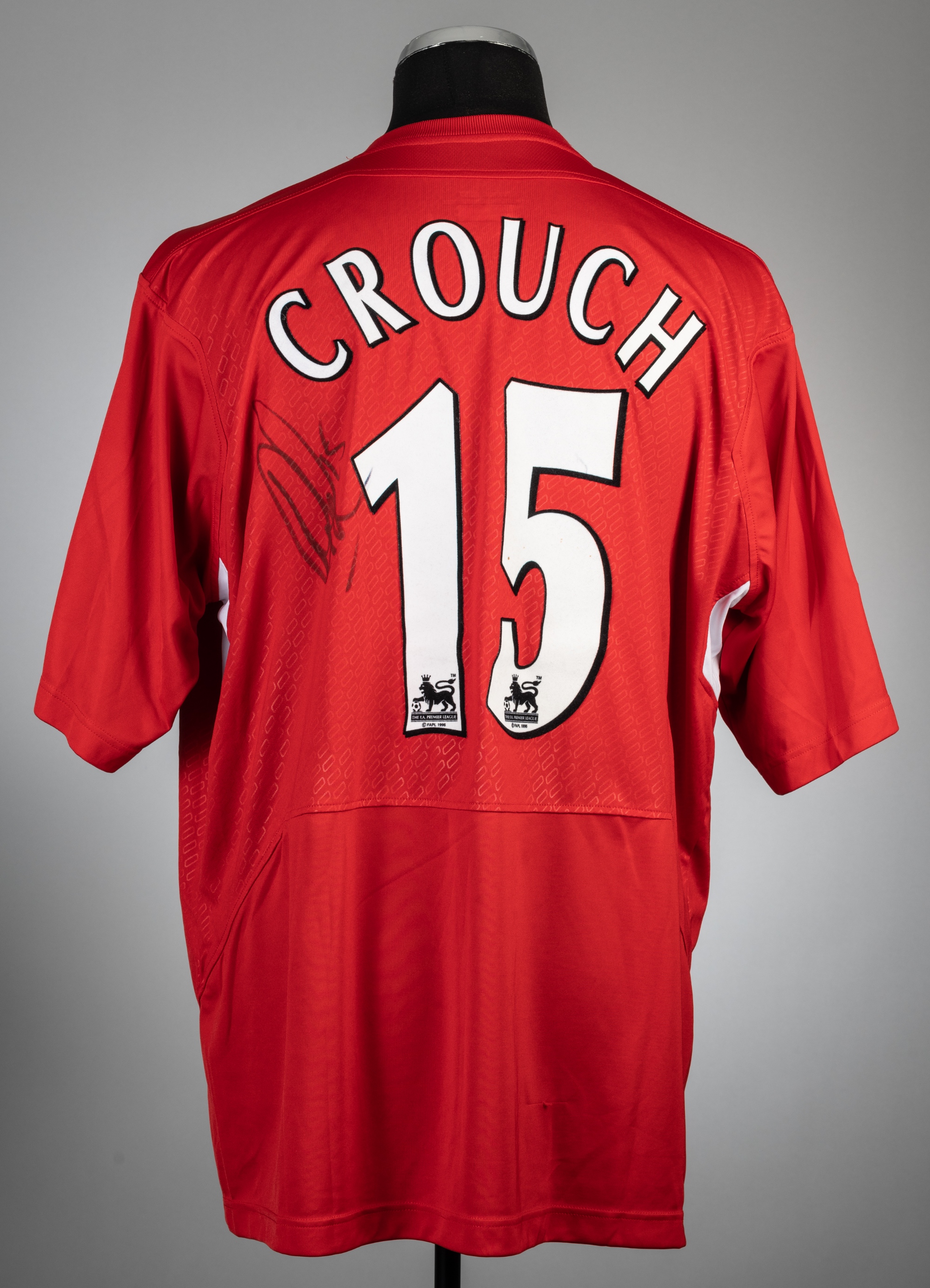 Peter Crouch signed red Liverpool no.15 home jersey, season 2005-06, Reebok, short-sleeved with BARCLAYS PREMIERSHIP sleeve badges, club crest and s