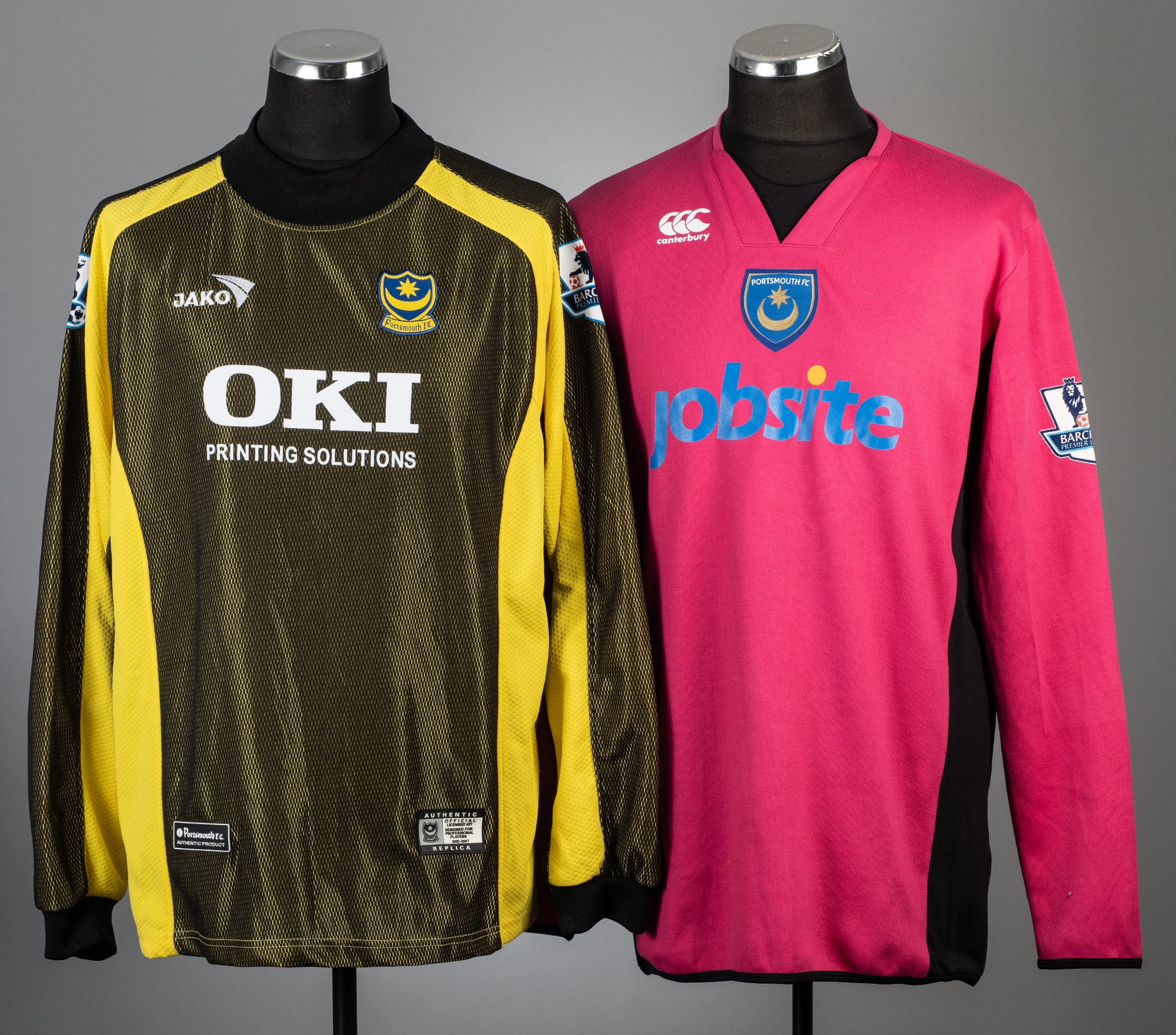 Two Portsmouth goalkeeper's jerseys for season's 2005-06 and 2009-10, comprising Dean Kiely yellow and black no.33 goalkeeper's jersey, season 2005-06, Jako, long-sleeved with BARCLAYS PREMIERSHIP sleeve badges, club crest and sponsor logo, reverse lettered KIELY, size XL and Liam O'Brien pink and black no.31 goalkeeper's jersey, season 2009-10, Canterbury, long-sleeved with BARCLAYS PREMIER LEAGUE sleeve badges, club crest and sponsor logo, reverse lettered O'BRIEN, size XL, (2)