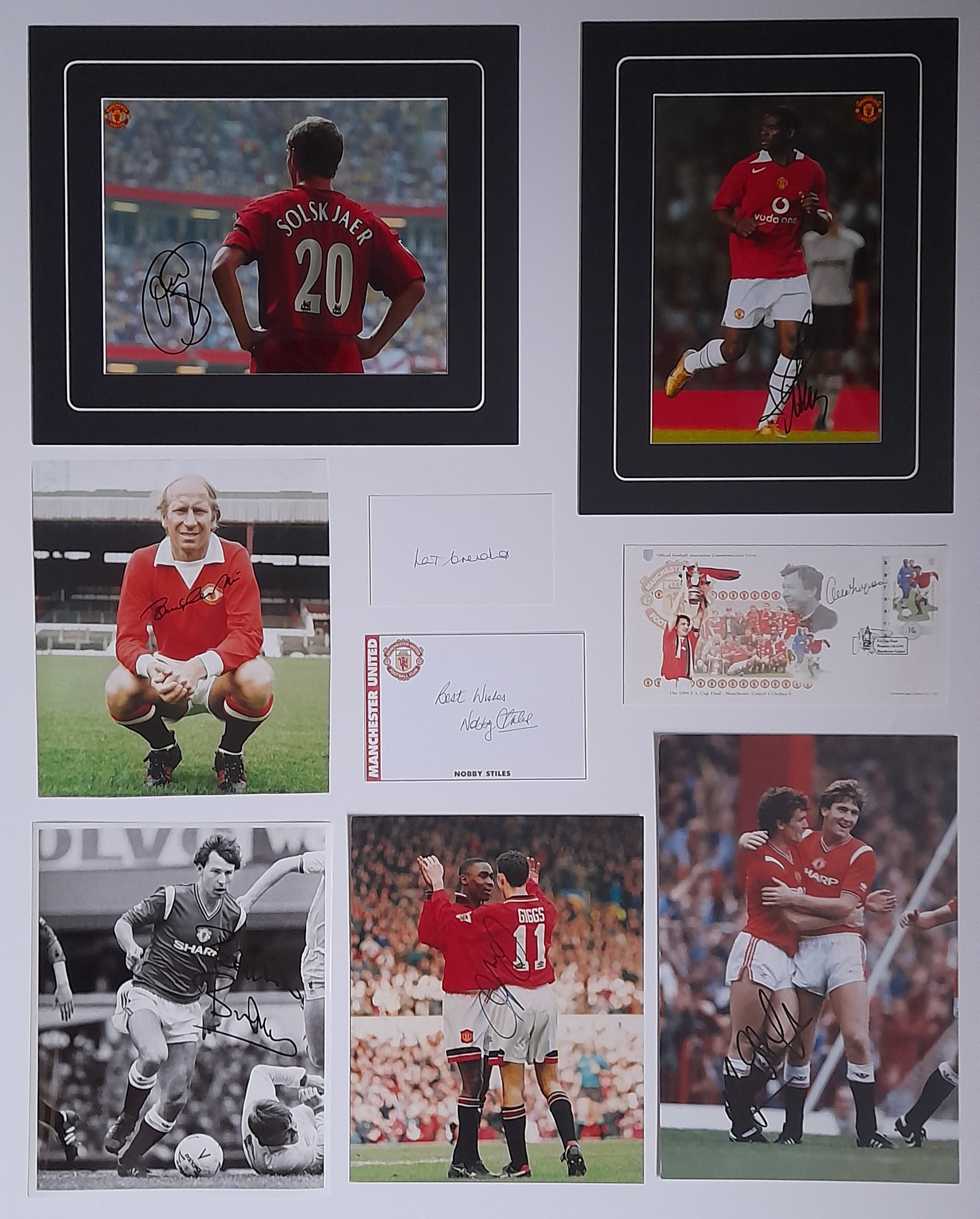 Manchester United six Legends signed photos, various sizes, couple with black mounts around, being Louis Saha & Ole Gunnar Solskjaer the other four are Ryan Giggs, Bobby Charlton, Mark Hughes and Bryan Robson along with two autographs of Pat Crerand and Nobby Stiles and finally Sir Alex Ferguson signed 1994 FA Cup winners First Day Cover, comes with covering COA, (qty)