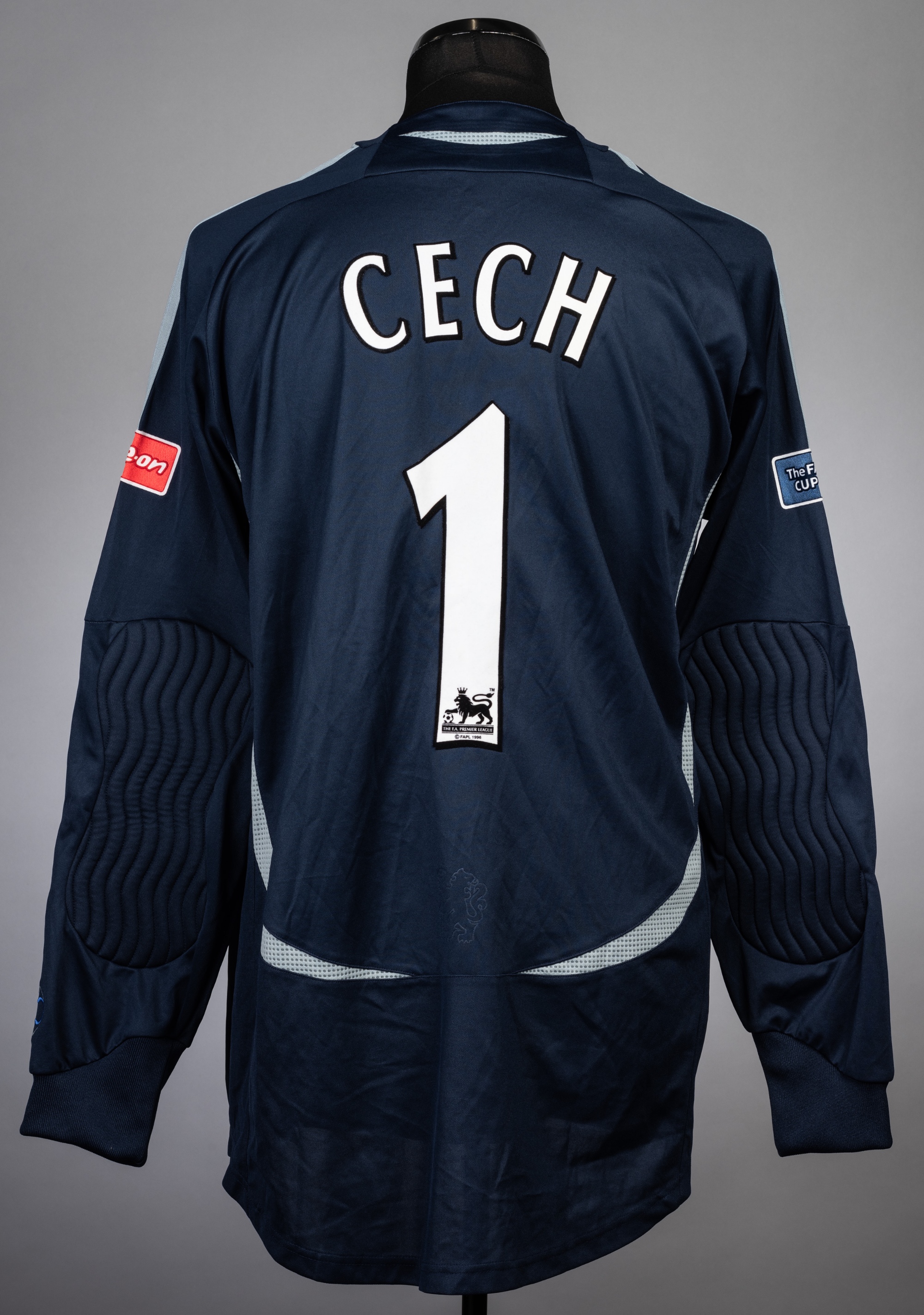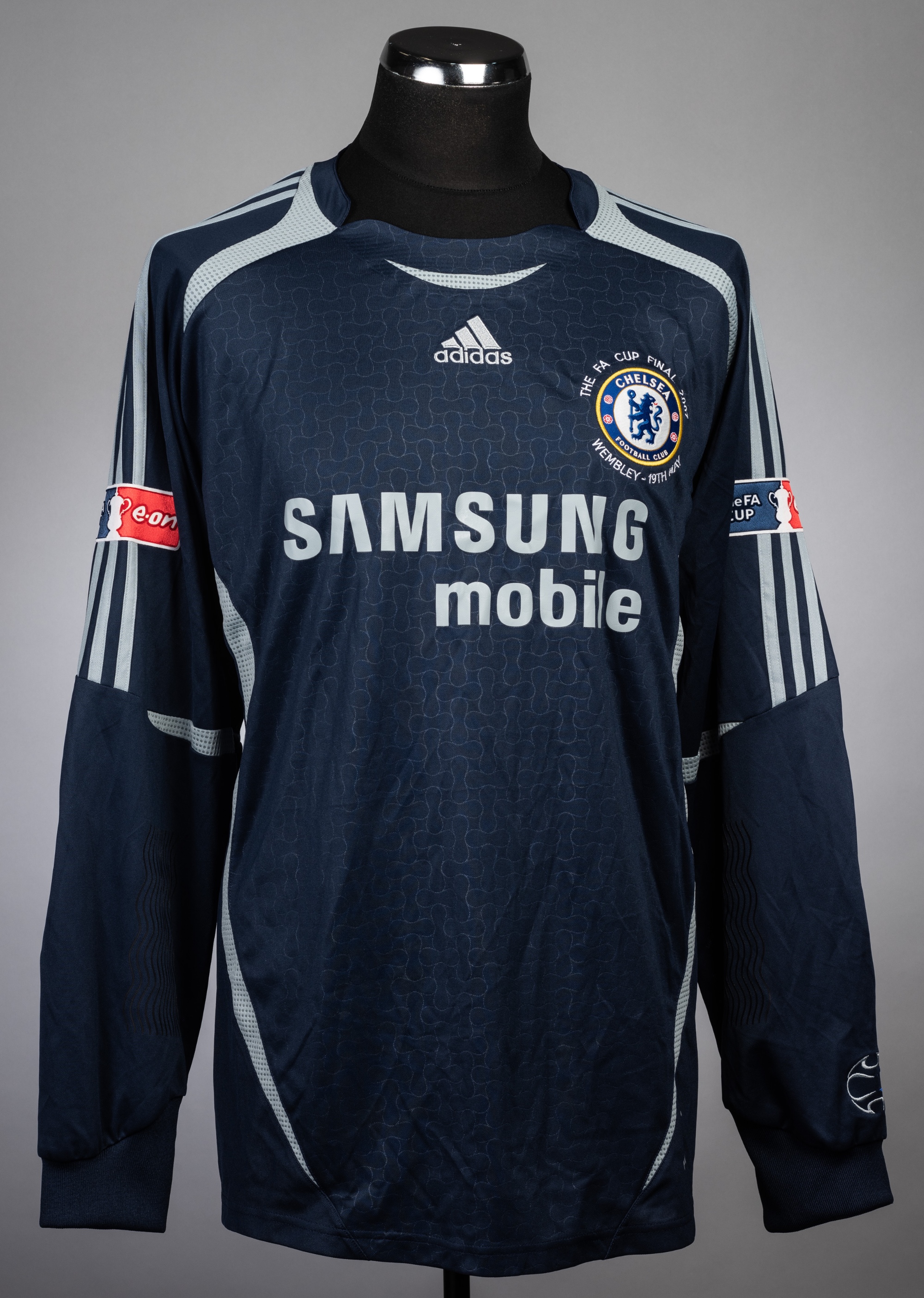 Petr Cech navy and grey Chelsea goalkeeper's no.1 jersey v Manchester United in the FA Cup Final at Wembley, 19th May 2007, Adidas, long-sleeved with padded elbows and THE FA CUP sleeve badges, embroidered with THE FA CUP FINAL 2007 WEMBLEY - 19TH MAY, reverse lettered CECH Chelsea defeated Manchester United 1-0.