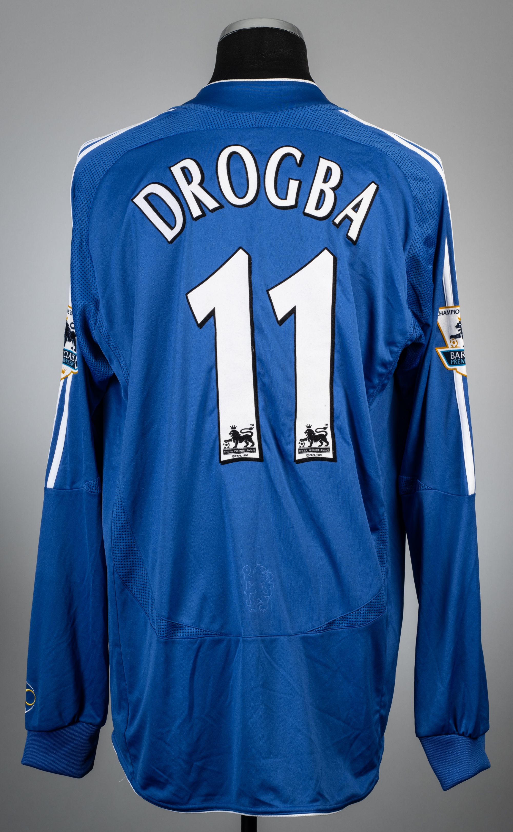 Didier Drogba blue Chelsea no.11 home jersey, season 2006-07, Adidas, player issued long-sleeved with BARCLAYS PREMIER LEAGUE CHAMPIONS 2005-2006 sleeve badges, club crest and sponsor logo, CHELSEA FOOTBALL CLUB on front white collar, reverse lettered DROGBA, size XL
