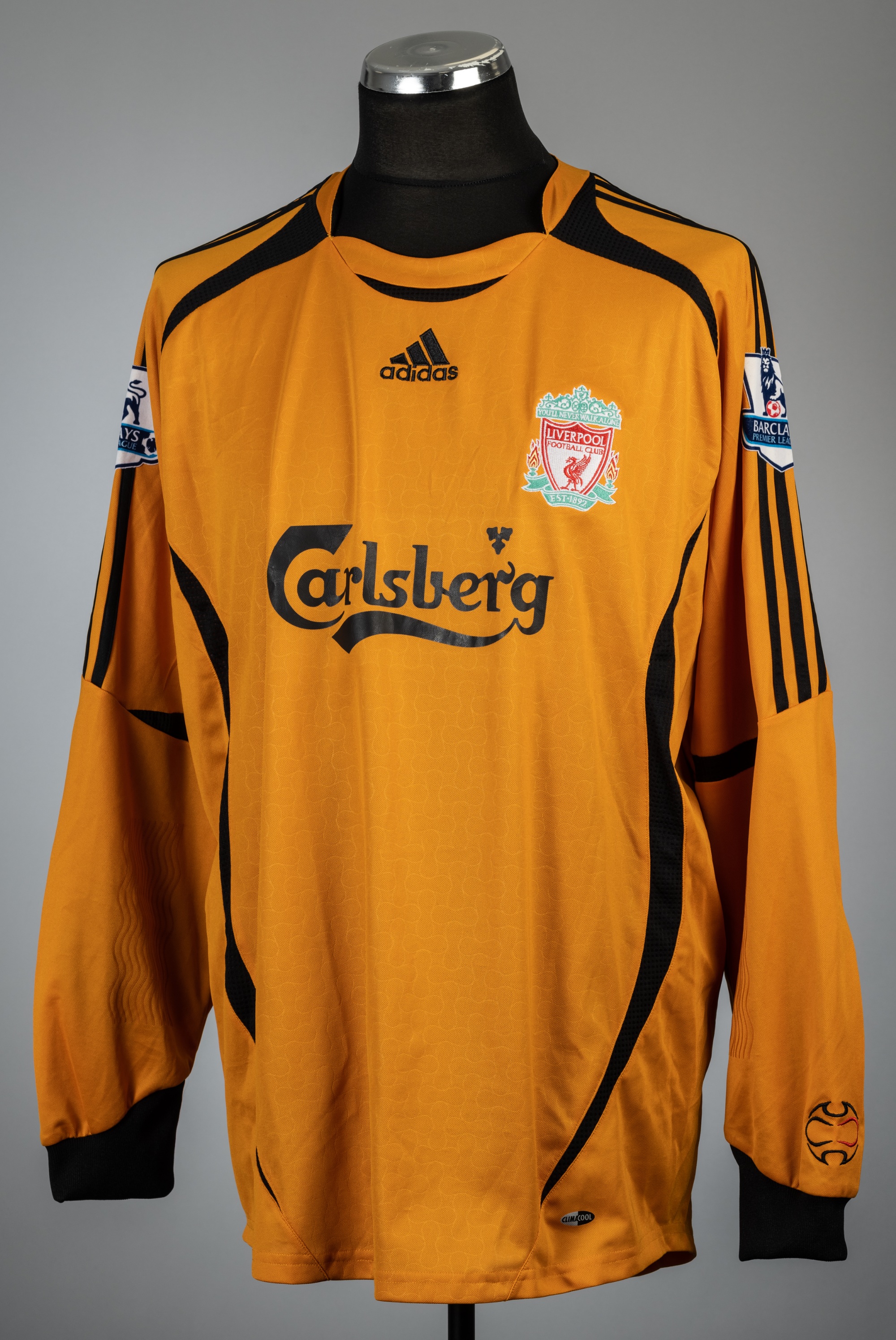 Pepe Reina gold Liverpool no.25 goalkeeper's jersey, season 2006-07, Adidas, long-sleeved with BARCLAYS PREMIER LEAGUE sleeve badges, club crest and