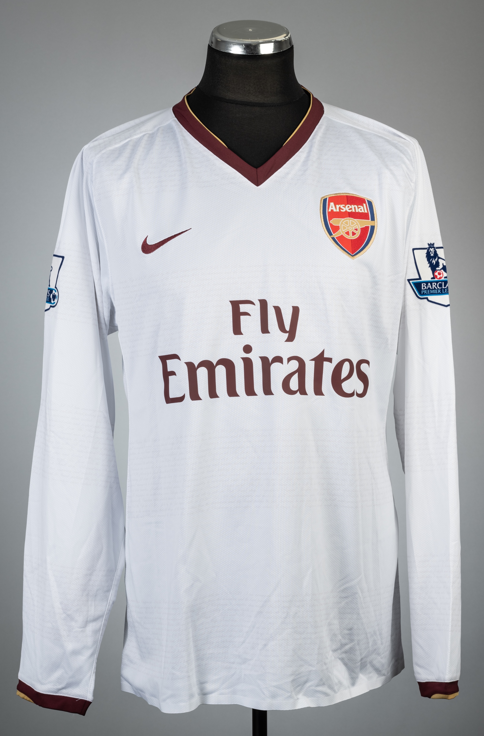 Robin van Persie signed white Arsenal no.11 away jersey, season 2007-08, Nike, long-sleeved with BARCLAYS PREMIER LEAGUE sleeve badges, club crest an