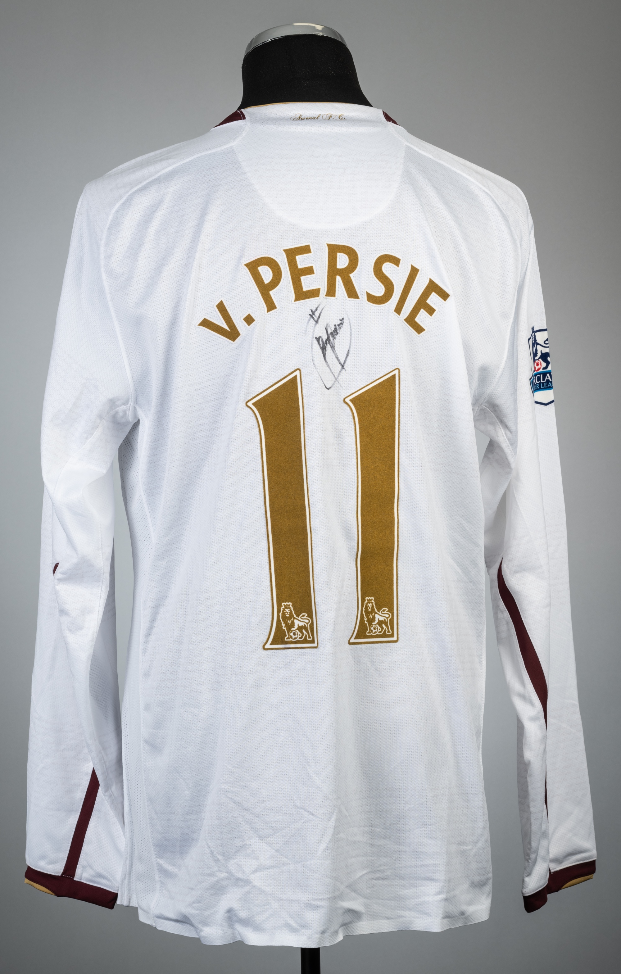 Robin van Persie signed white Arsenal no.11 away jersey, season 2007-08, Nike, long-sleeved with BARCLAYS PREMIER LEAGUE sleeve badges, club crest and sponsor logo, reverse lettered v.PERSIE, signed in black marker pen to reverse, size XL