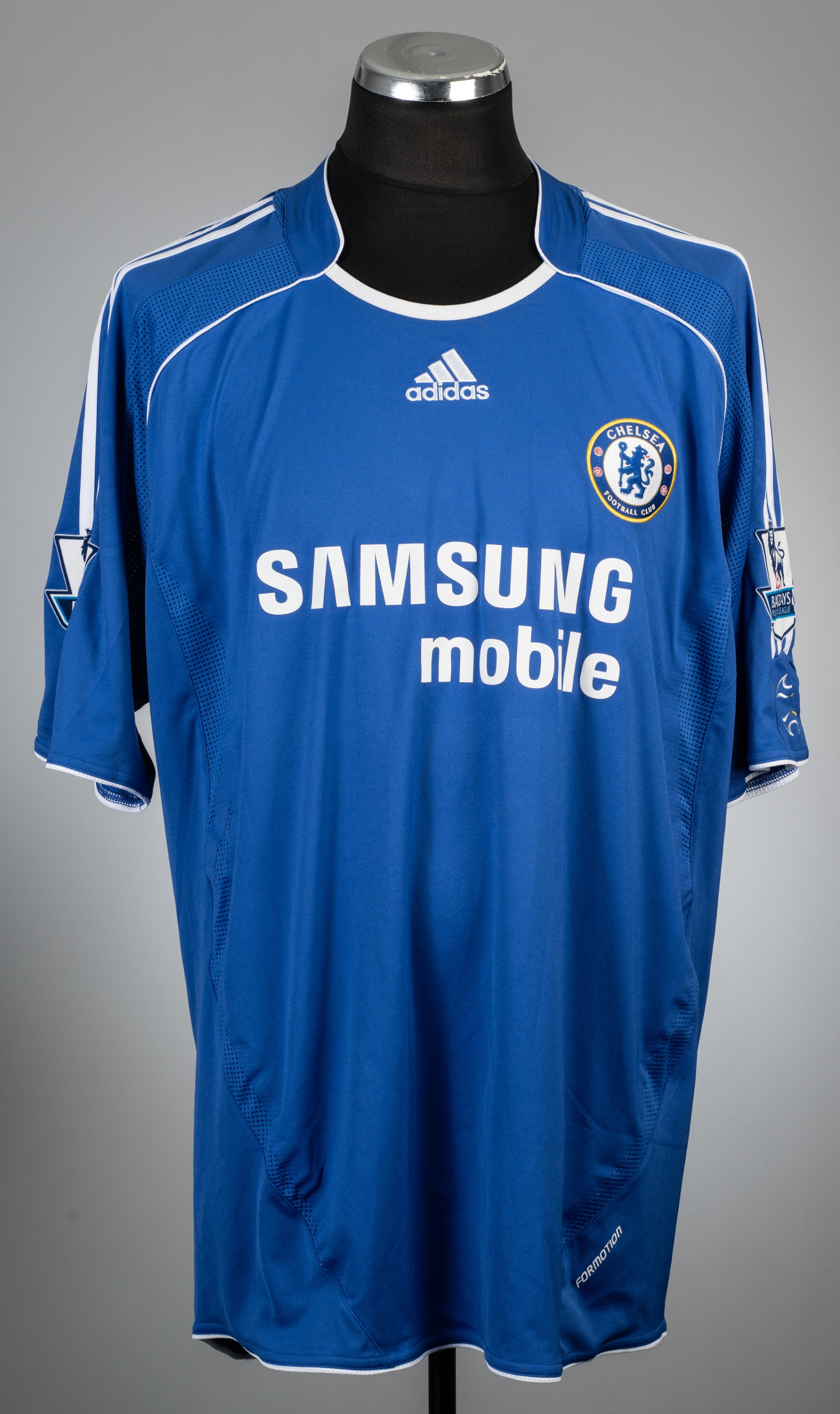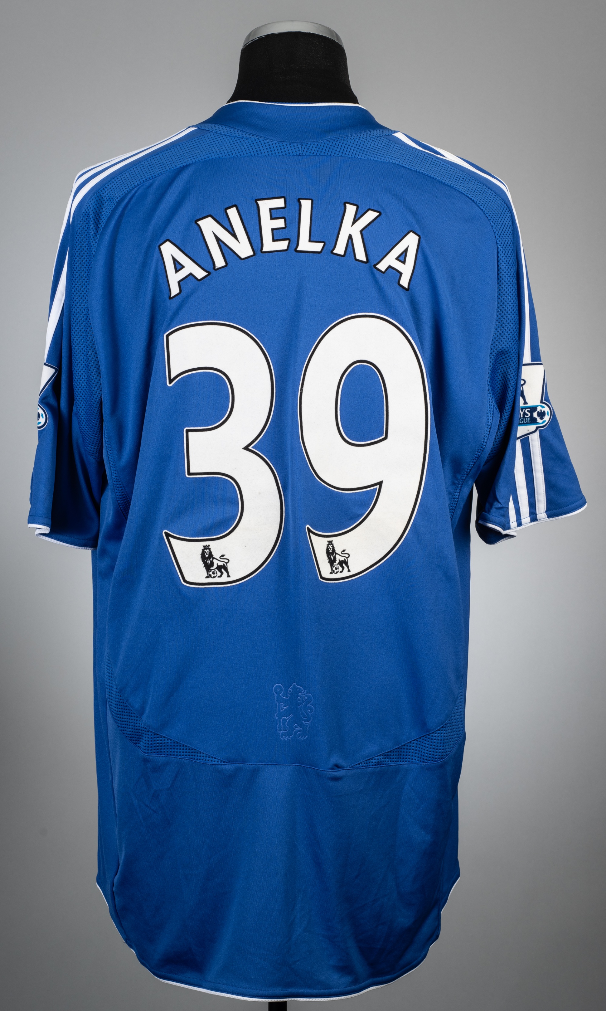 Nicolas Anelka blue Chelsea no.39 home jersey, season 2007-08, Adidas, player issued short-sleeved with BARCLAYS PREMIER LEAGUE sleeve badges, club crest and sponsor logo, CHELSEA FOOTBALL CLUB on front white collar, reverse lettered ANELKA, size 2XL