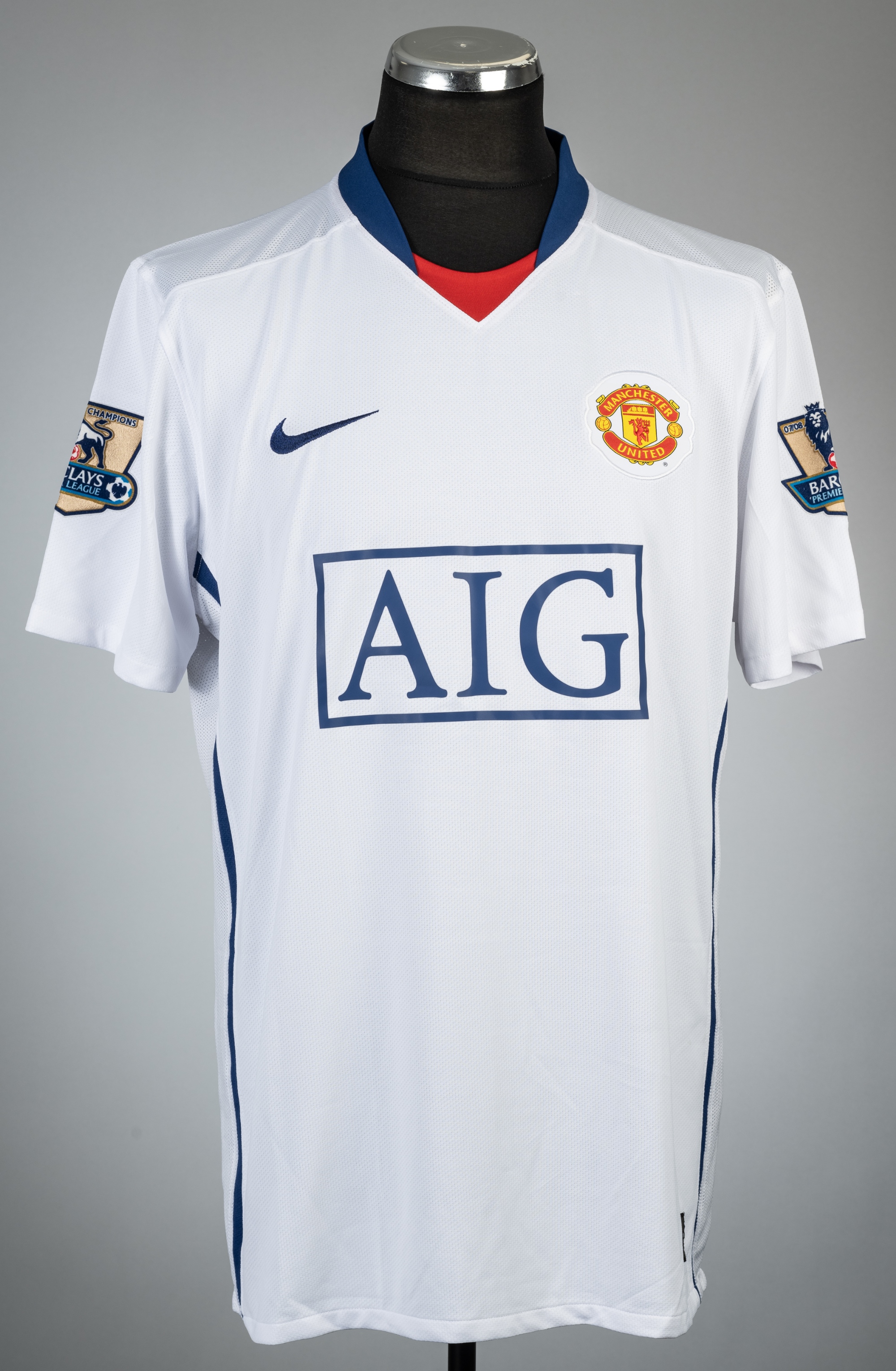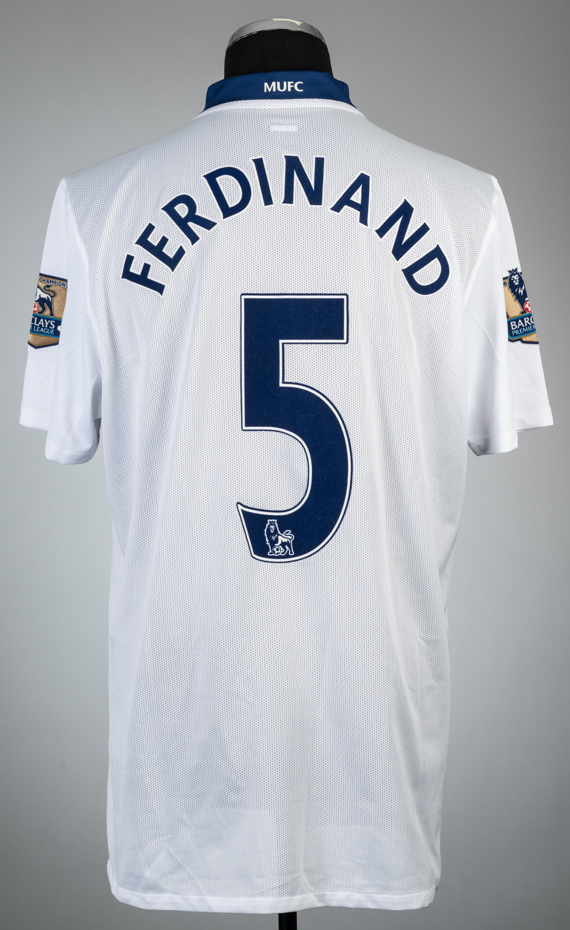 Rio Ferdinand white Manchester United no.5 away jersey, season 2008-09, Nike, short-sleeved with BARCLAYS PREMIER LEAGUE 07/08 CHAMPIONS gold sleeve badges, club crest and sponsor logo, reverse lettered FERDINAND, size XL