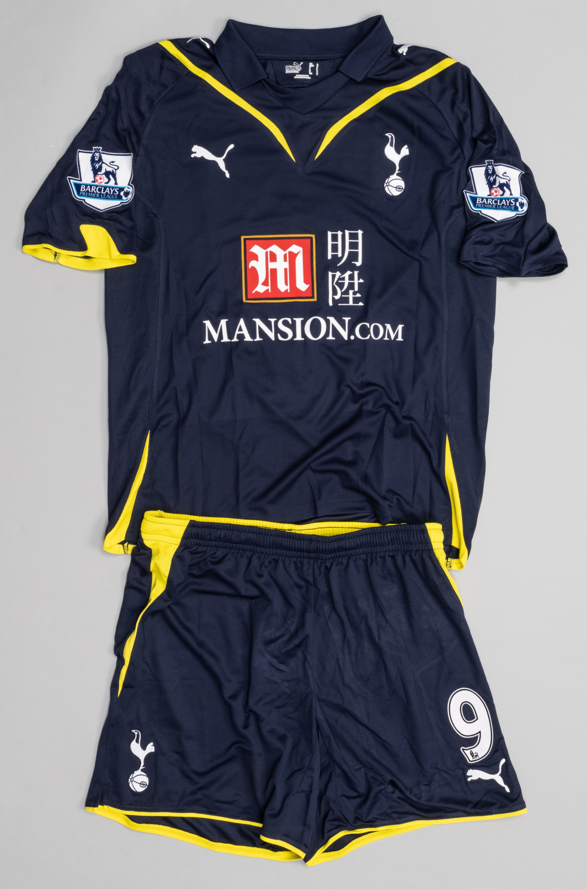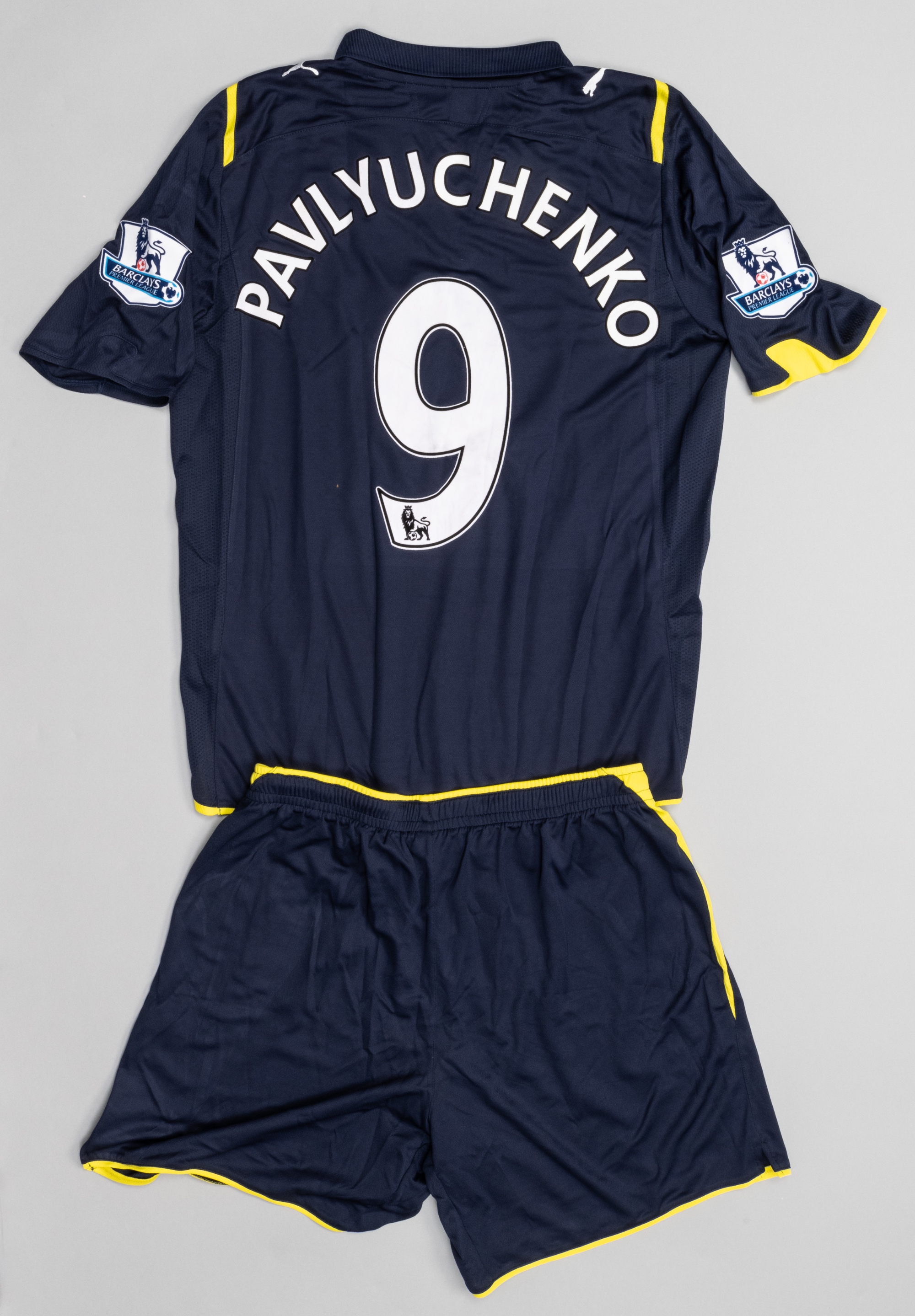 Roman Pavlyuchenko navy and yellow Tottenham Hotspur no.9 away jersey and shorts, season 2009-10, Puma, short-sleeved with BARCLAYS PREMIER LEAGUE sleeve badges, club crest and sponsor logo, reverse lettered PAVLYUCHENKO, size L, with matching navy and yellow shorts, with club crest and number 9, size label removed, (2)