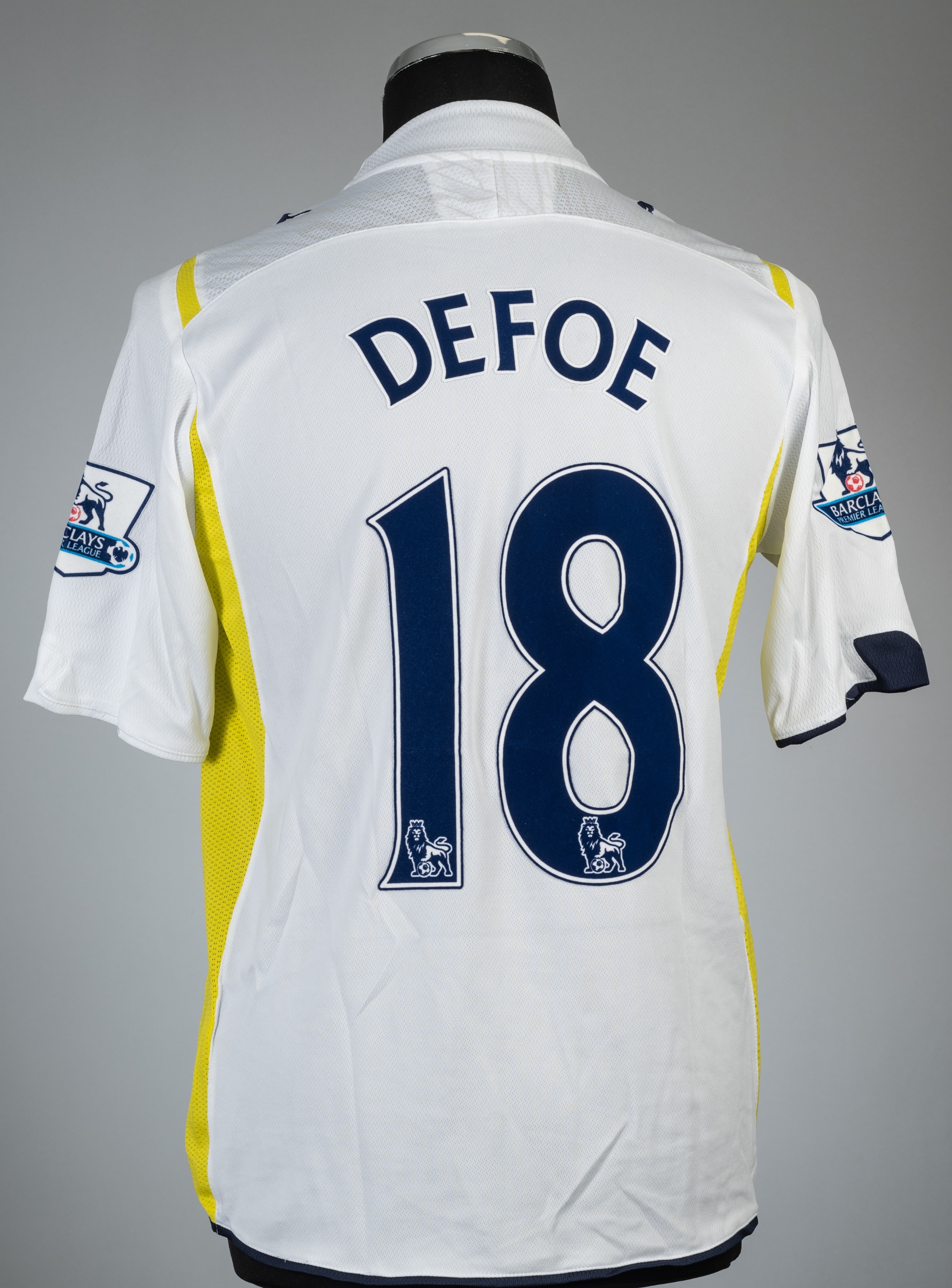Jermain Defoe white Tottenham Hotspur no.18 home jersey, season 2009-10, Puma, short-sleeved with BARCLAYS PREMIER LEAGUE sleeve badges, club crest and sponsor logo, reverse lettered DEFOE, size M