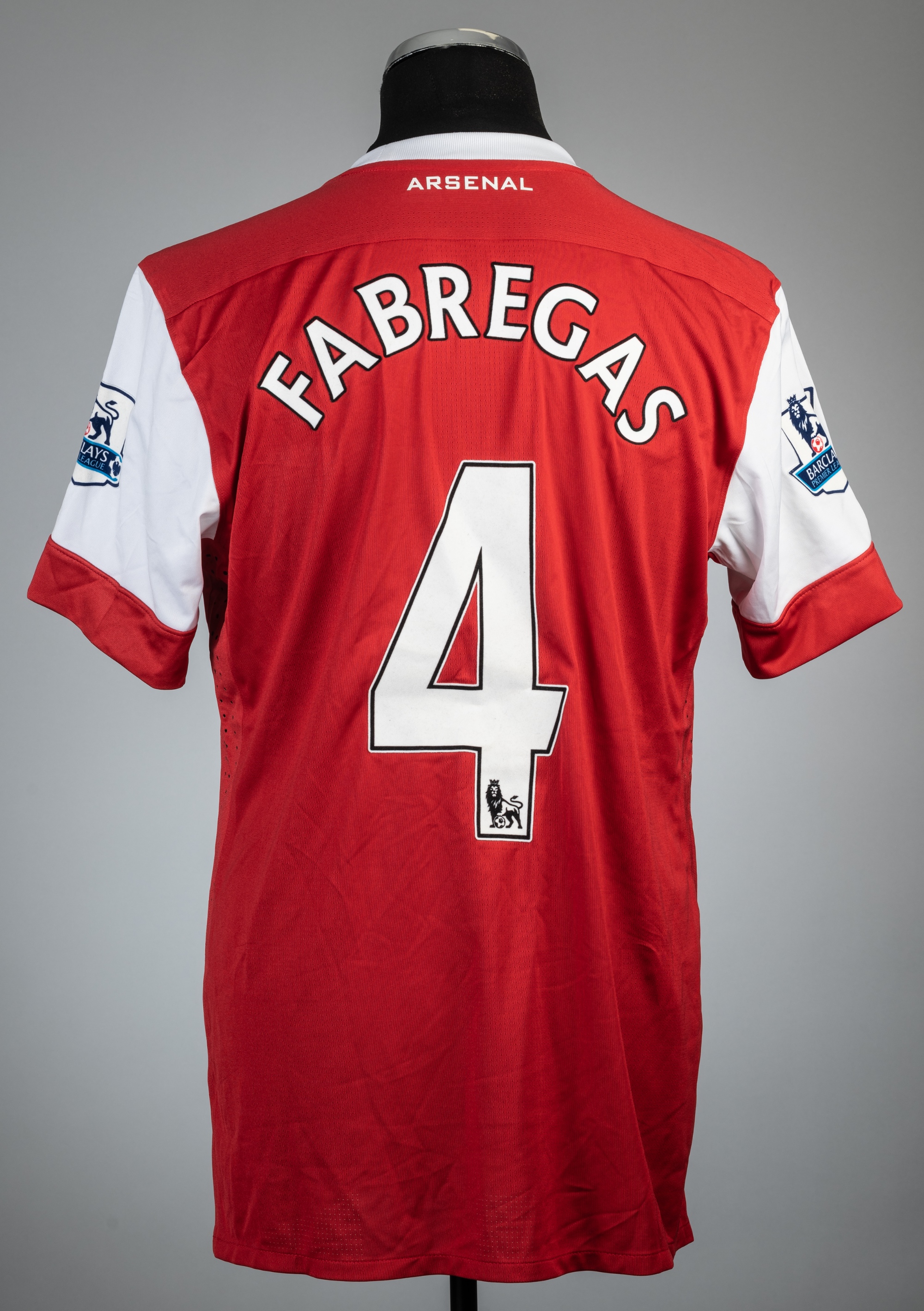Cesc Fabregas red Arsenal no.4 home jersey, season 2010-11, Nike, short-sleeved with BARCLAYS PREMIER LEAGUE sleeve badges, club crest, sponsor logo, reverse lettered FABREGAS, size L