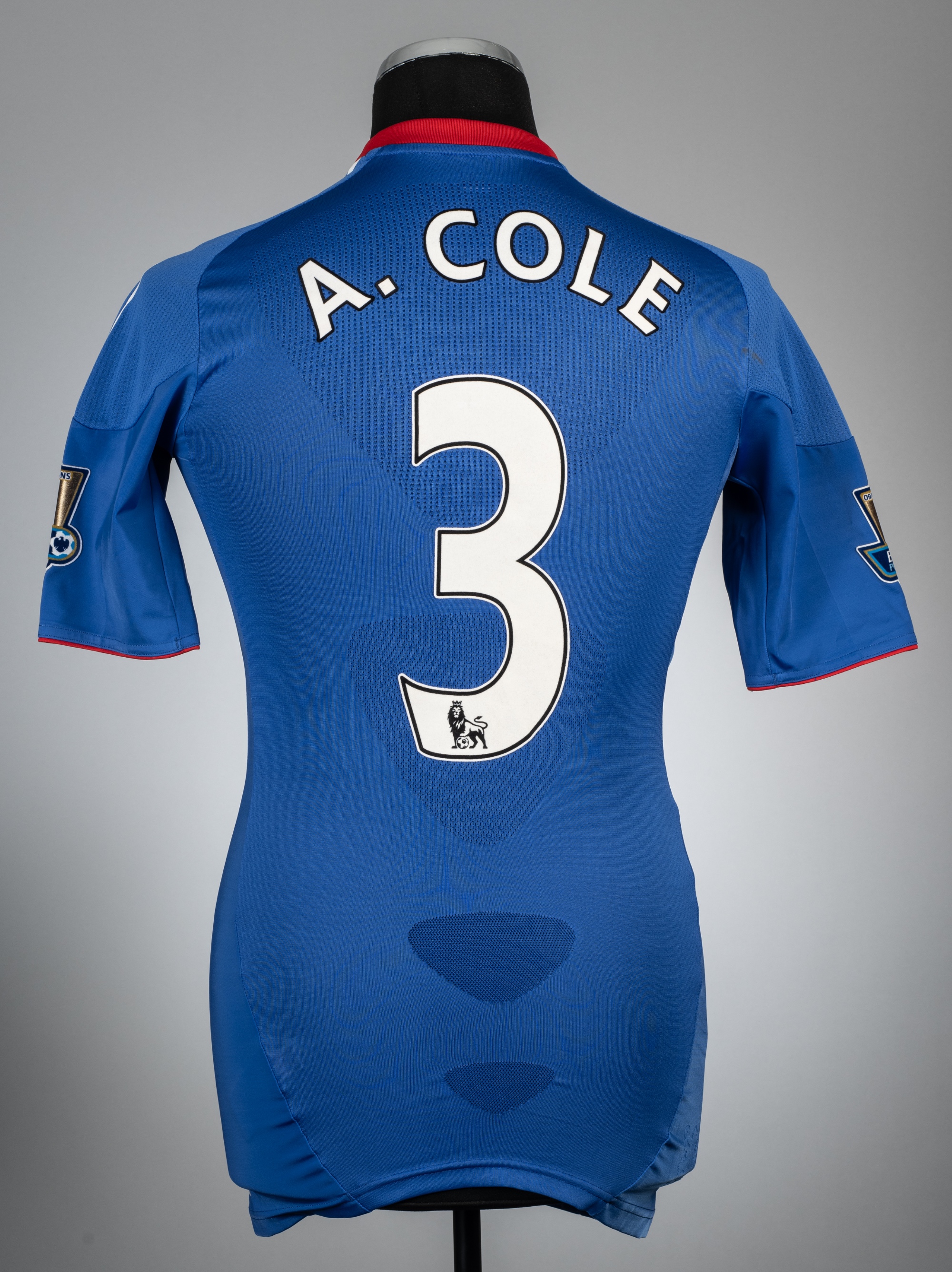 Ashley Cole blue Chelsea no.3 home jersey, season 2010-11, Adidas, player issued short-sleeved with BARCLAYS PREMIER LEAGUE 09/10 CHAMPIONS sleeve badges, club crest and sponsor logo, reverse lettered A. COLE, size S