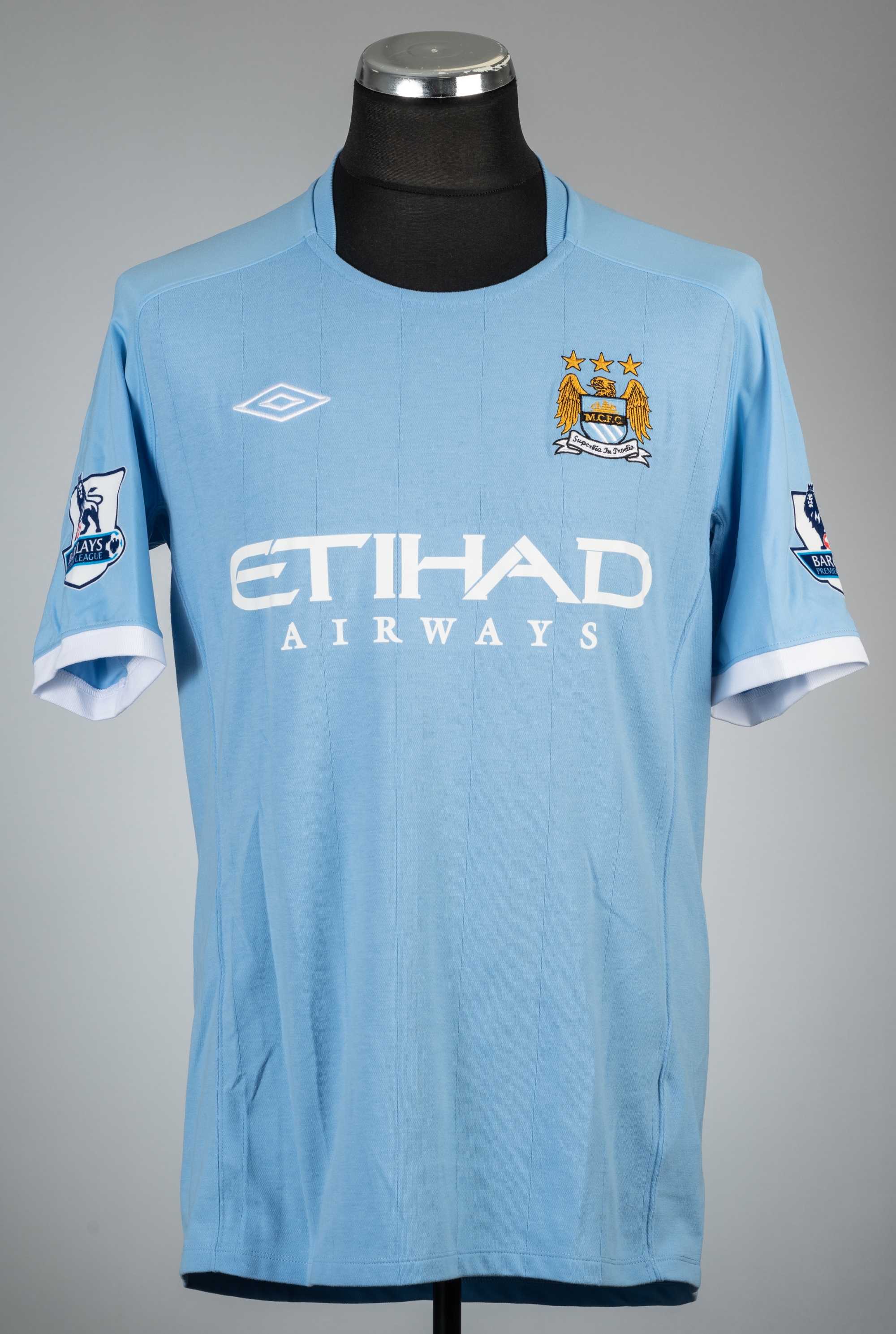 Gareth Barry blue Manchester City no.18 home jersey, season 2010-11, Umbro, short-sleeved with BARCLAYS PREMIER LEAGUE sleeve badges, club crest and sponsor logo, reverse lettered BARRY, size 42in.