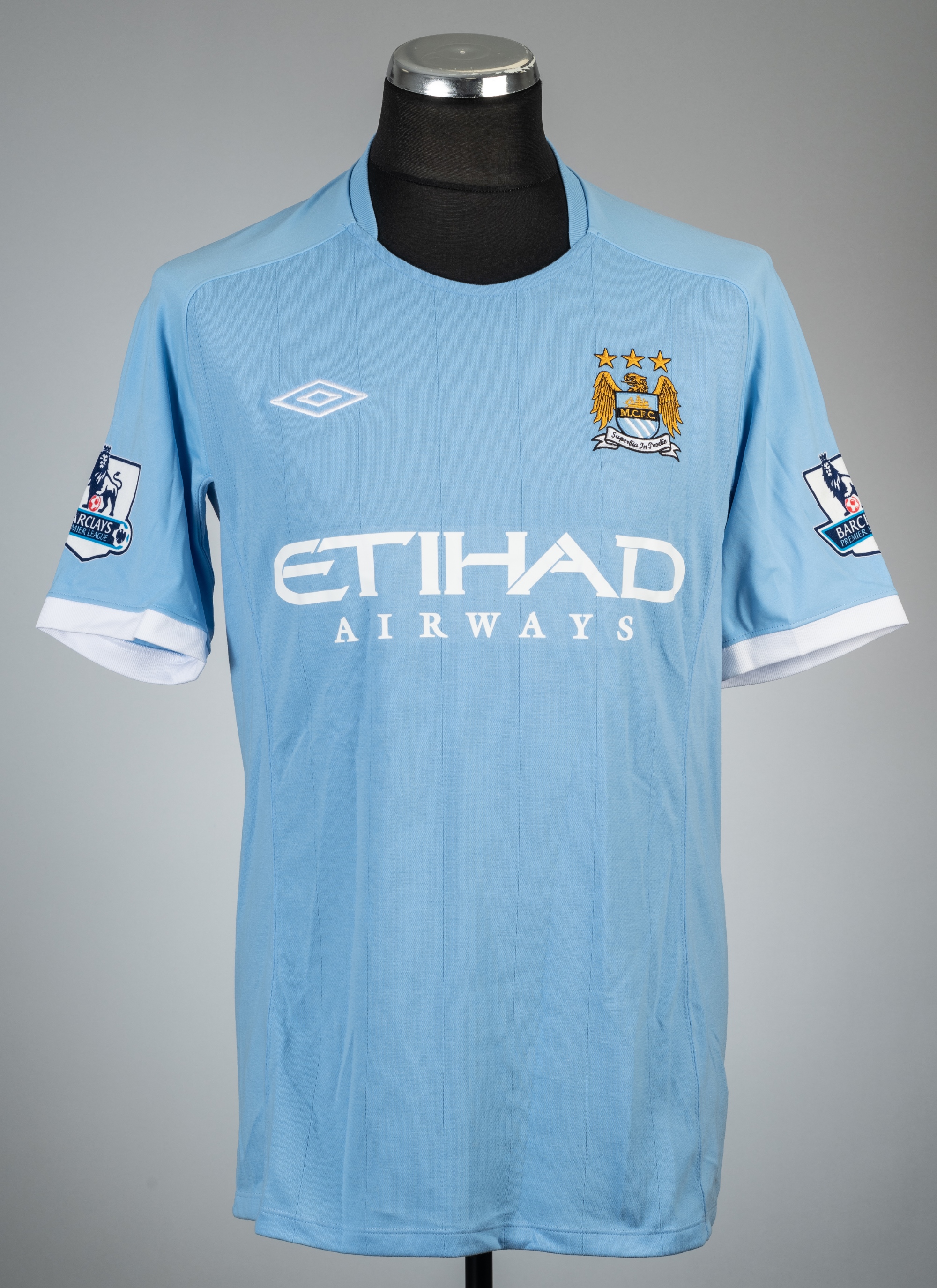 James Milner blue Manchester City no.7 home jersey, season 2010-11, Umbro, short-sleeved with BARCLAY PREMIER LEAGUE sleeve badges, club crest and sponsor logo, reverse lettered MILNER, size 40in.