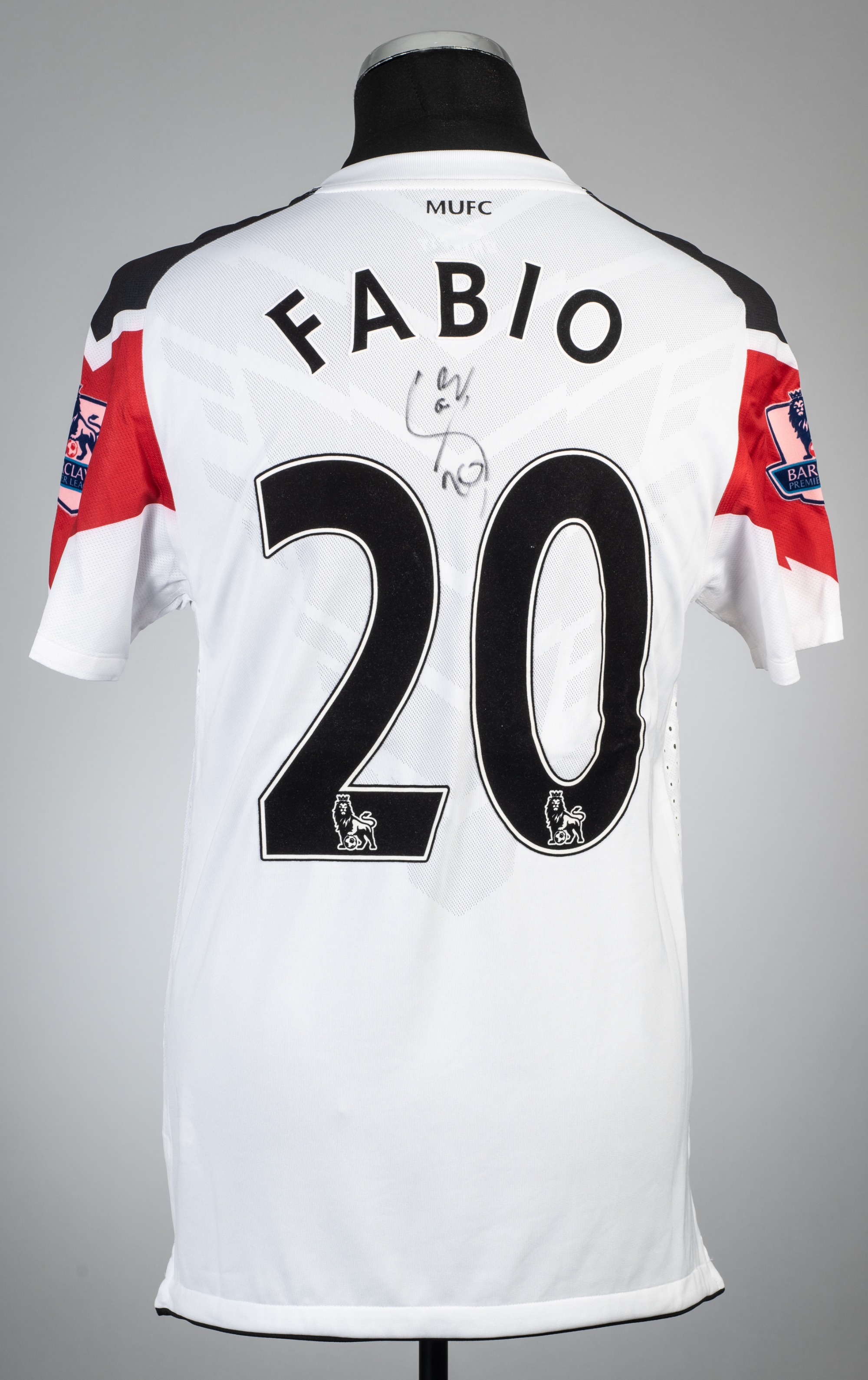 Fabio signed white Manchester United Poppy no.20 away jersey, season 2010-11, Nike, short-sleeved with BARCLAYS PREMIER LEAGUE sleeve badges, club crest and sponsor logo, reverse lettered FABIO, signed in black marker pen on reverse, size M, with Manchester United COA numbered 017584 on coa and inner jersey label, sleeve badges have red colour run through the badge