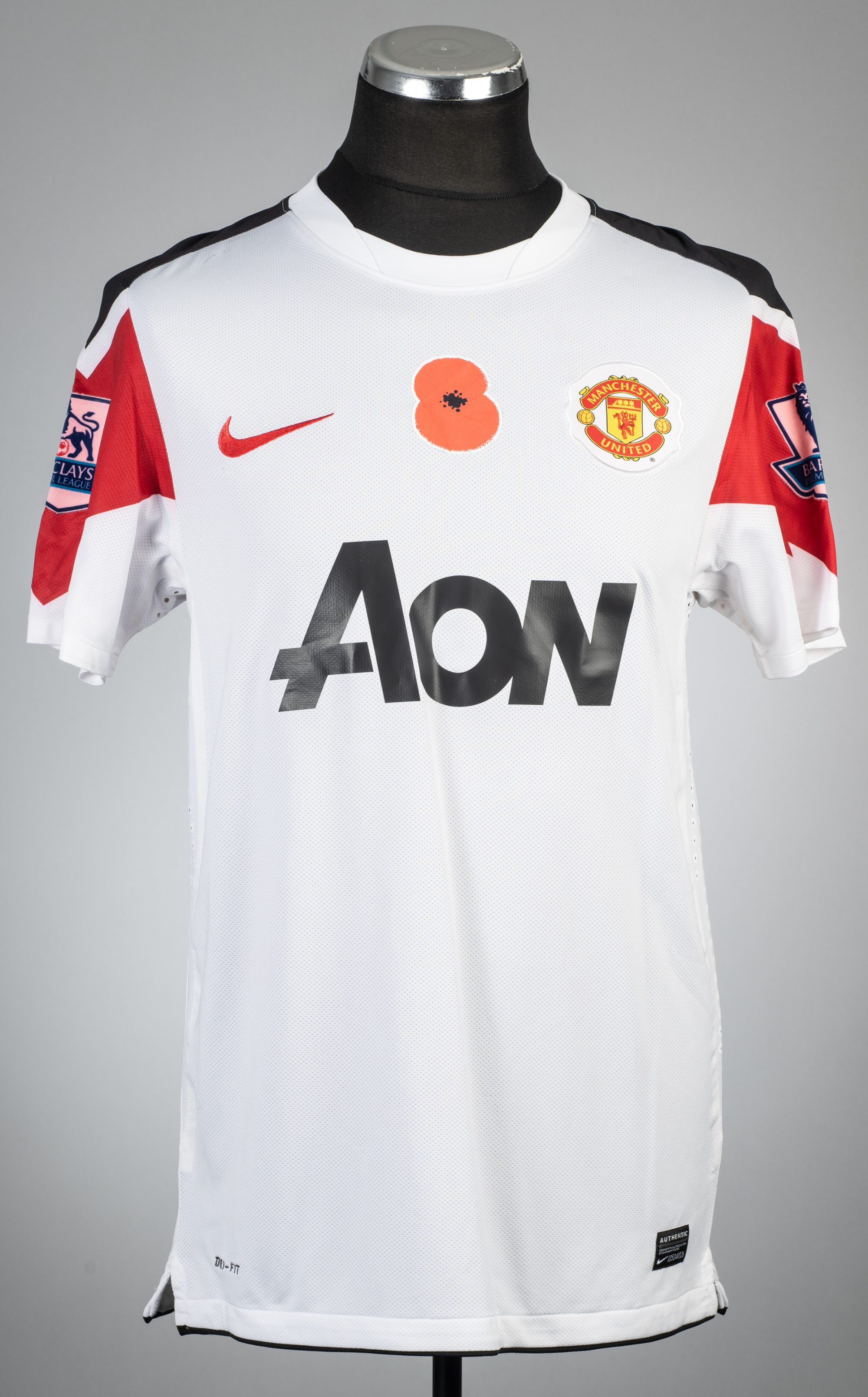 Fabio signed white Manchester United Poppy no.20 away jersey, season 2010-11, Nike, short-sleeved with BARCLAYS PREMIER LEAGUE sleeve badges, club cr