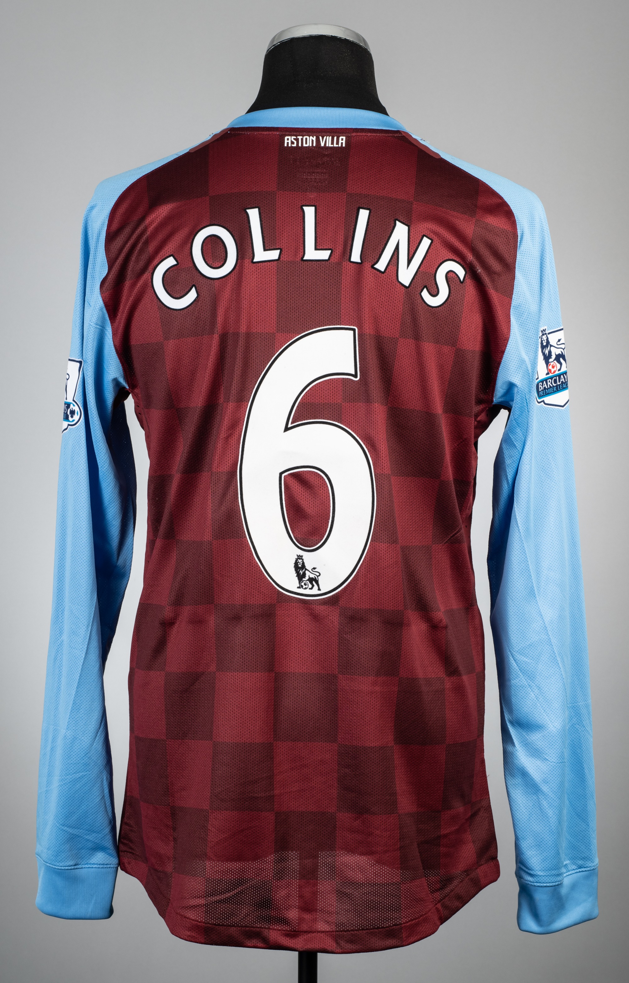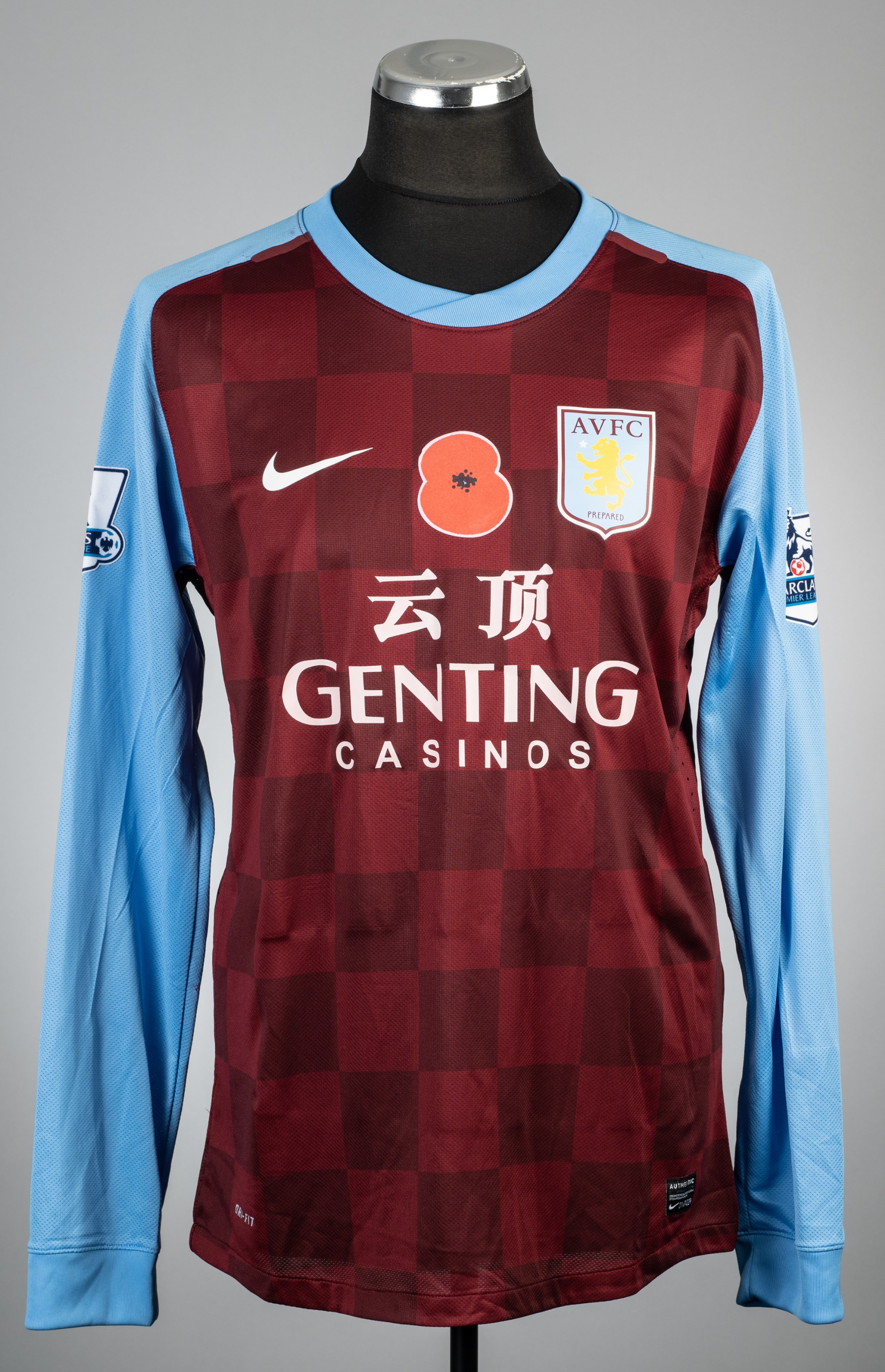 James Collins claret and blue Aston Villa Poppy no.6 home jersey v Norwich City, played at Villa Park, 5th November 2011, Nike, long-sleeved with BAR