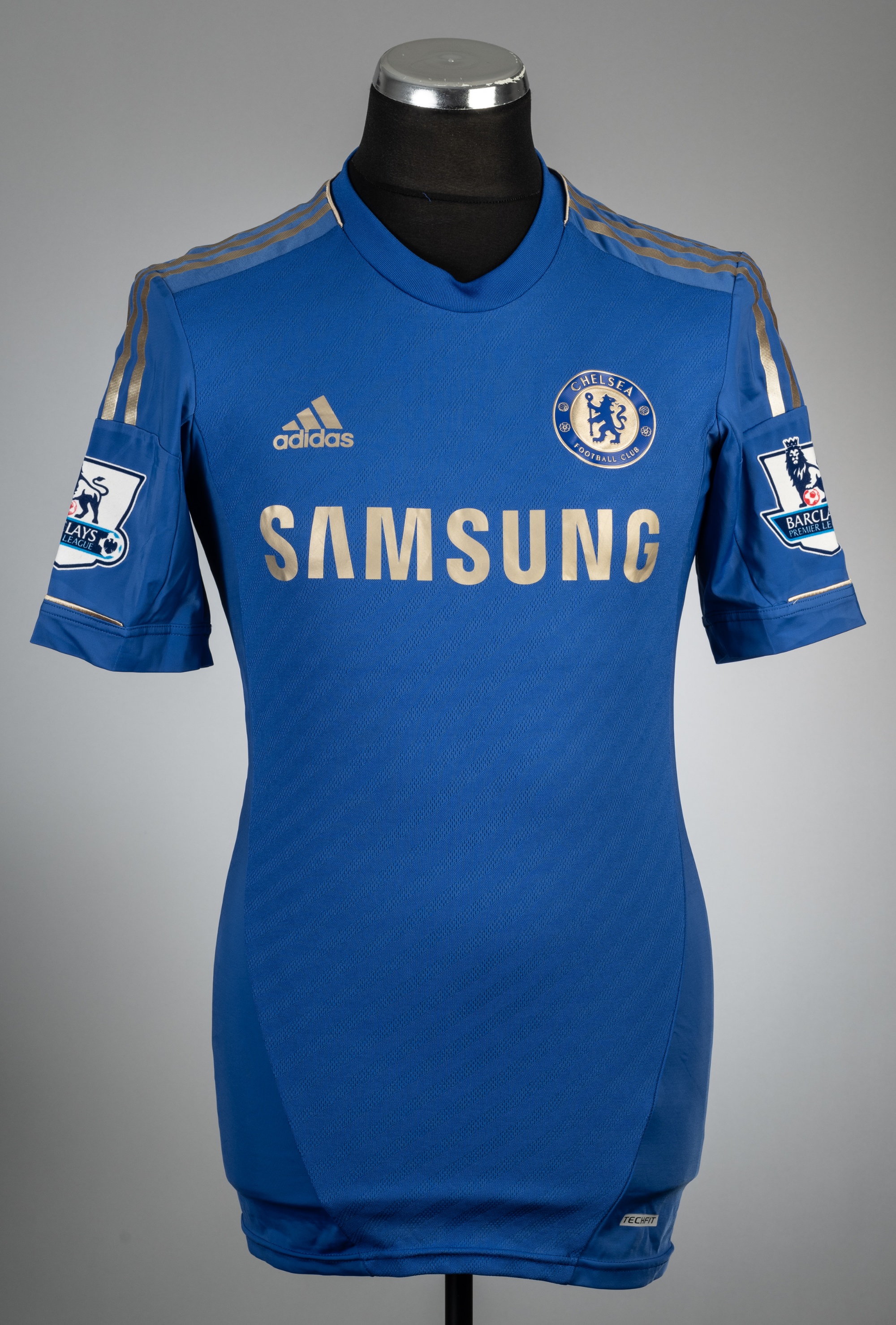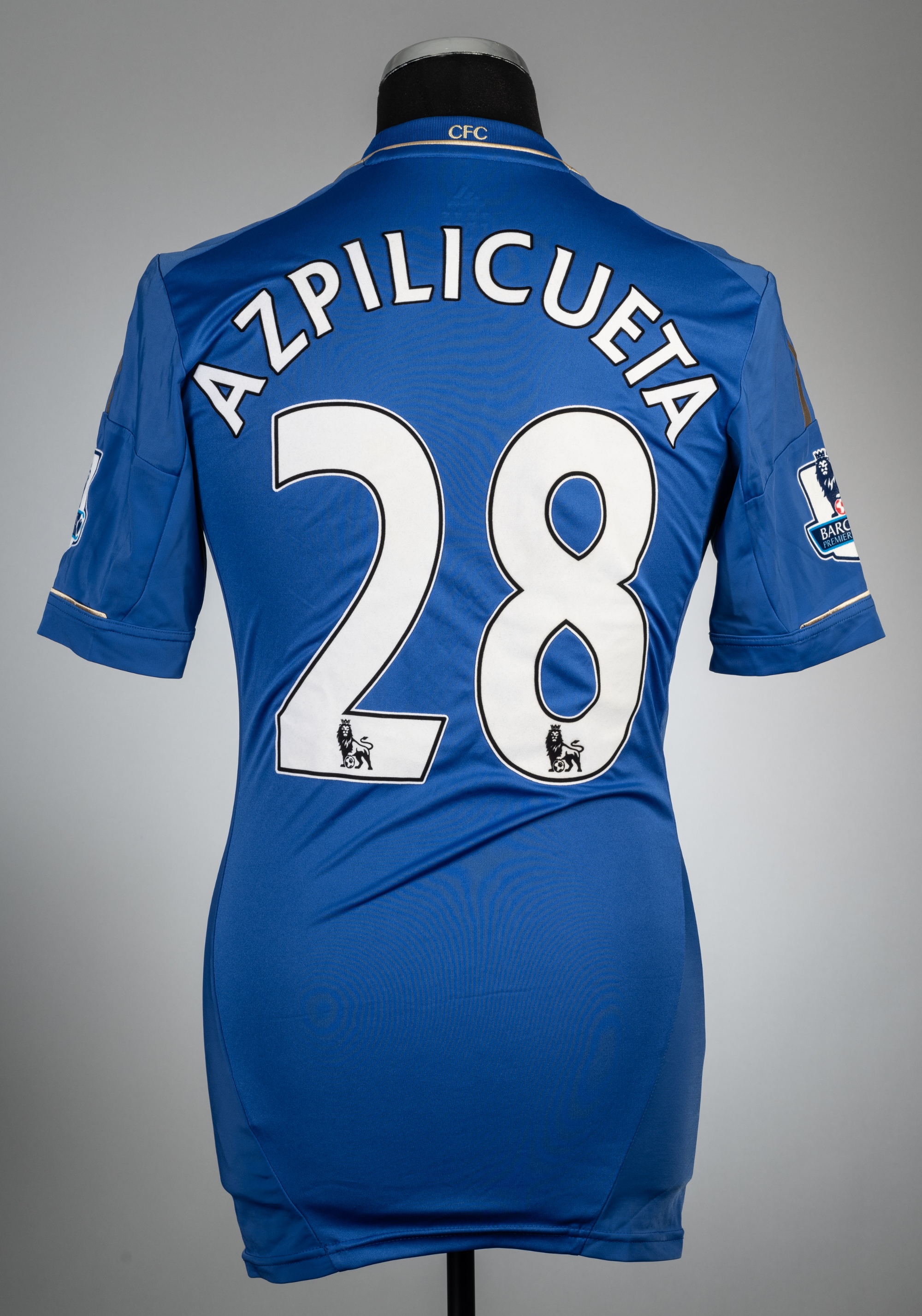 Cesar Azpilicueta blue Chelsea no.28 home jersey, season 2012-13, Adidas, player issued short-sleeved with BARCLAYS PREMIER LEAGUE sleeve badges, club crest and sponsor logo, CFC on reverse of blue collar, reverse lettered AZPILICUETA, size 7 UK