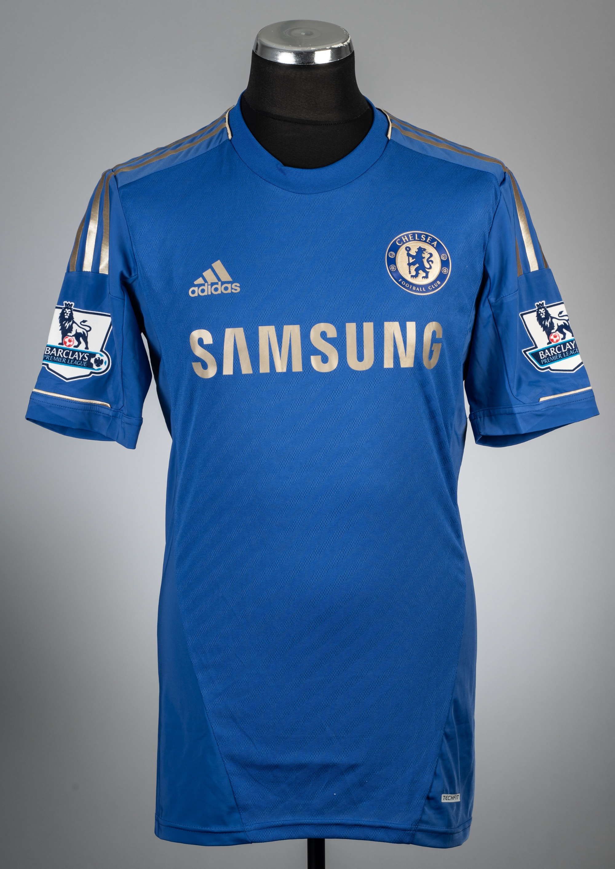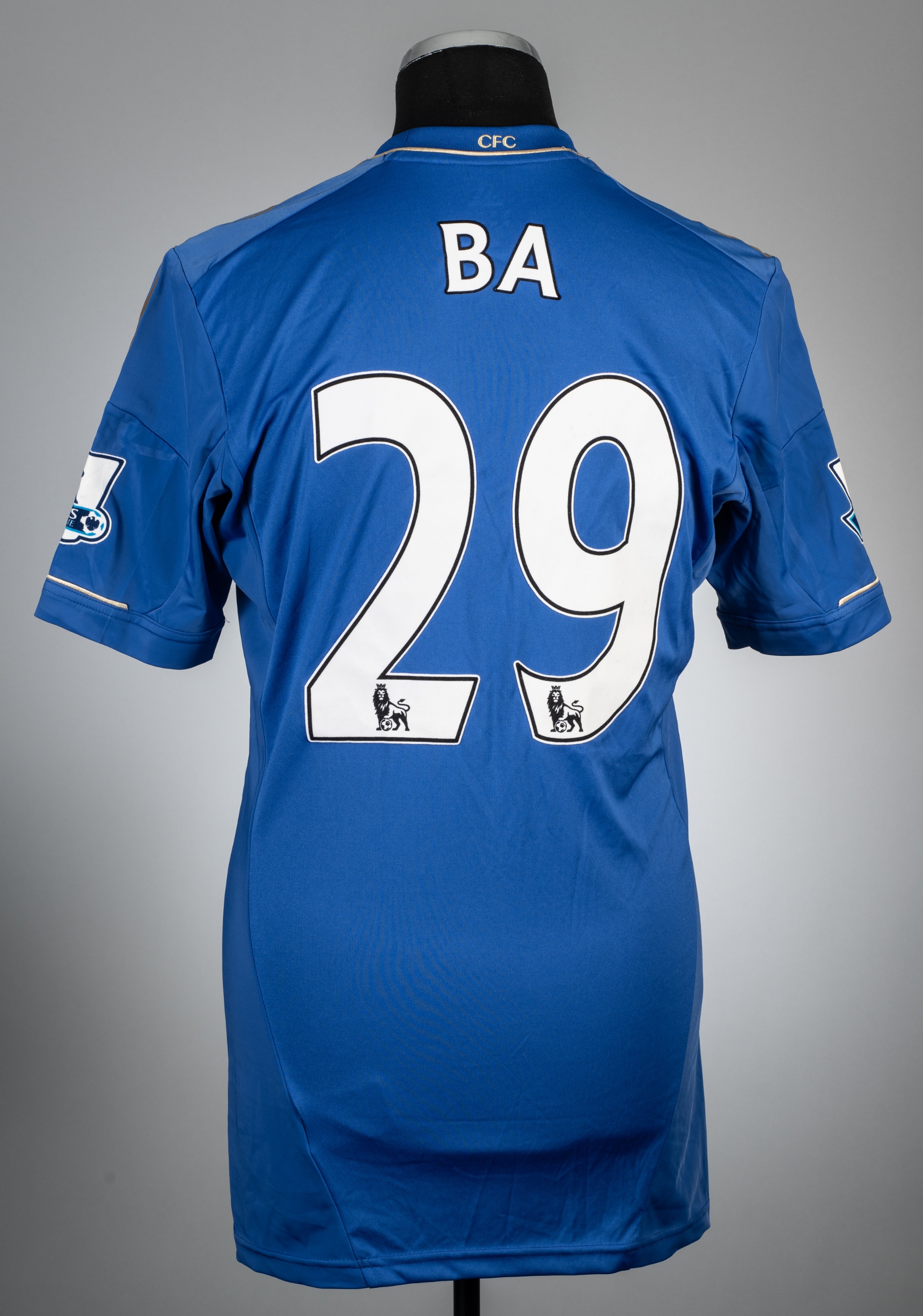 Demba Ba blue Chelsea no.29 home jersey, season 2012-13, Adidas, player issued short-sleeved with BARCLAYS PREMIER LEAGUE sleeve badges, club crest and sponsor logo, CFC embroidered on back of collar, reverse lettered BA, size 9 UK