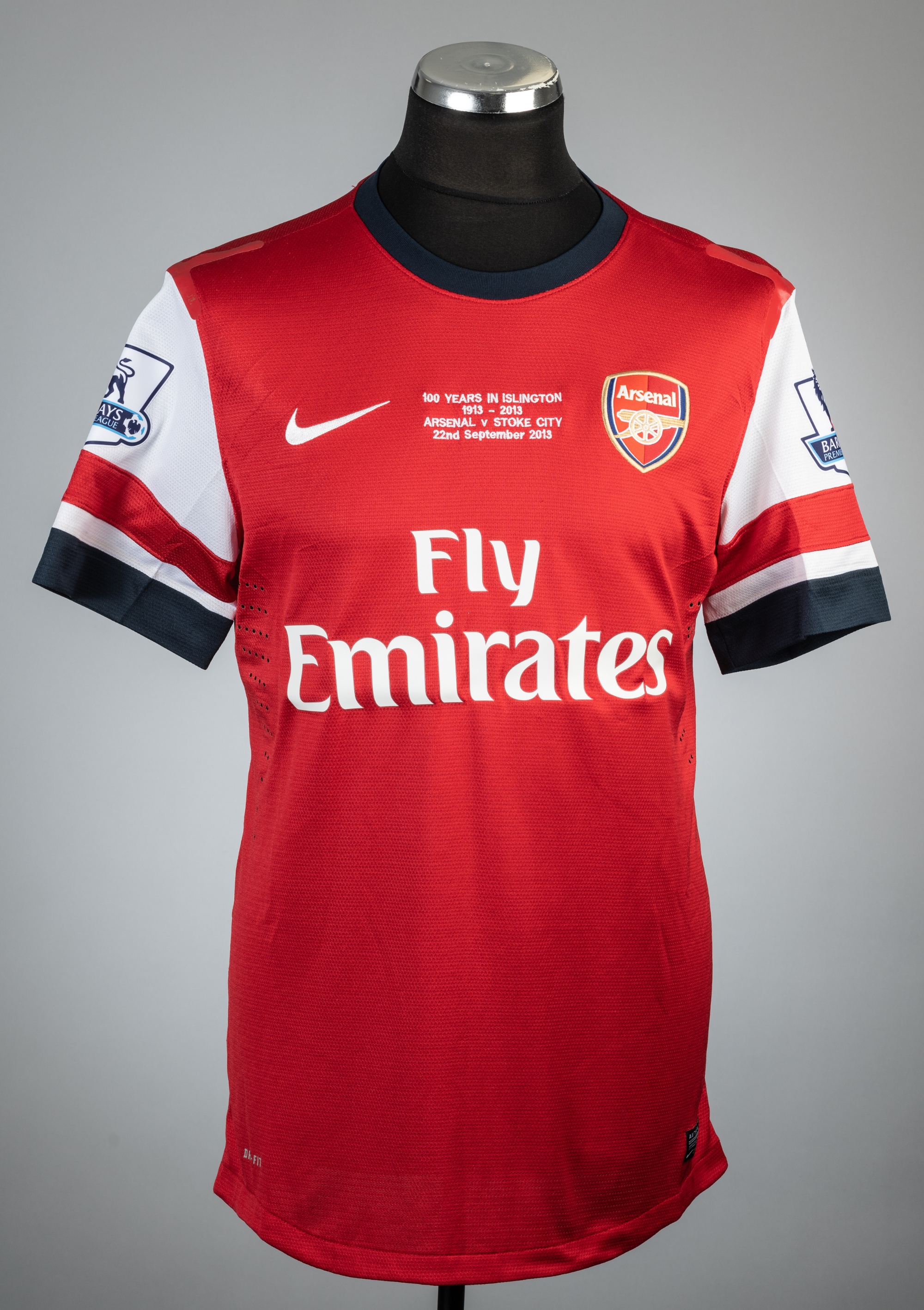 Mesut Ozil red Arsenal no.11 jersey v Stoke City, commemorating 100 years of Arsenal in Islington, played at Emirates Stadium, 22nd September 2013, Nike, short-sleeved with BARCLAYS PREMIER LEAGUE sleeve badges, club crest, embroidered 100 YEARS IN ISLINGTON 1913-2013, ARSENAL V STOKE CITY 22ND SEPTEMBER 2013, sponsor logo, reverse lettered OZIL, size L, bears slight thread pulls/holes on reverse, rubber shoulder seams slightly tacky Arsenal defeated Stoke City 3-1.