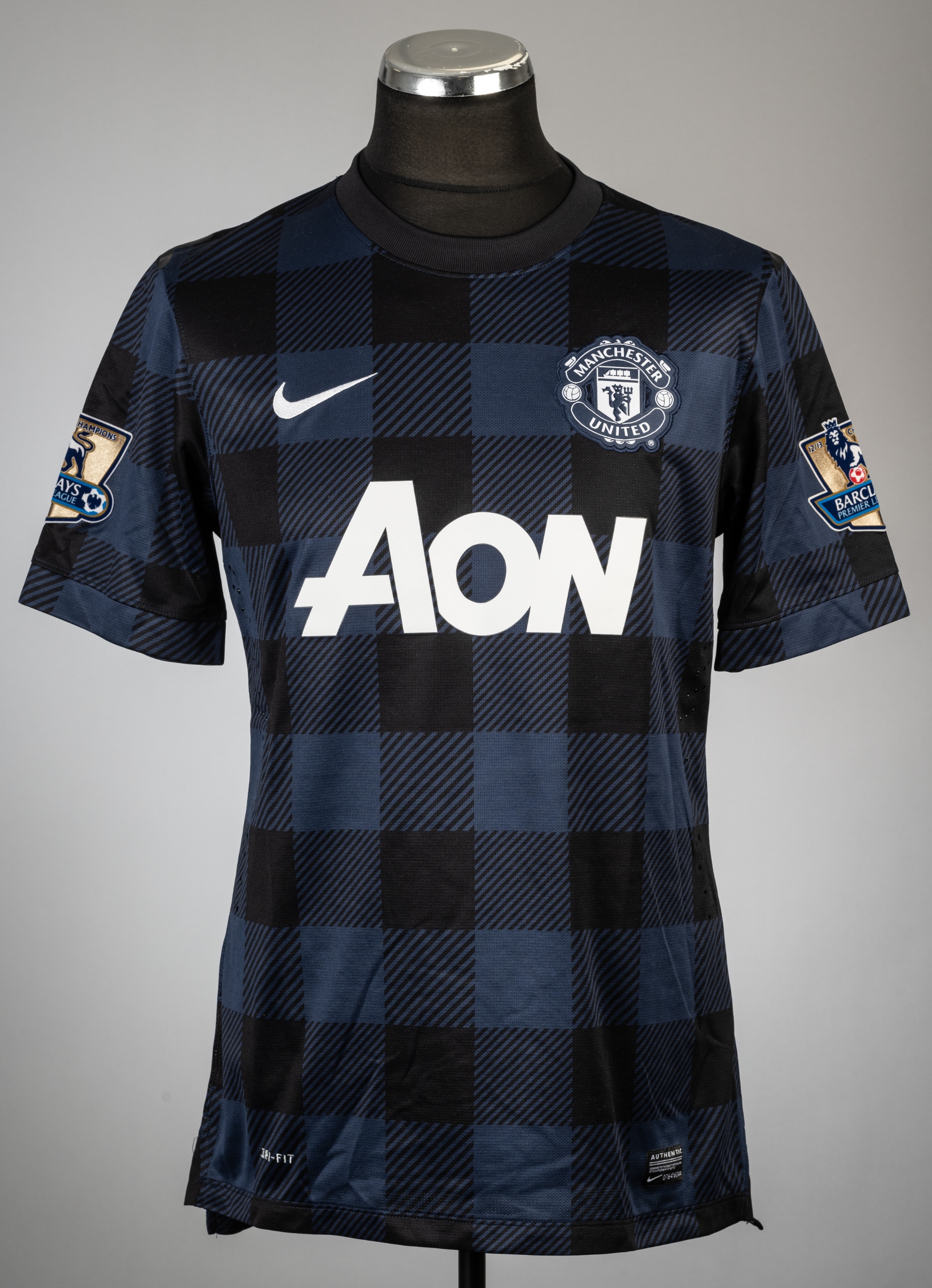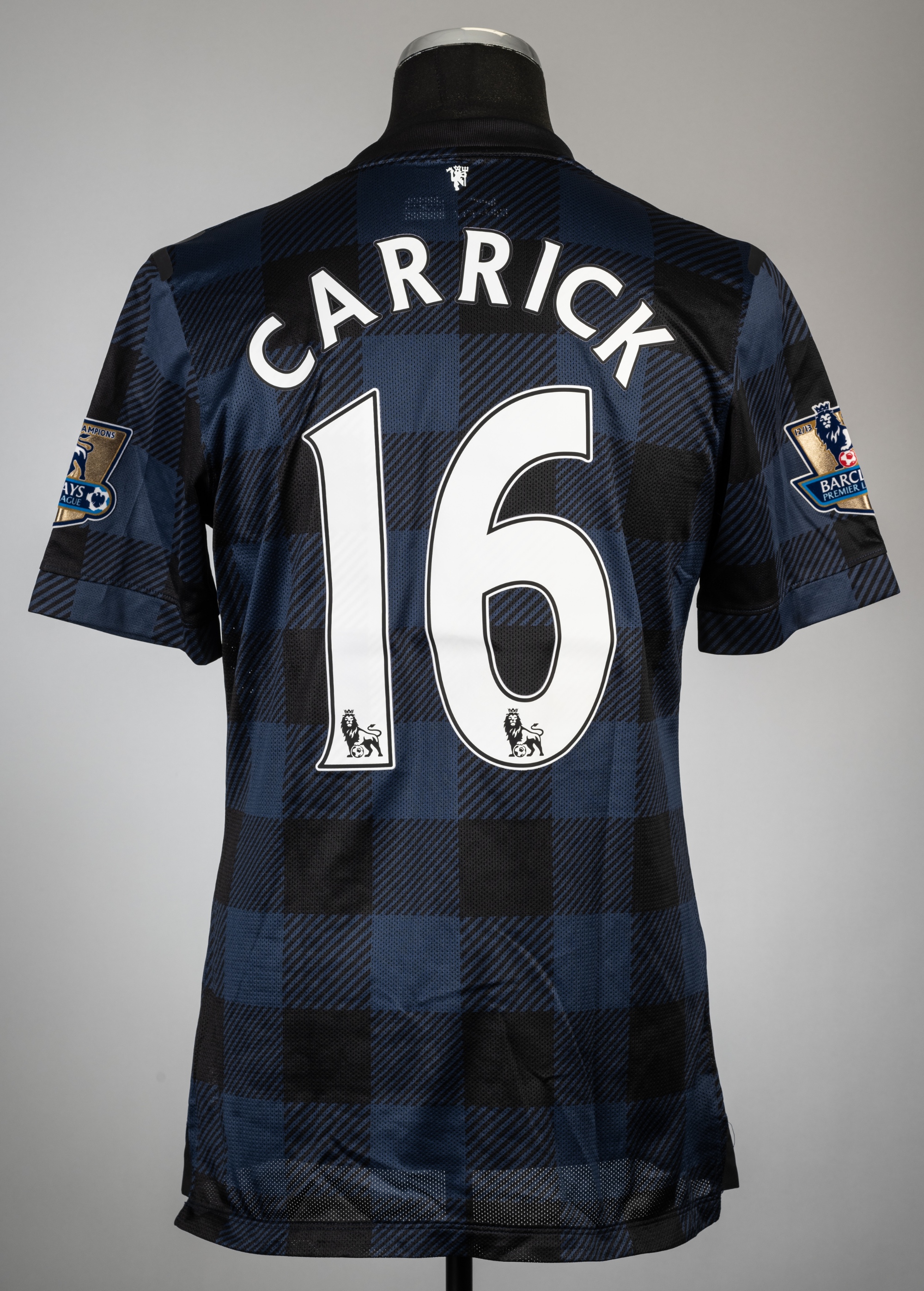 Michael Carrick navy and black chequered Manchester United no.16 away jersey, season 2013-14, Nike, short-sleeved with BARCLAYS PREMIER LEAGUE 12/13 CHAMPIONS gold sleeve badges, club crest and sponsor logo, reverse lettered CARRICK, size L