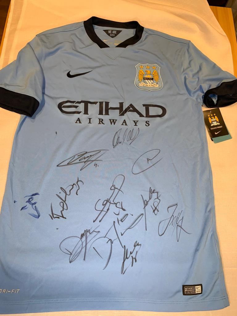 Team-signed blue Manchester City replica jersey 2014-15, Nike, short-sleeved with club crest and sponsor logo, signed on front in marker pen, with retail tag and COA and photo proof