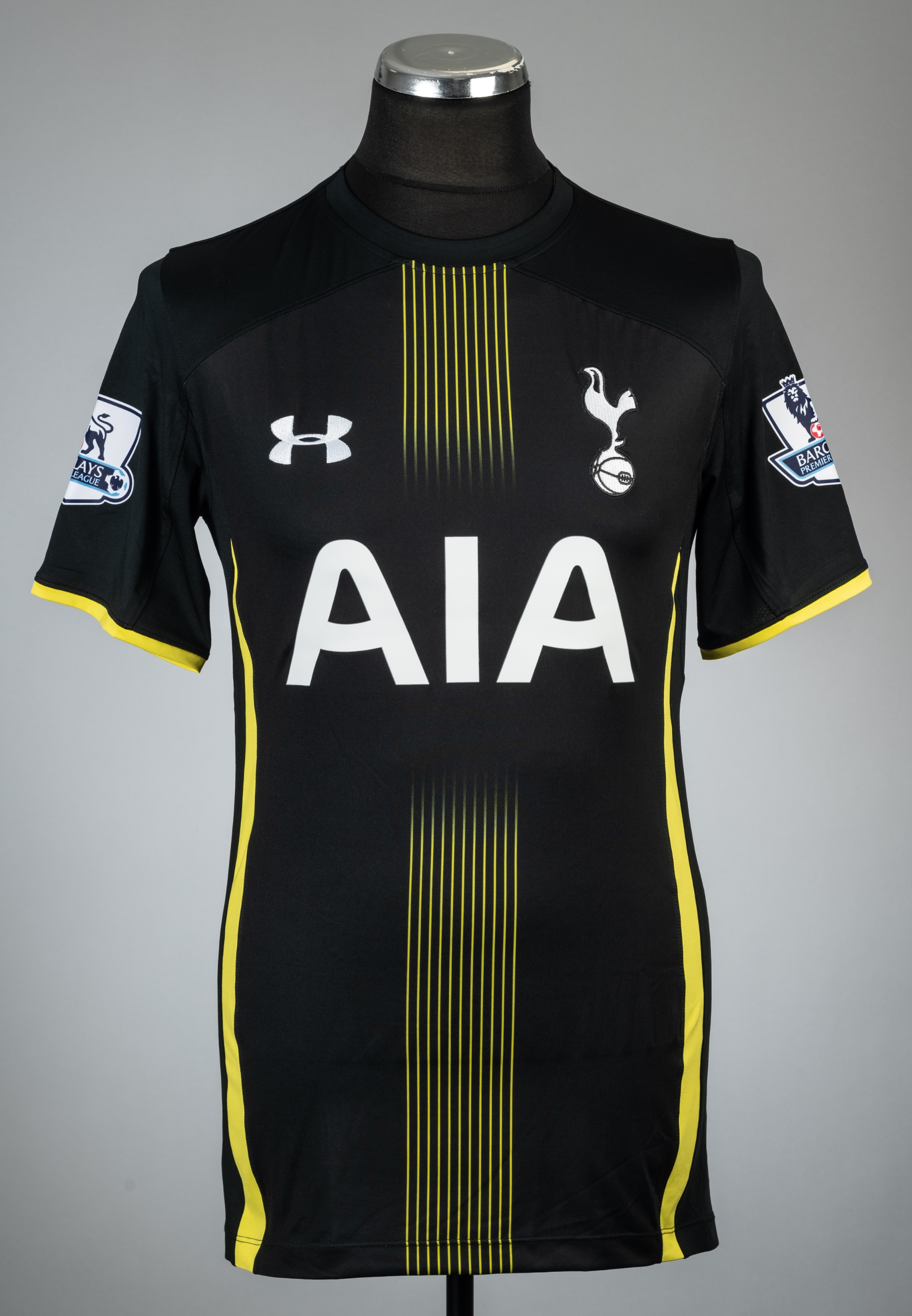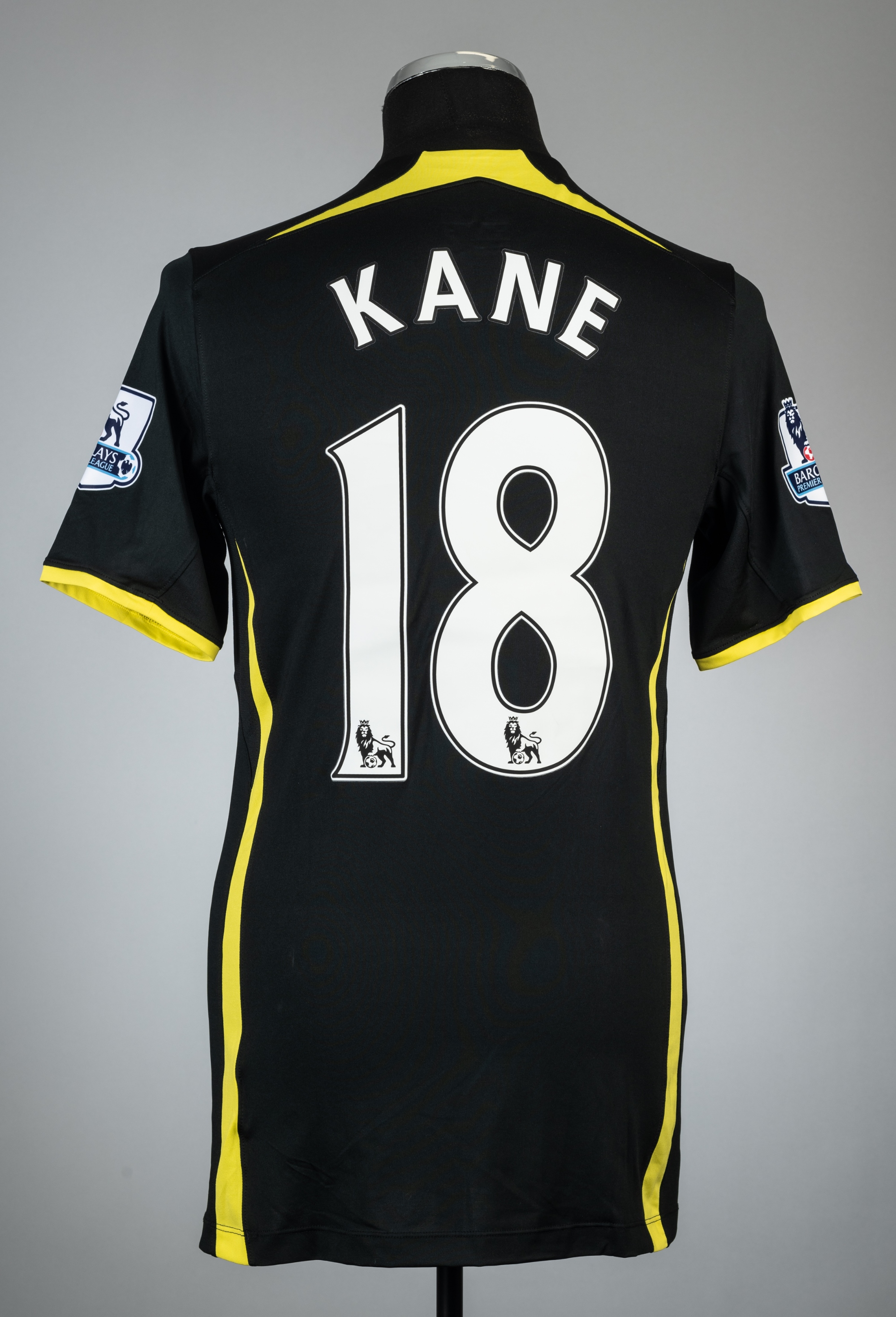 Harry Kane black Tottenham Hotspur no.18 away jersey, season 2014-15, Under Armour, short-sleeved, with BARCLAYS PREMIER LEAGUE sleeve badges, club crest and sponsor logo, reverse lettered KANE, size M This away jersey was only used during three fixtures during this season v Manchester City, v Swansea and v Queen's Park Rangers.