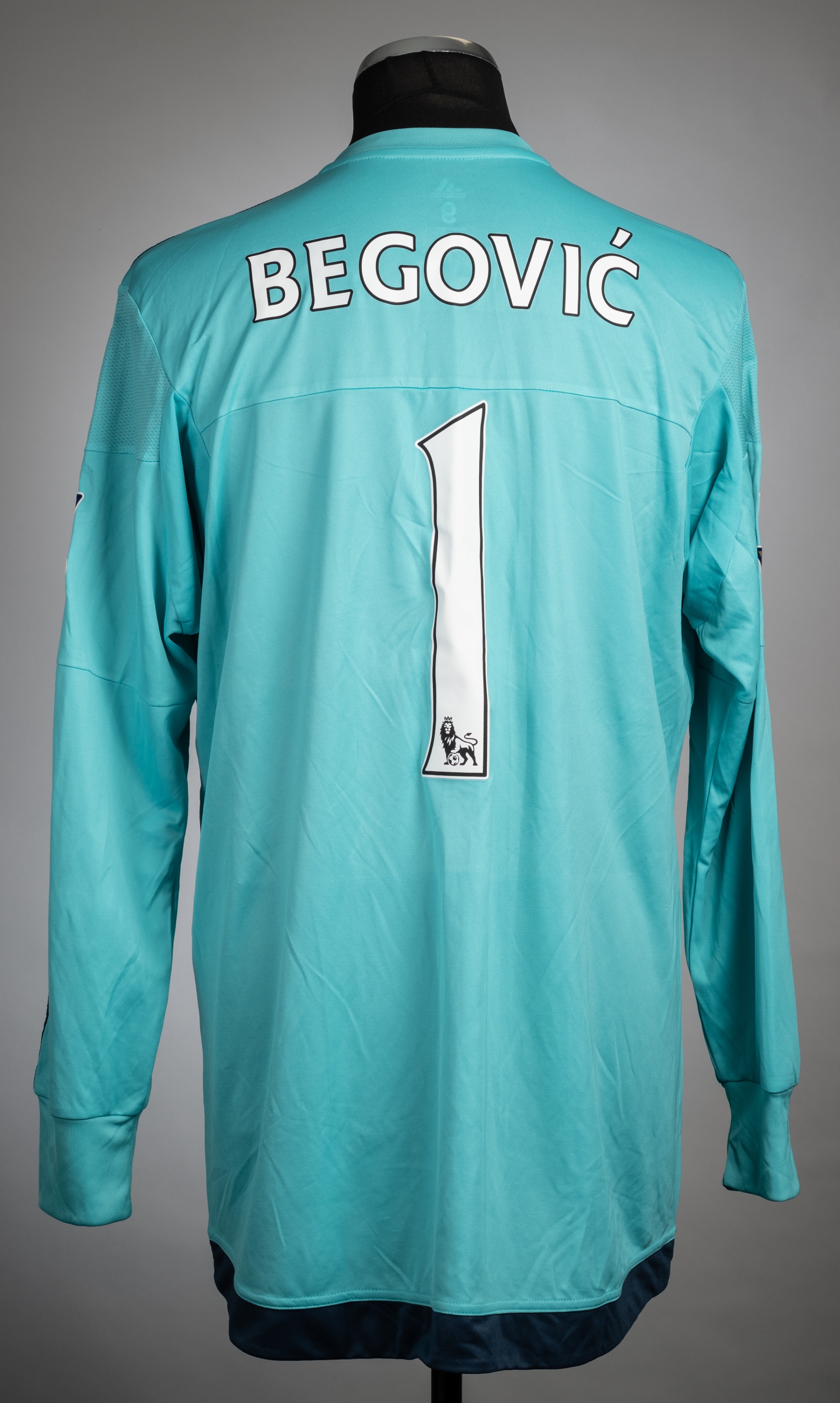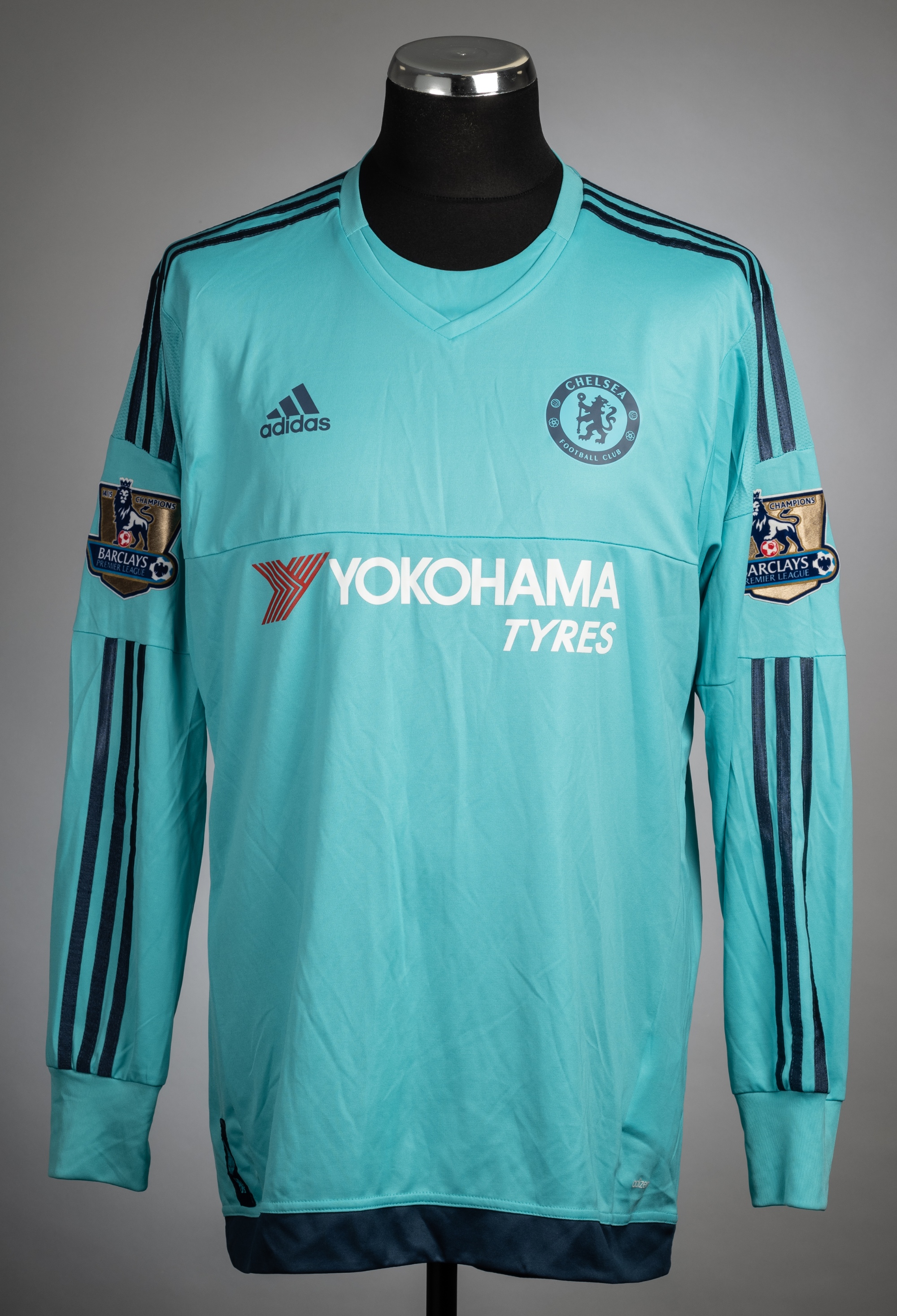 Asmir Begovic vivid mint Chelsea no.1 goalkeeper's home jersey, season 2015-16, Adidas, long-sleeve with BARCLAYS PREMIER LEAGUE 14/15 CHAMPIONS sleeve badges, club crest and sponsor logo, reverse lettered BEGOVIC Asmir Begovic played with Chelsea during 2015-17 making 19 appearances.